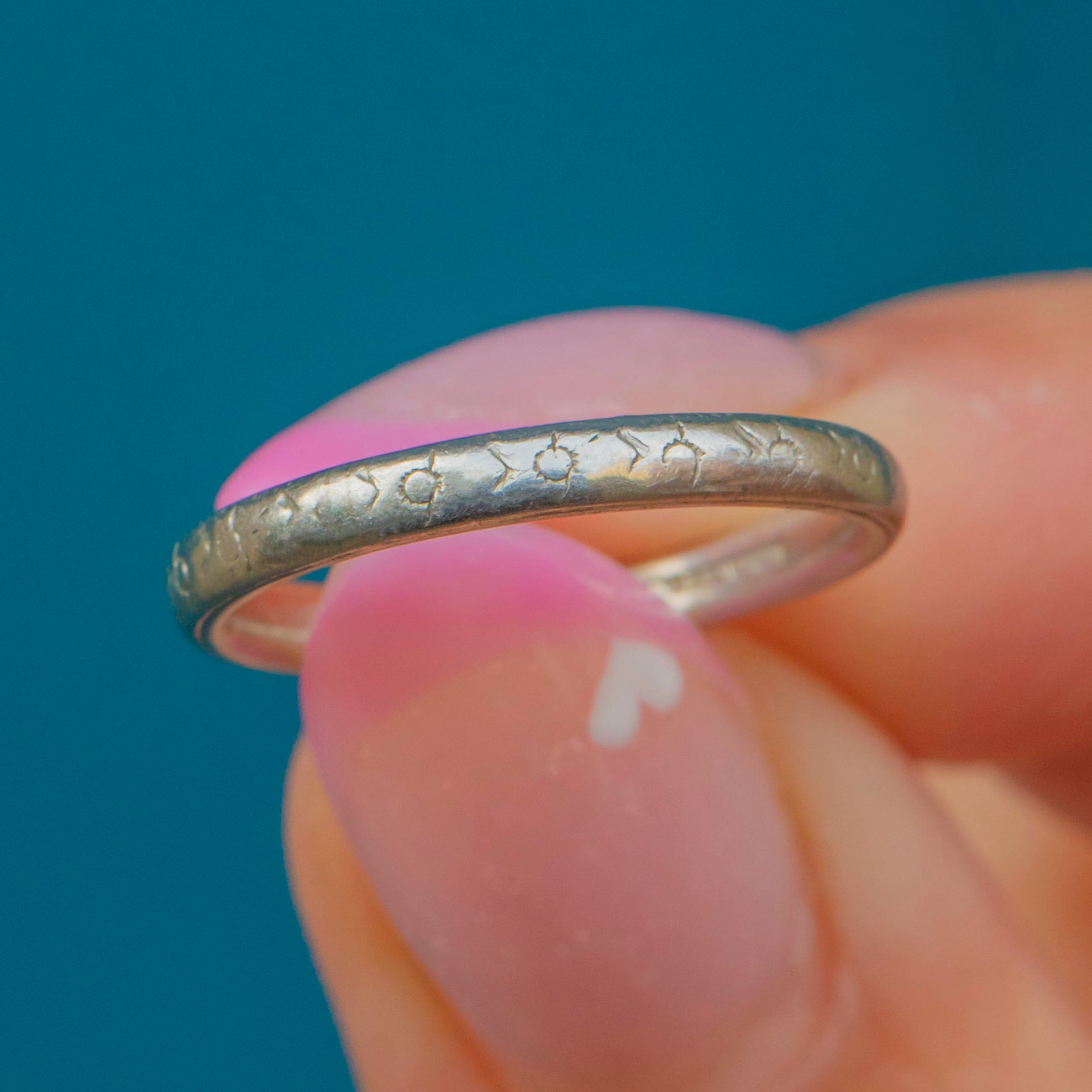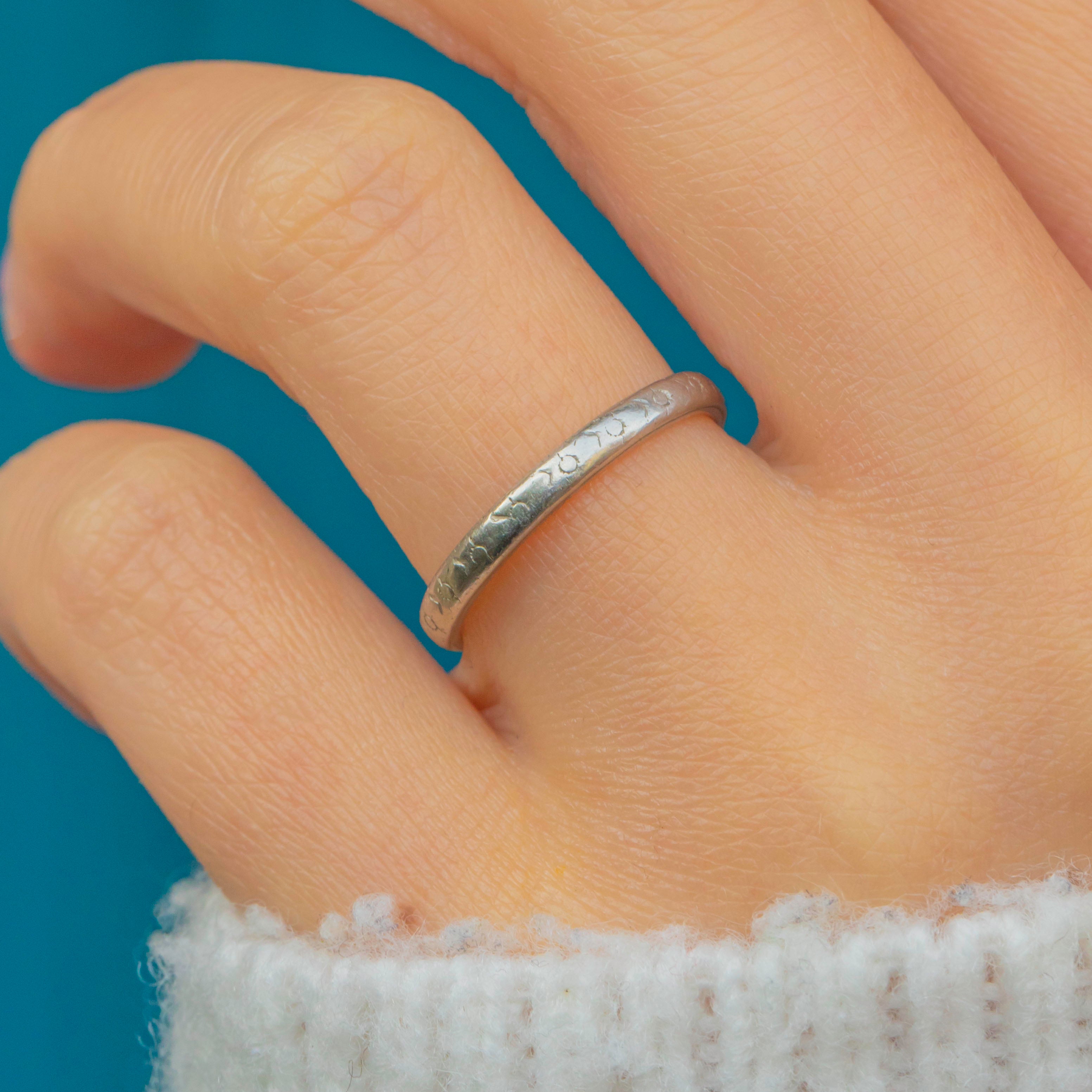 Certain to last for a lifetime to come, this beautiful 1920's wedding band has a slender width and features a subtle engraved design throughout. The perfect choice for a wedding band!