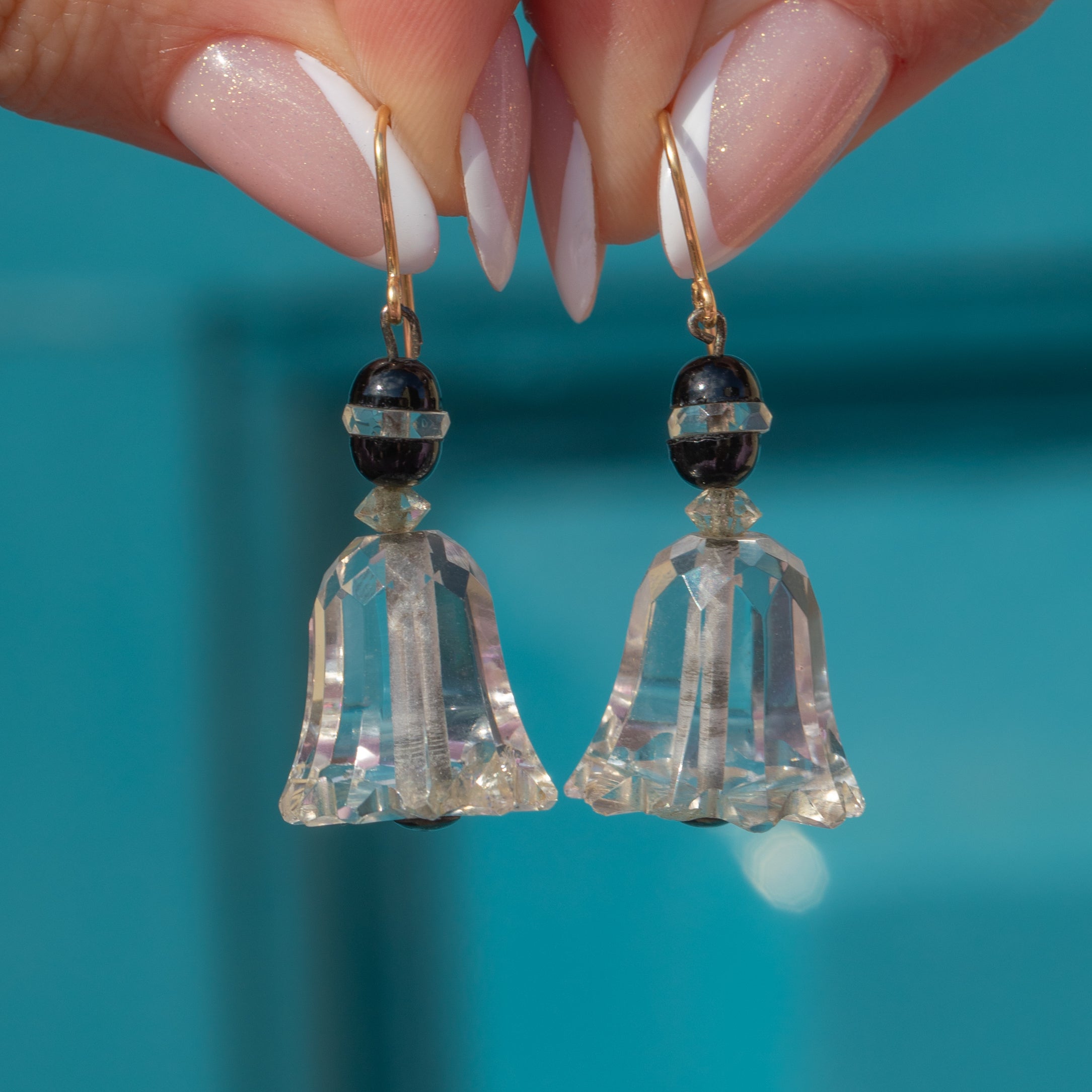 These Art Deco Rock Crystal bell drop earrings will make a statement adorning your lobes! Each earring displays skilfully hand-cut Rock Crystals and contrasting Onyx, uniquely formed into bell shapes making them a standout pair.