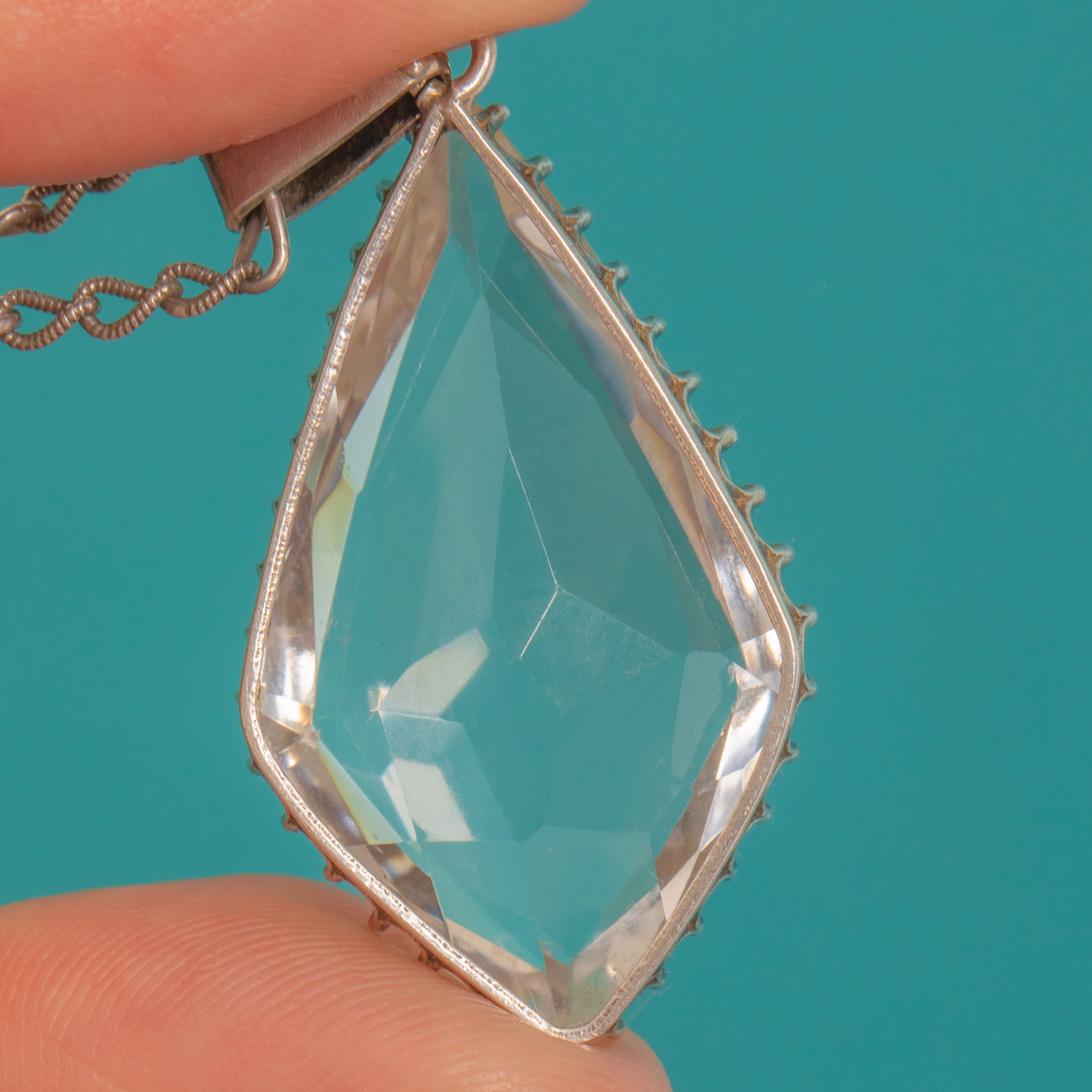 VERY GOOD: The Rock Crystal is bright with minor edge and facet abrasions commensurate with age, presenting lively sparkle. The Sterling Silver setting is secure with even teeth and a gentle antique patina; the chain and clasp are in good order with light surface wear from use. No visible repairs.
