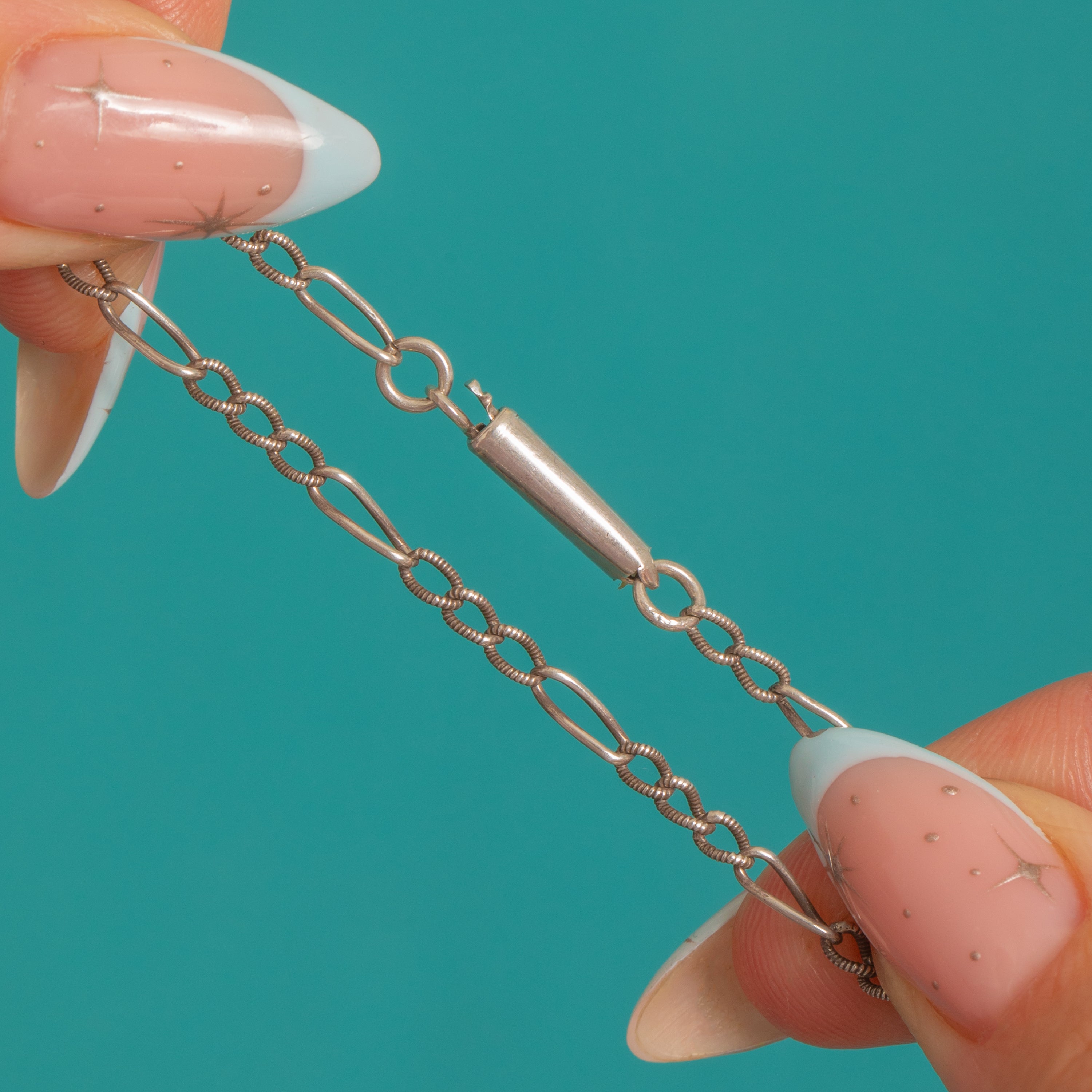 Suspended from a textured Figaro chain with its original barrel clasp, this necklace fuses crisp Deco minimalism with a quietly antique sensibility. Effortless to style and beautifully reflective, it’s a statement of cool clarity that feels refined and timeless.