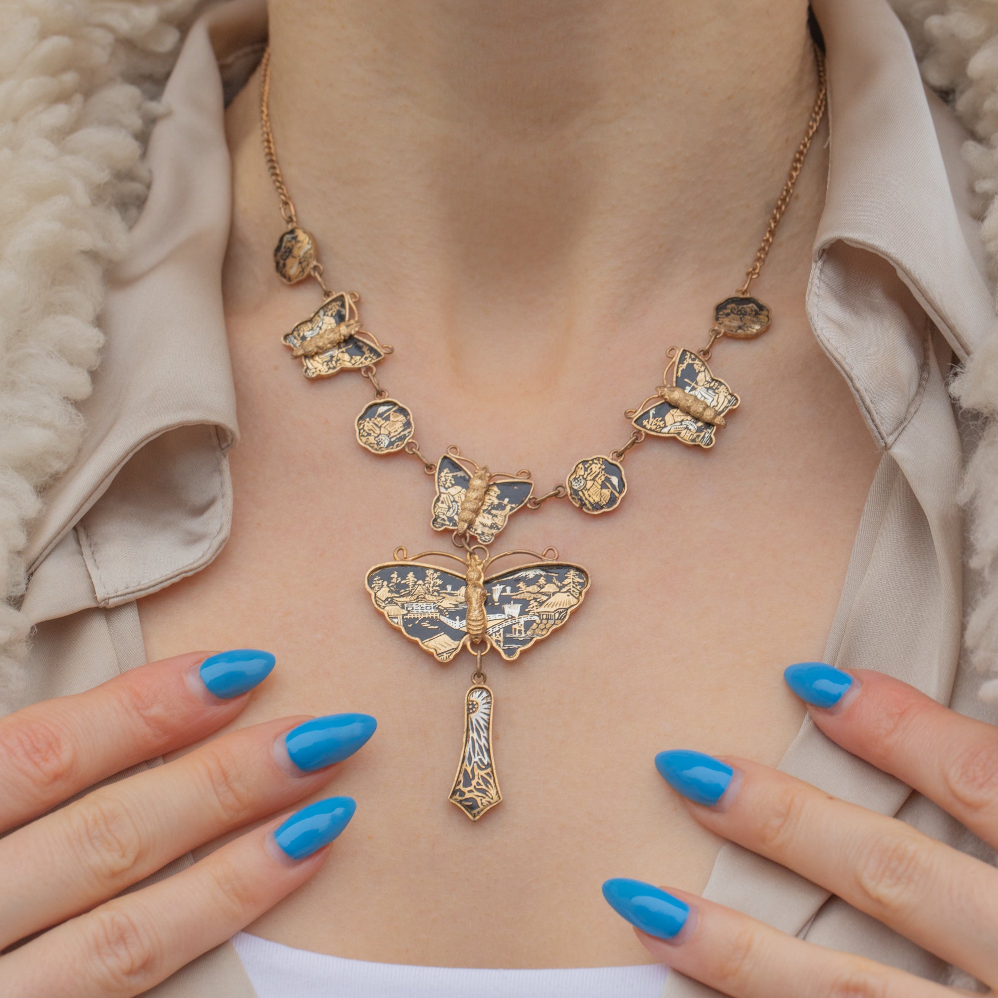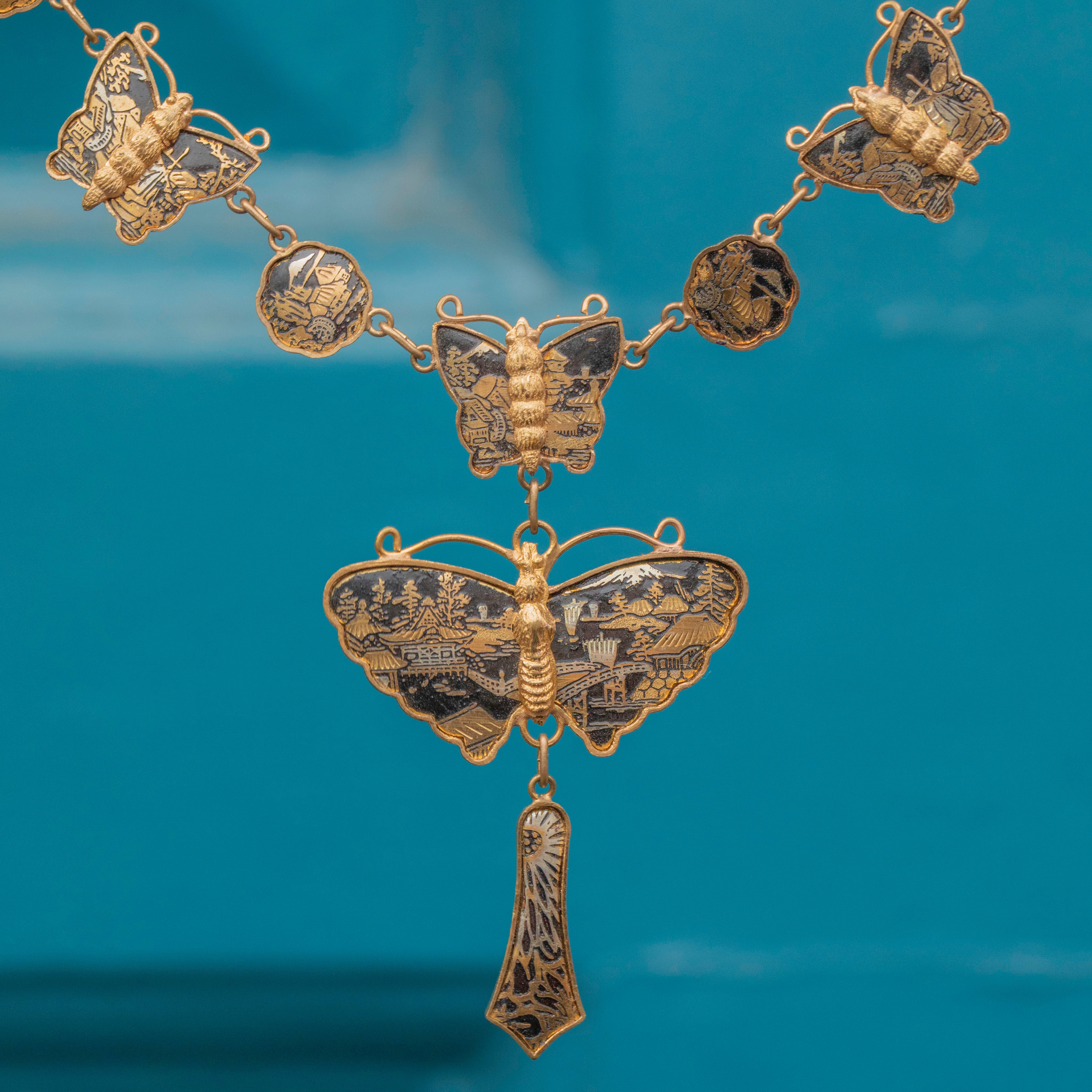 Art Deco Shakudo Damascene Butterfly Drop Necklace
