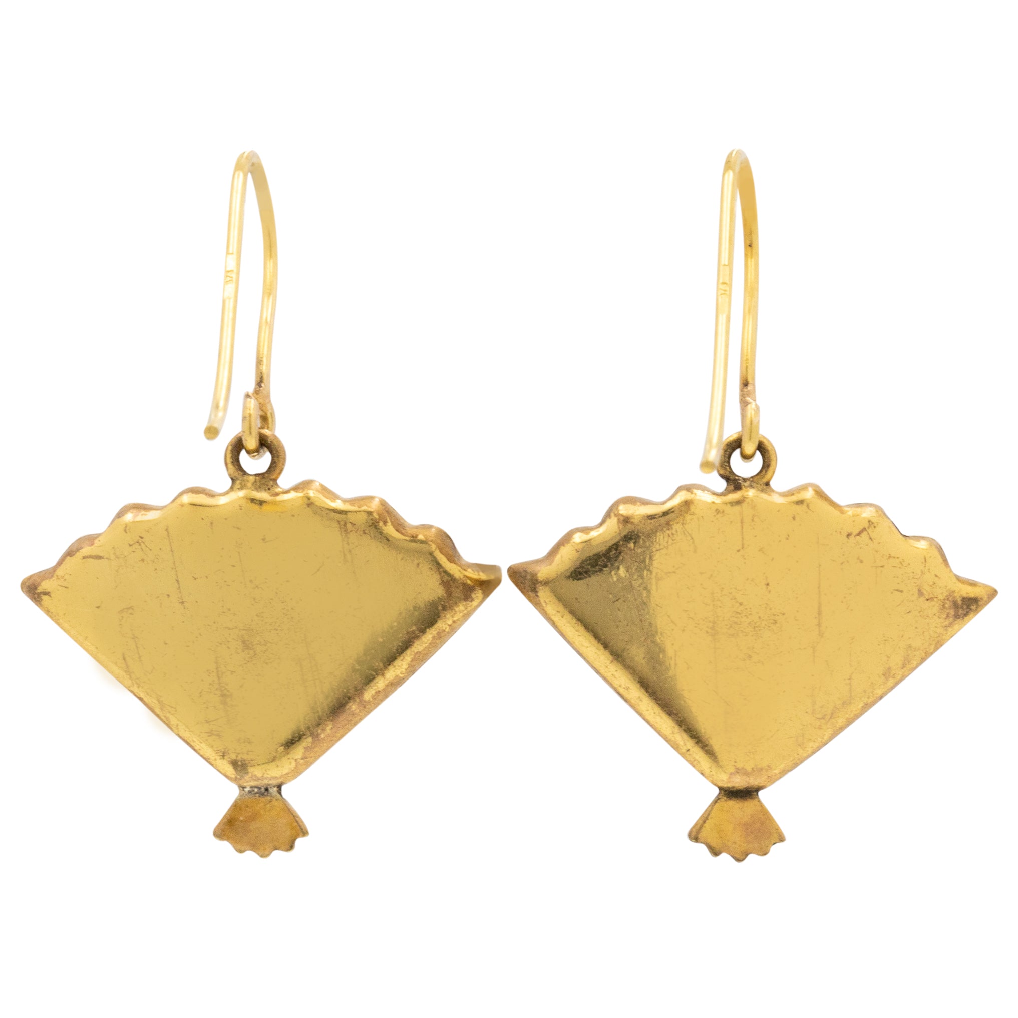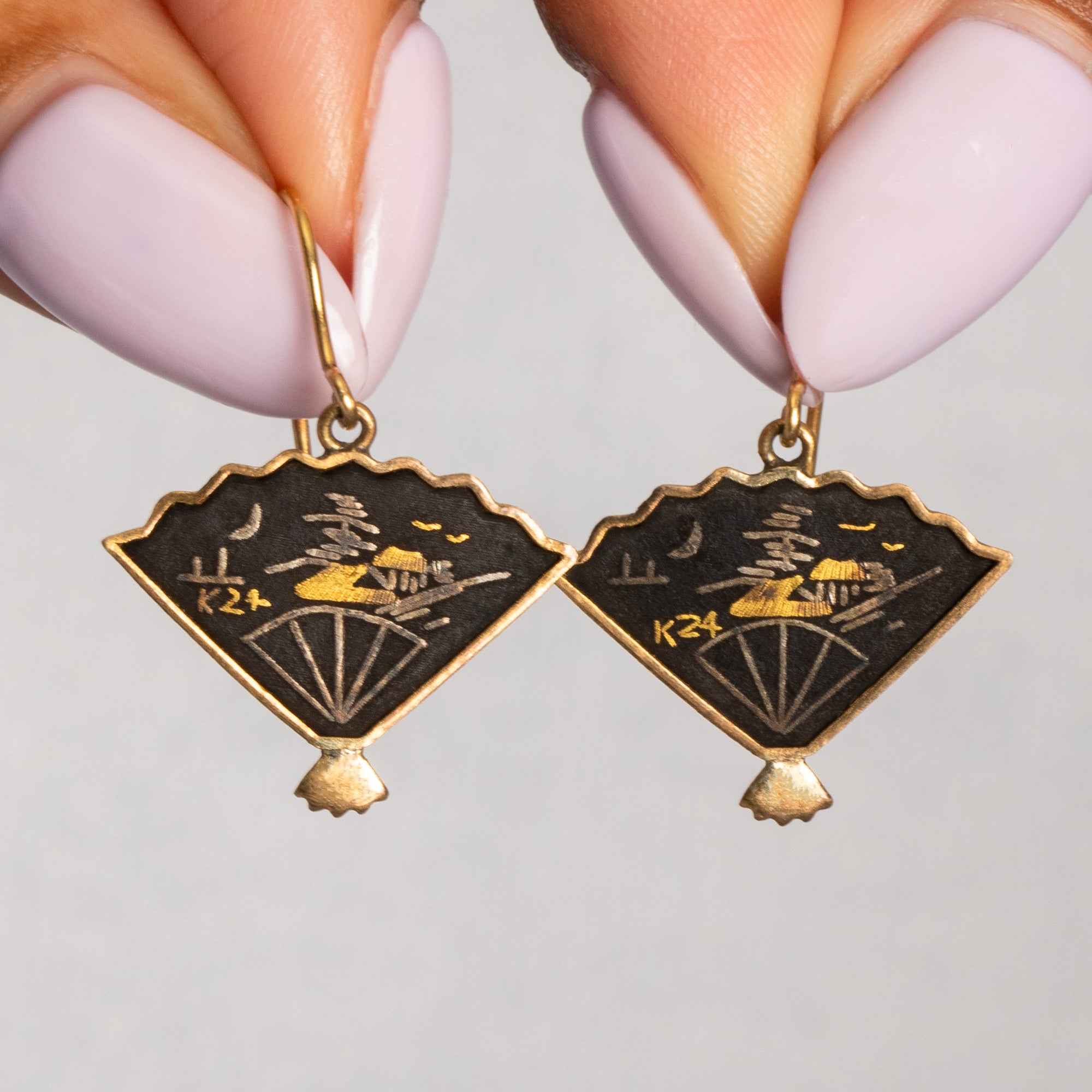 VERY GOOD. These Art Deco Shakudo Damascene fan earrings are offered in very good condition. The Shakudo damascene is pristine, free from any signs of wear. The back of the earrings has some surface wear, however, this is not noticeable when worn. The Gold-toned metal is bright and holds the Shakudo damascene securely. The slender hooks provide comfortable wear and allow you to wear these treasures confidently!
