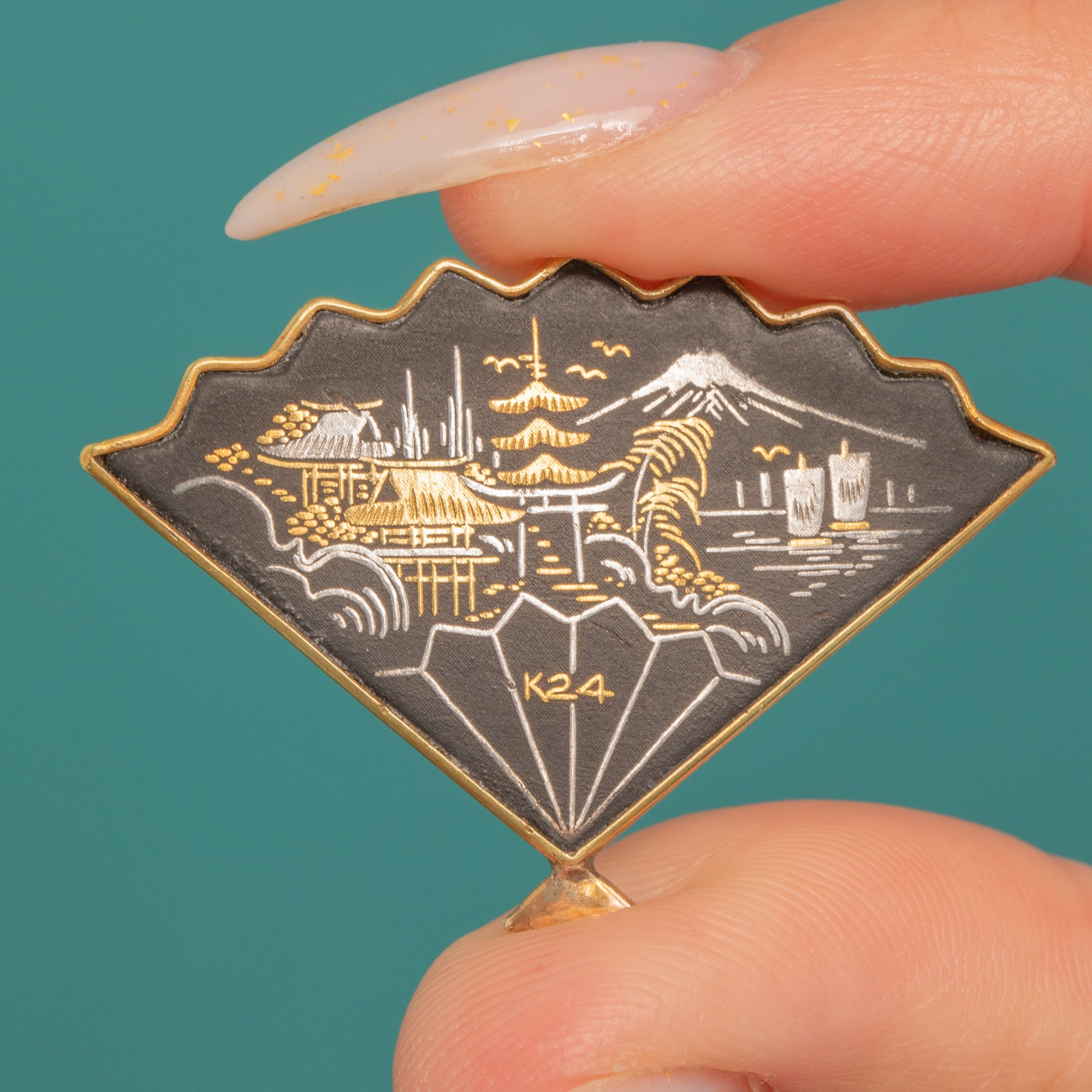 A charming Art Deco Japanese fan brooch rendered in Shakudo, the inky black patina enriched with delicate gold-toned linework of a stylised Mount Fuji landscapeāpagoda, sailing boats, birds and rippling wavesāframed by a slender gilt border and finished with a tiny drop finial. The pictorial scene is beautifully crisp, a miniature vignette that brings poetic serenity and refined artistry to a lapel or scarf.
