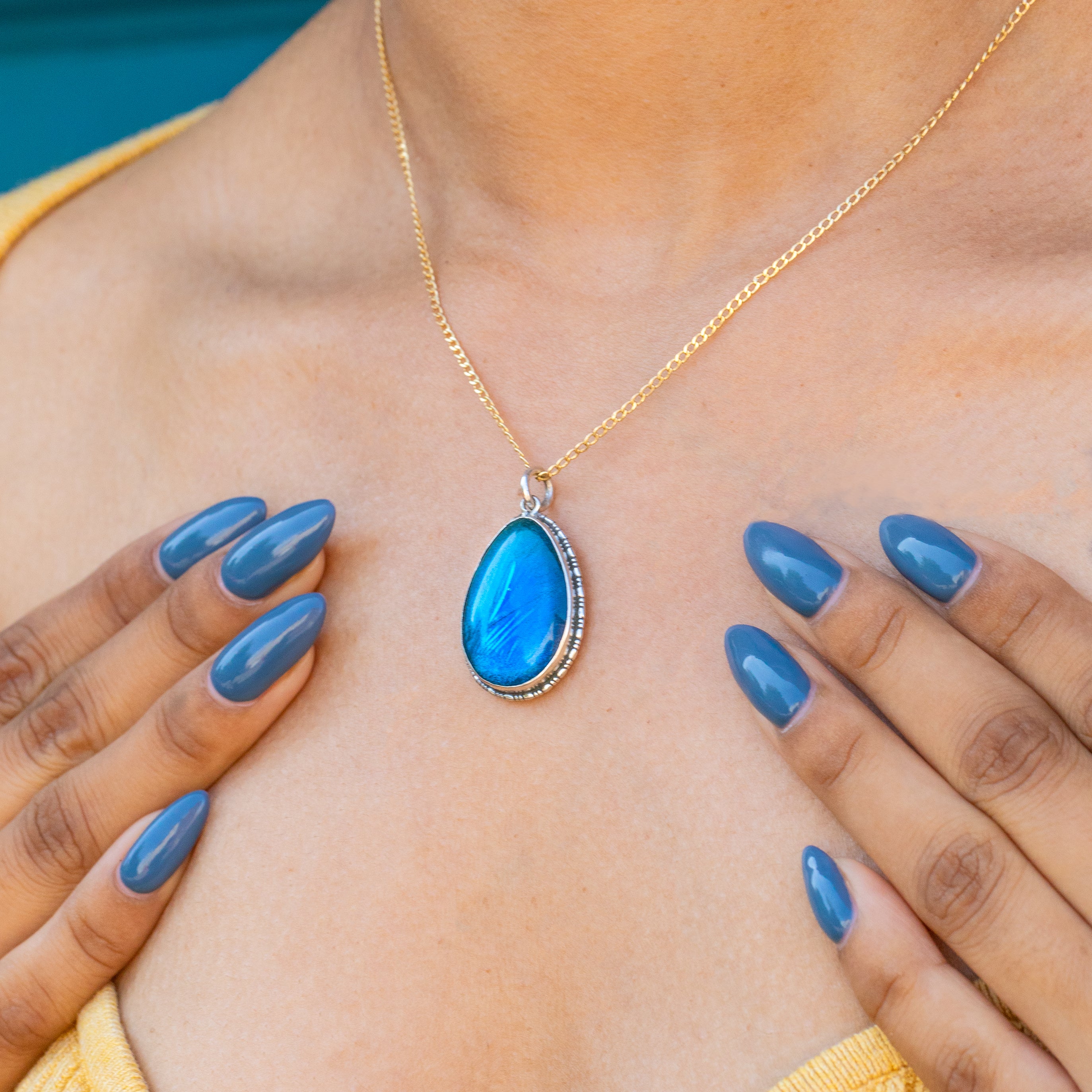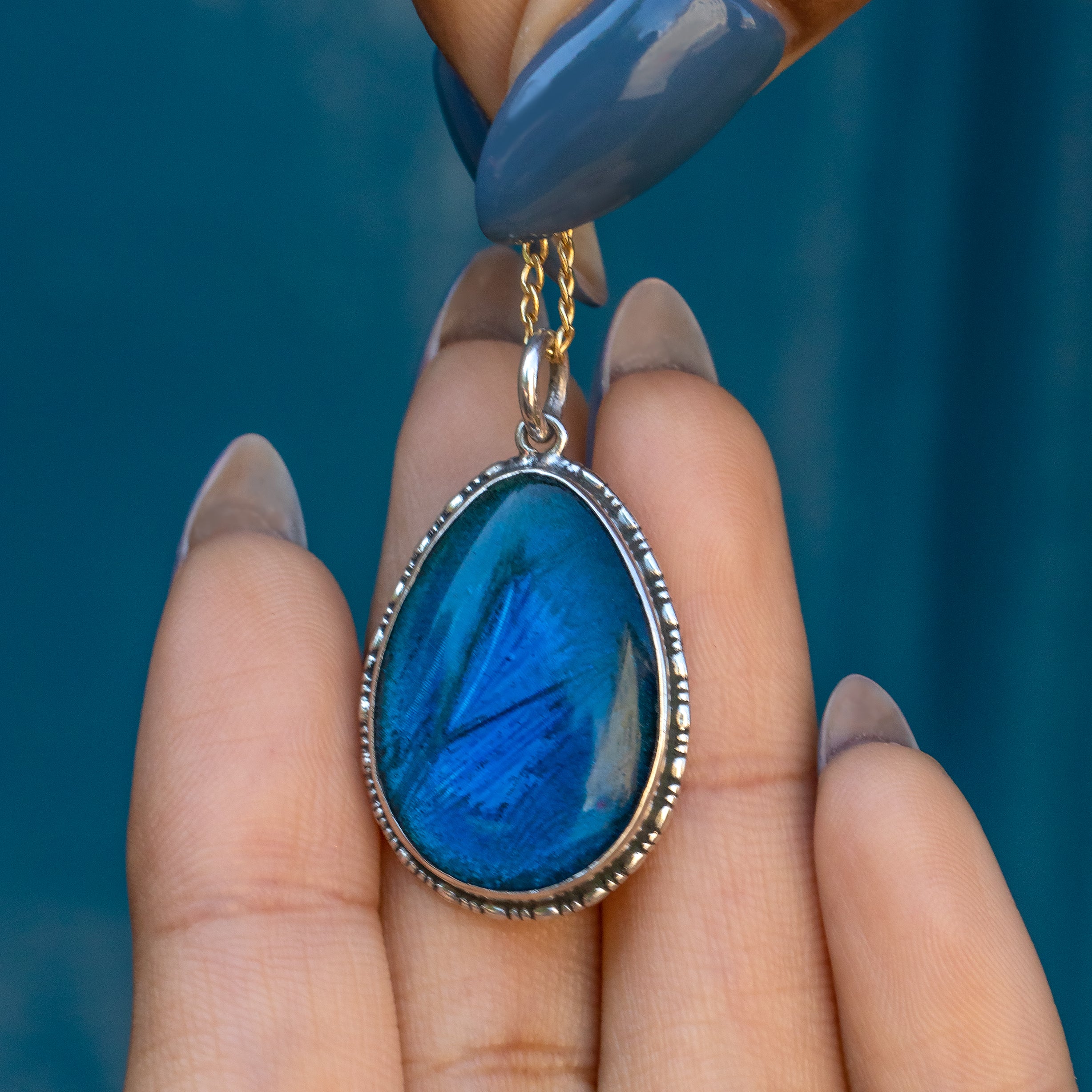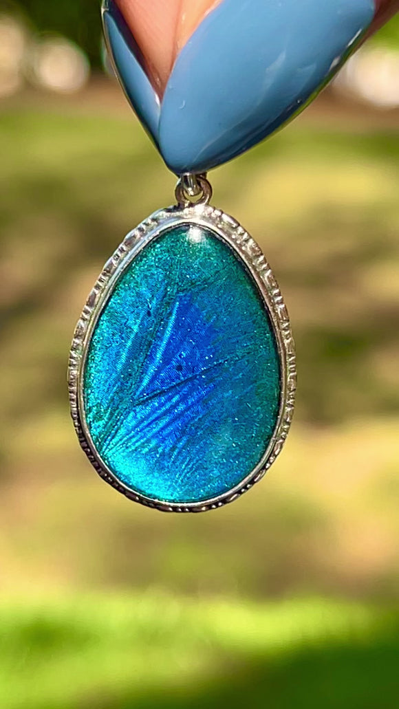 This pendant contains the neo-tropical Morpho blue butterfly wing, a species of butterfly that was native to Peru. The spectacular Butterfly wing is proudly displayed in the heart of this pendant, showcasing an array of vibrant greens and blues shimmering across the surface as she catches the light!