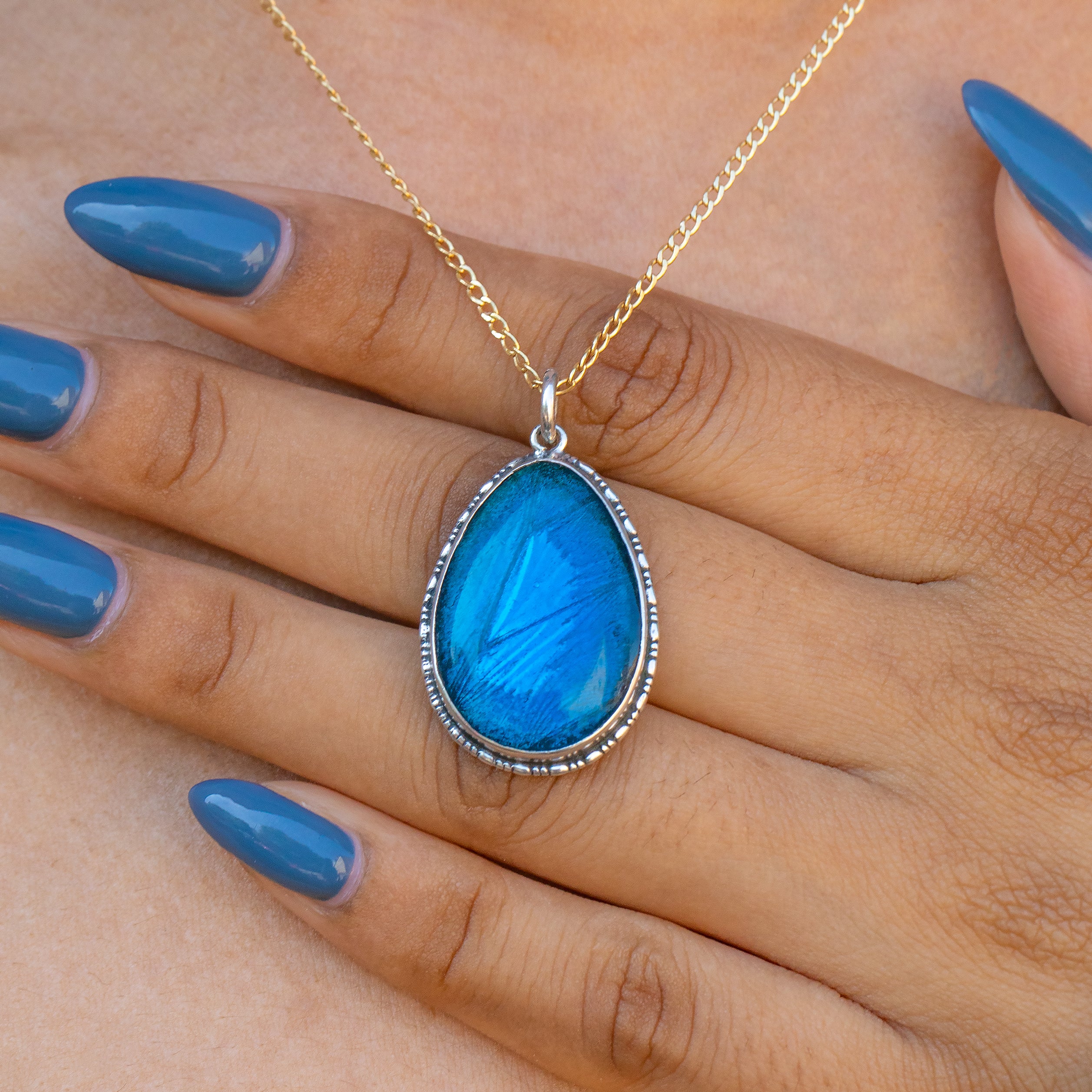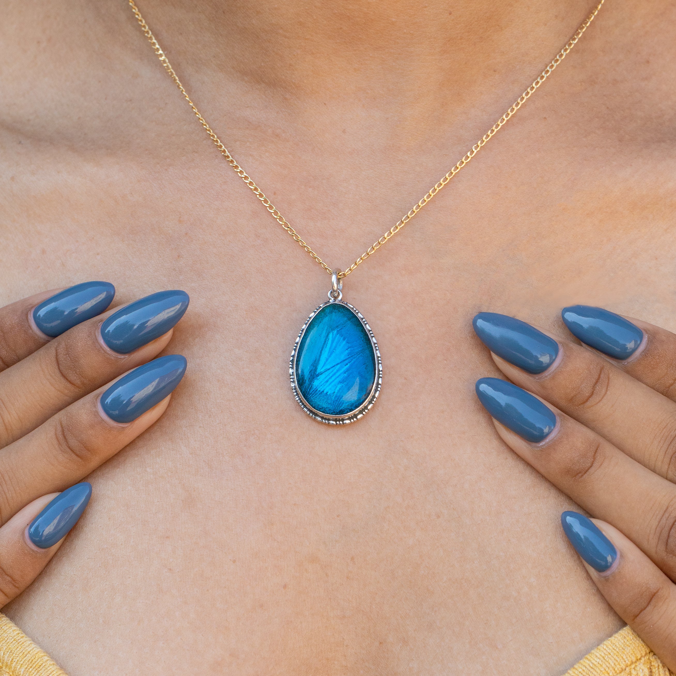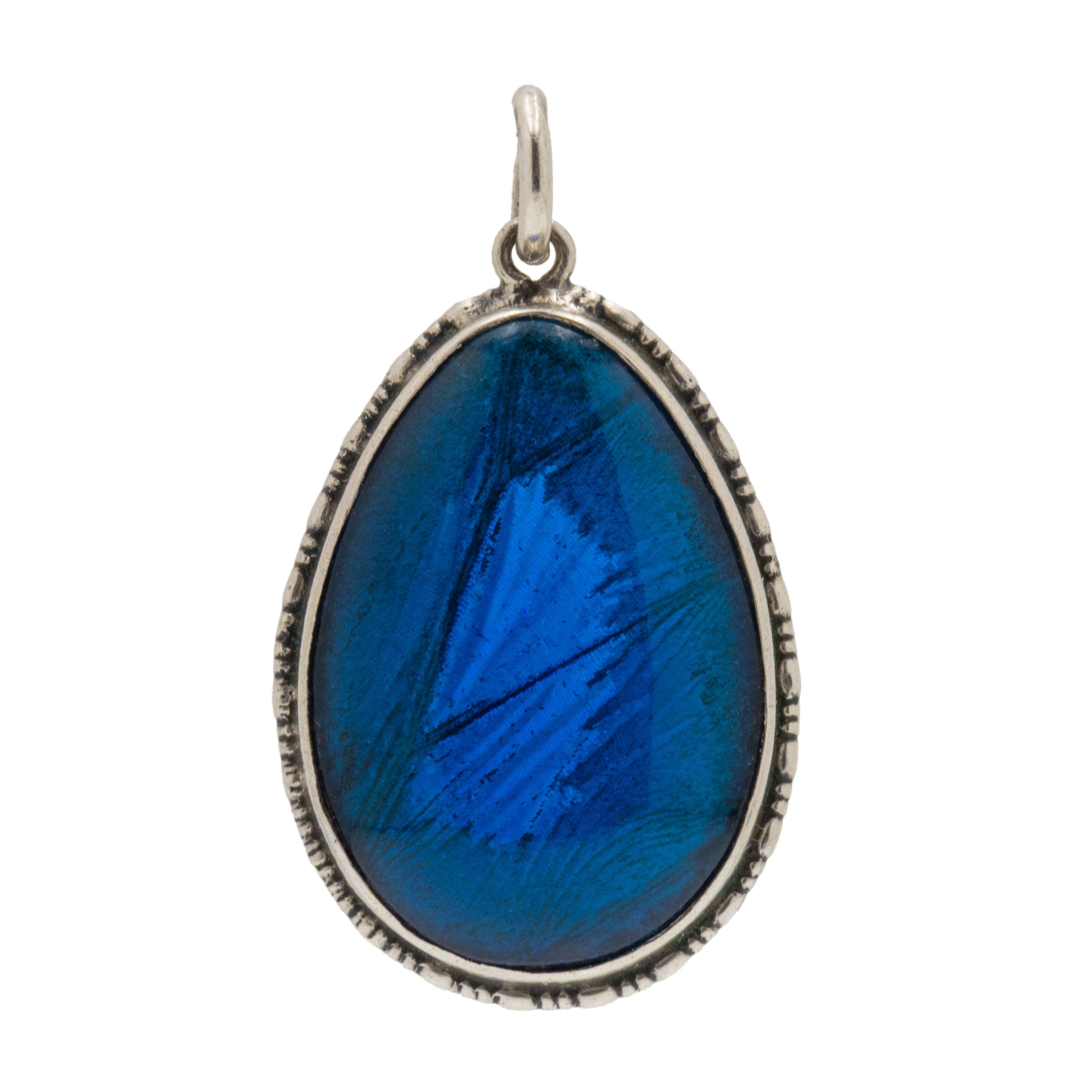 This pendant contains the neo-tropical Morpho blue butterfly wing, a species of butterfly that was native to Peru. The spectacular Butterfly wing is proudly displayed in the heart of this pendant, showcasing an array of vibrant greens and blues shimmering across the surface as she catches the light!