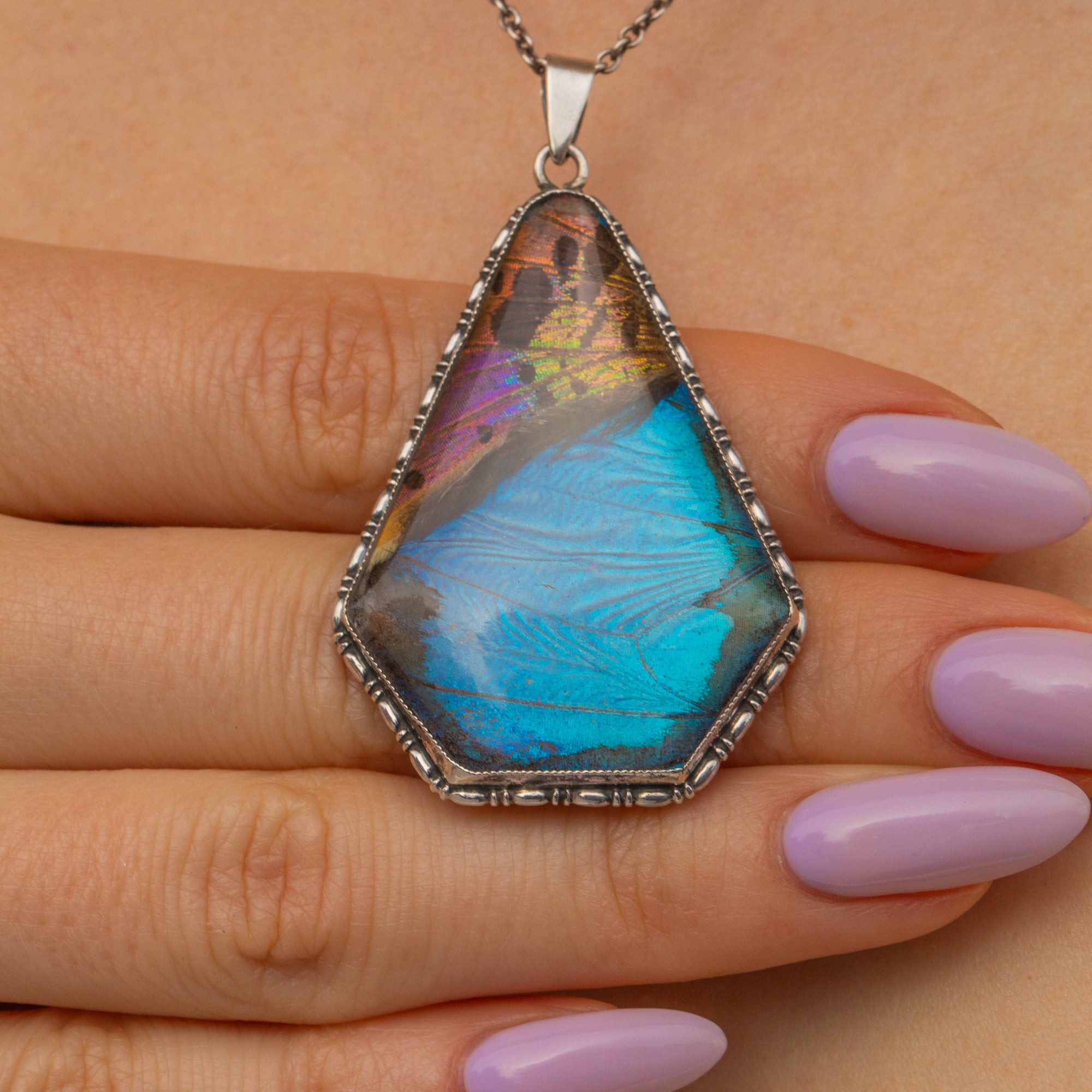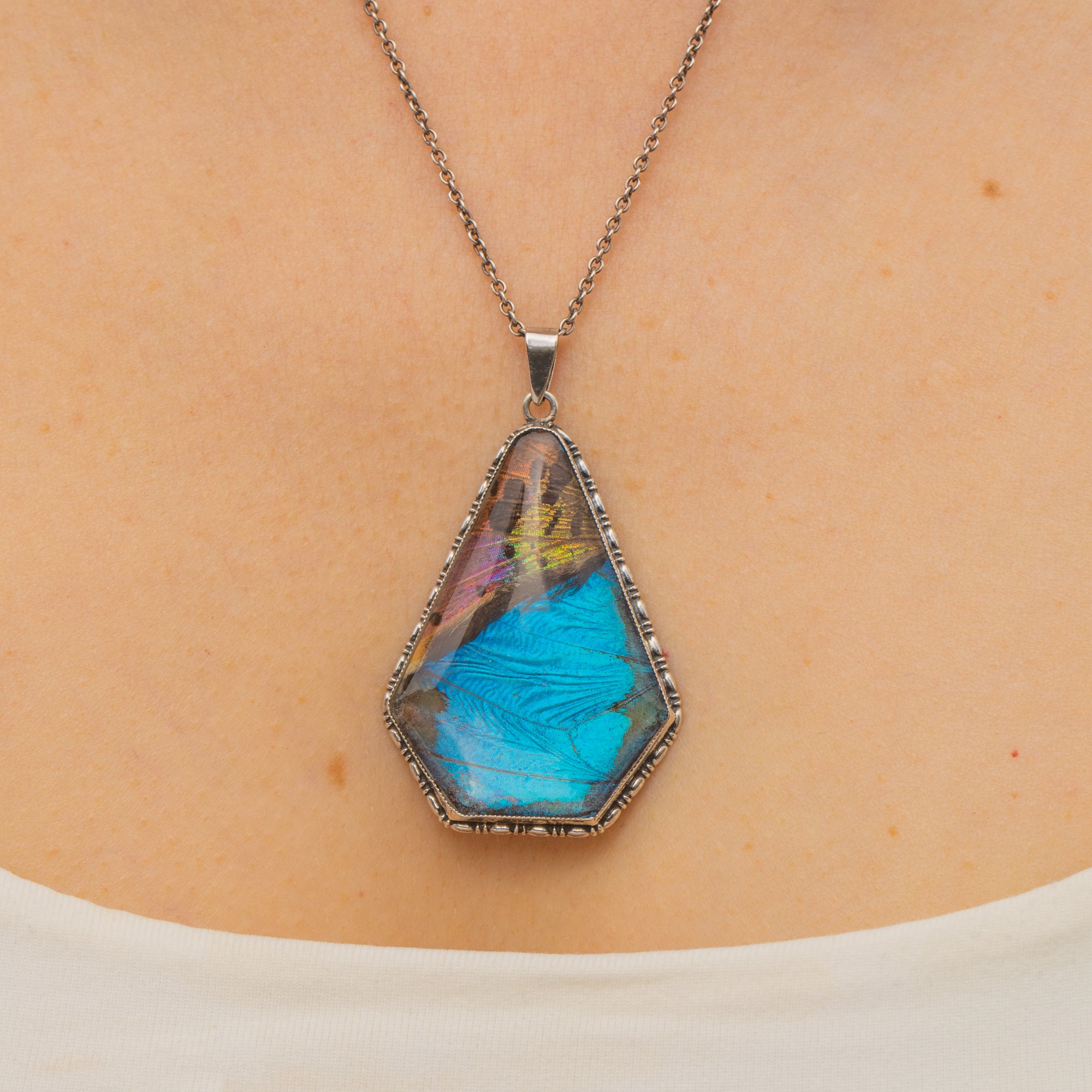 This Art Deco Silver butterfly wing pendant is a vivid, highly sought-after piece from the roaring 1920s. This pendant encapsulates the Art Deco era's fascination with bold, bright jewellery and "exotic" materials.