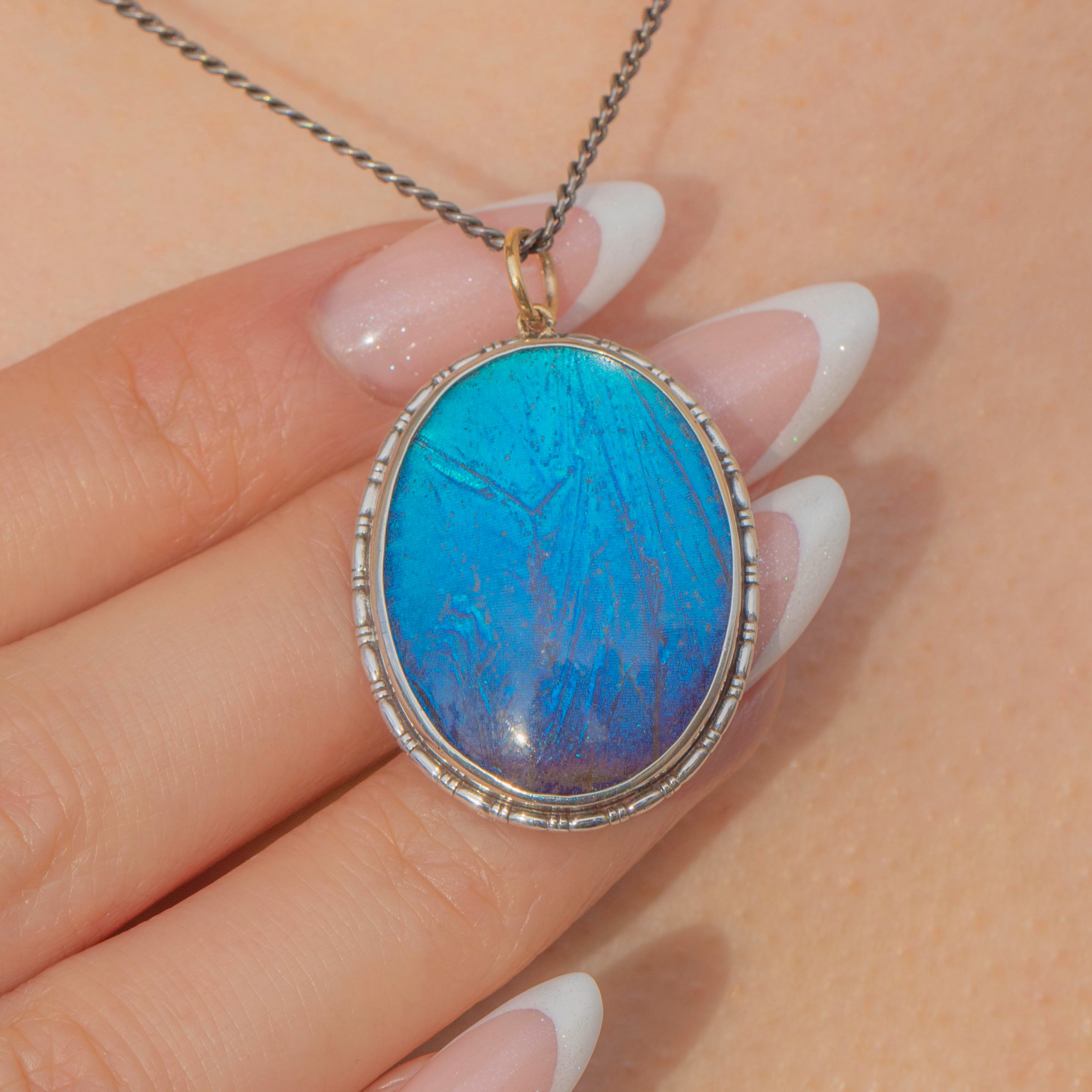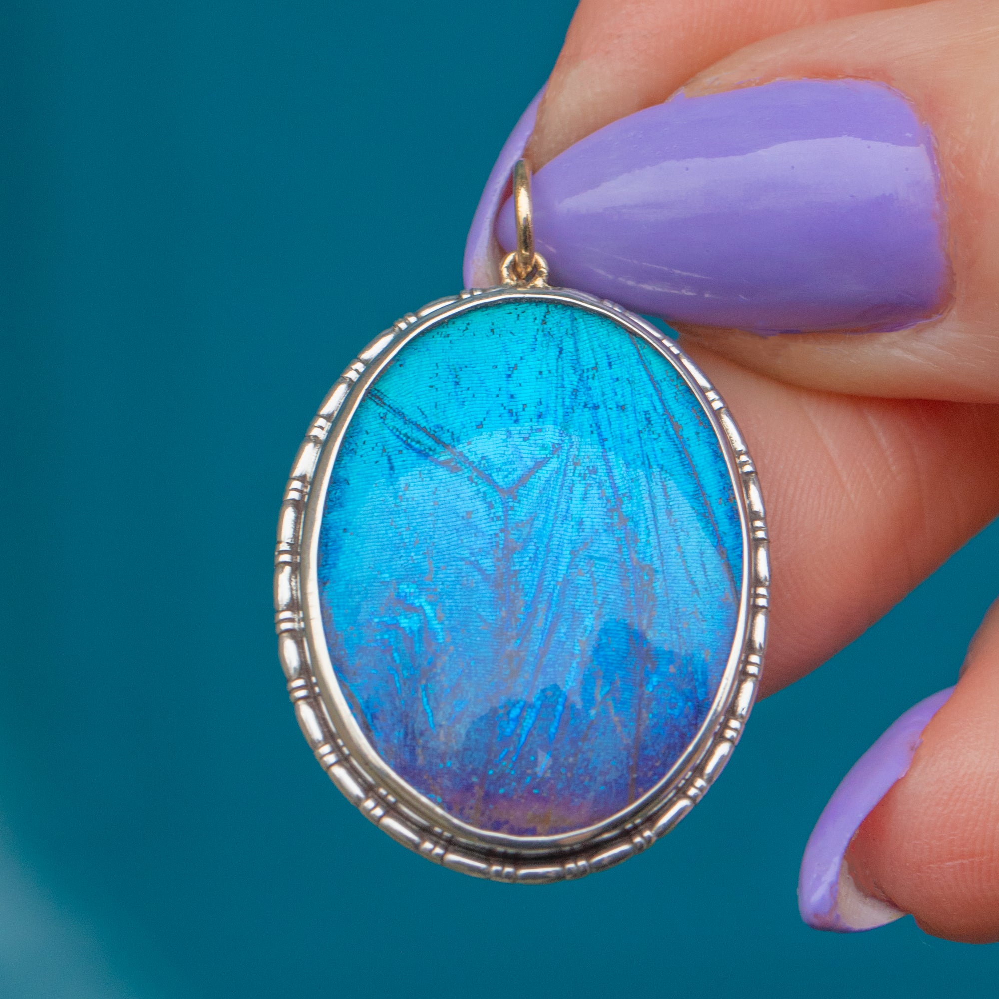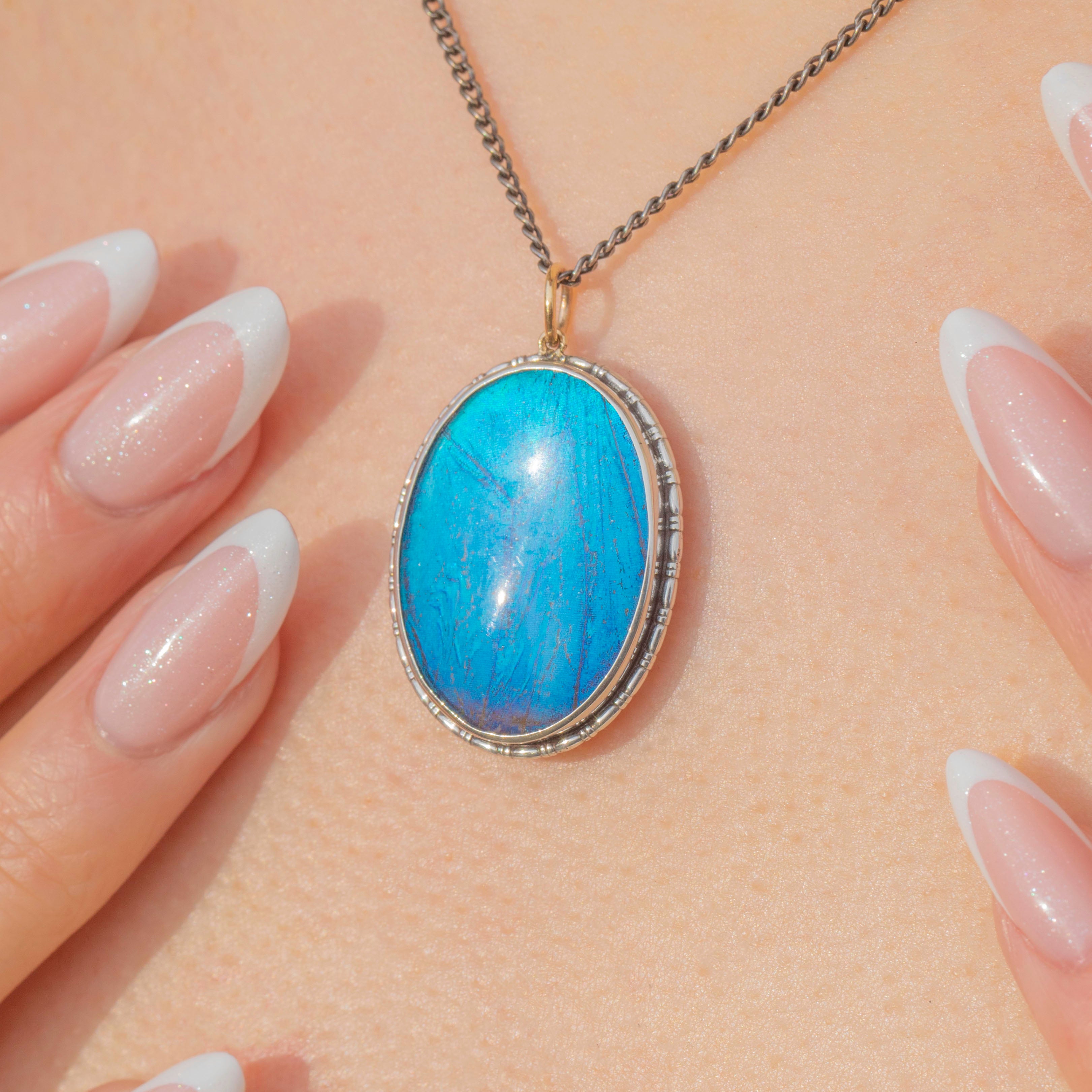 A symbol of transformation and hope, Morpho butterfly wing jewellery became highly fashionable during the Art Deco era. A unique and elegant piece, this antique butterfly wing pendant can be worn and enjoyed as part of your everyday attire!