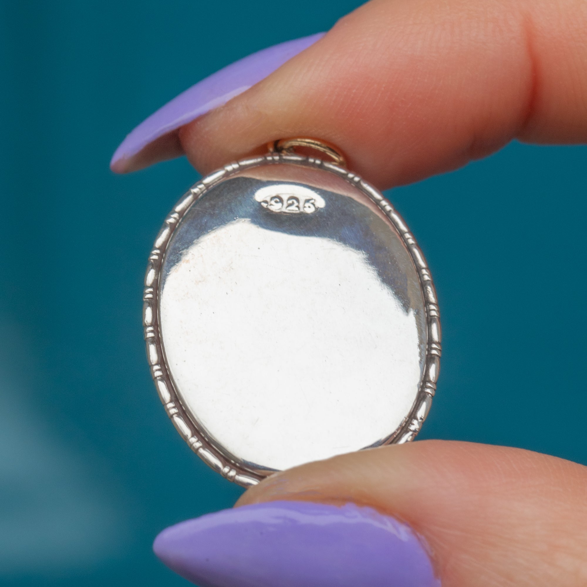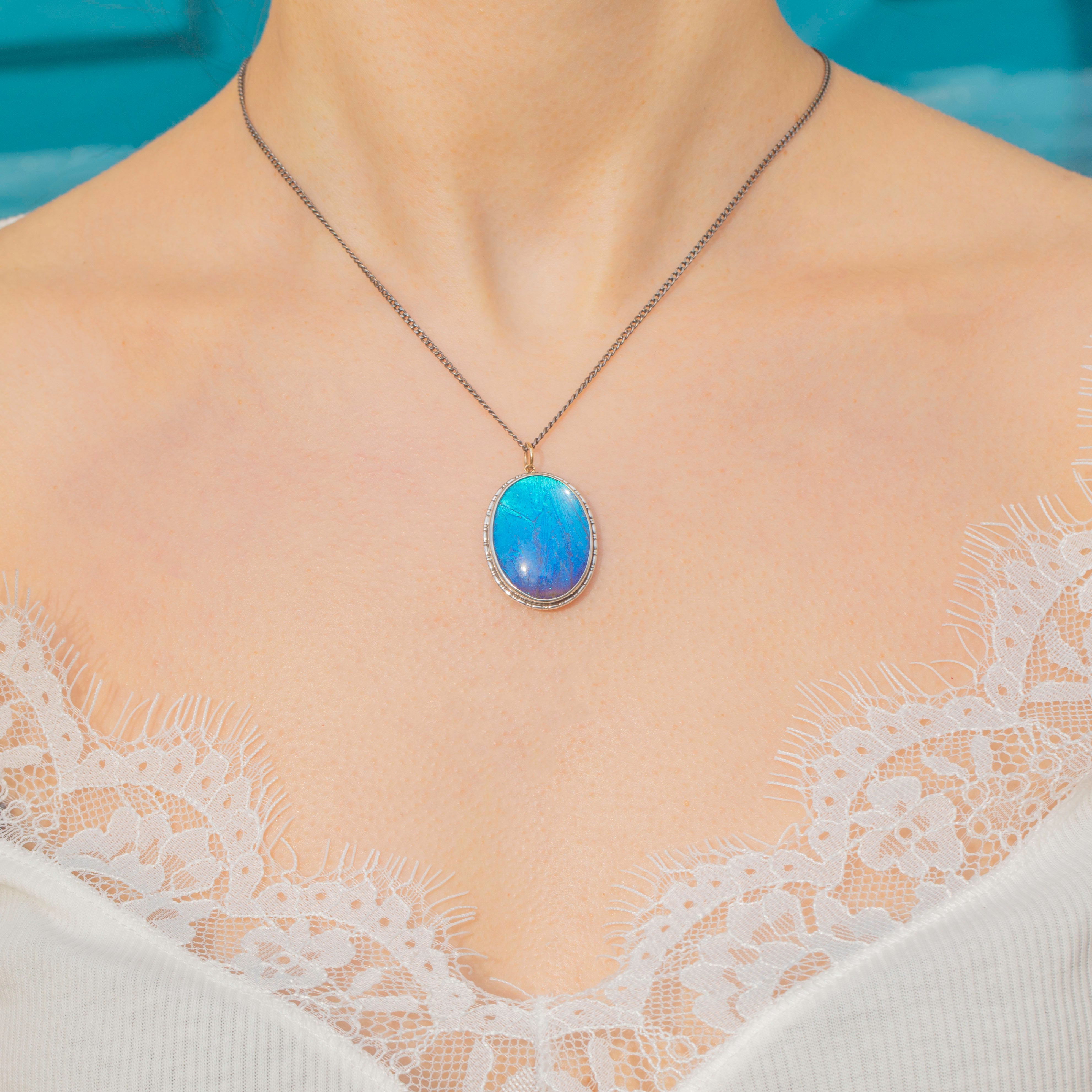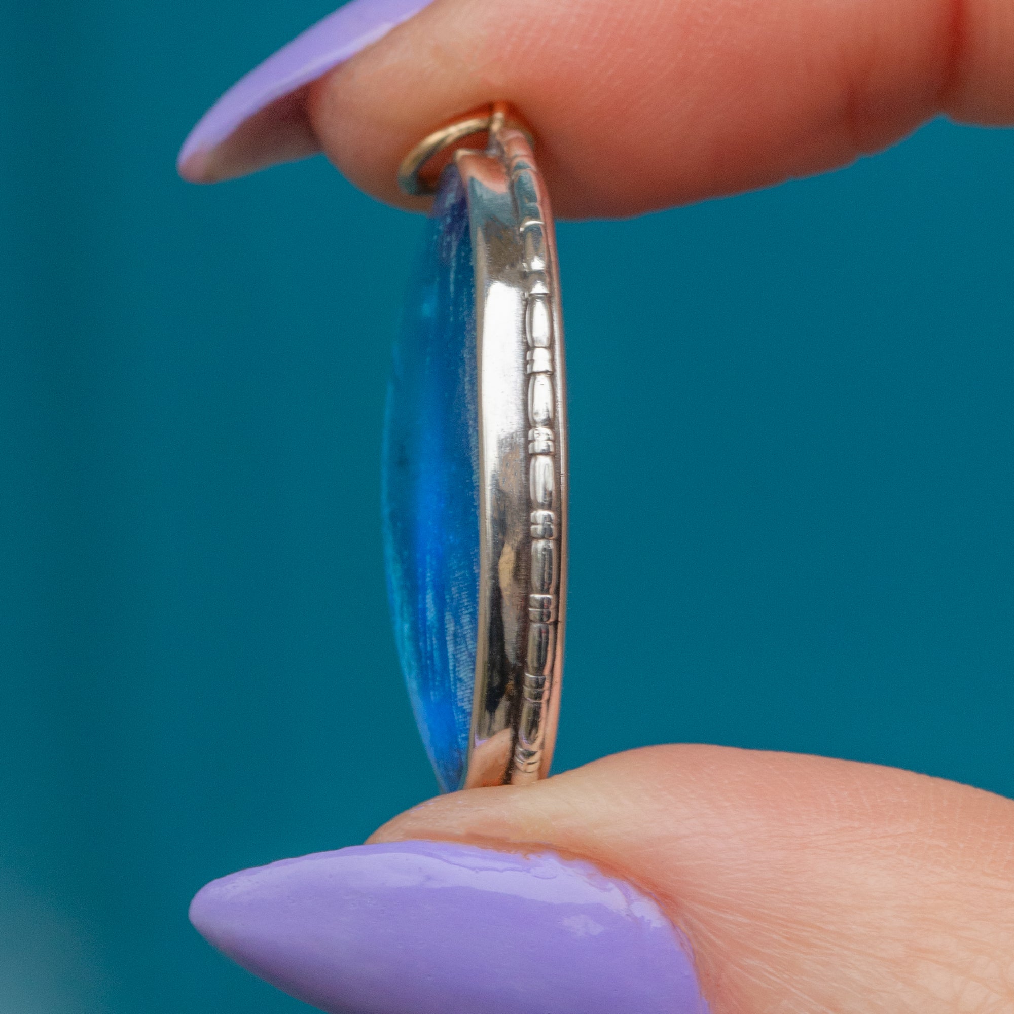 Add an iridescent shimmer to your décolletage with this outstanding Art Deco Silver butterfly wing pendant! The lustrous Sterling Silver displays a vibrant Morpho butterfly wing, shimmering with electric blue hues as it catches the light.