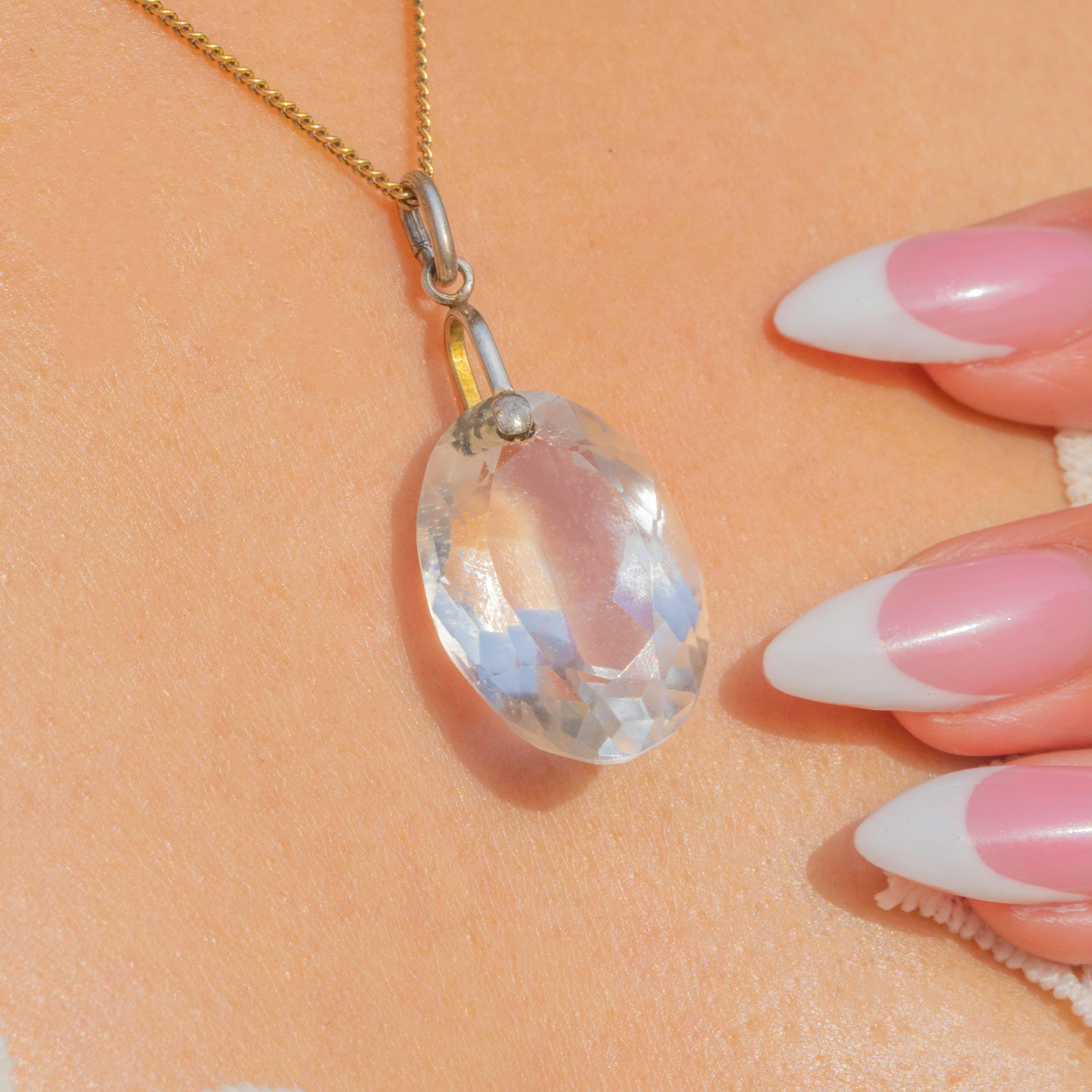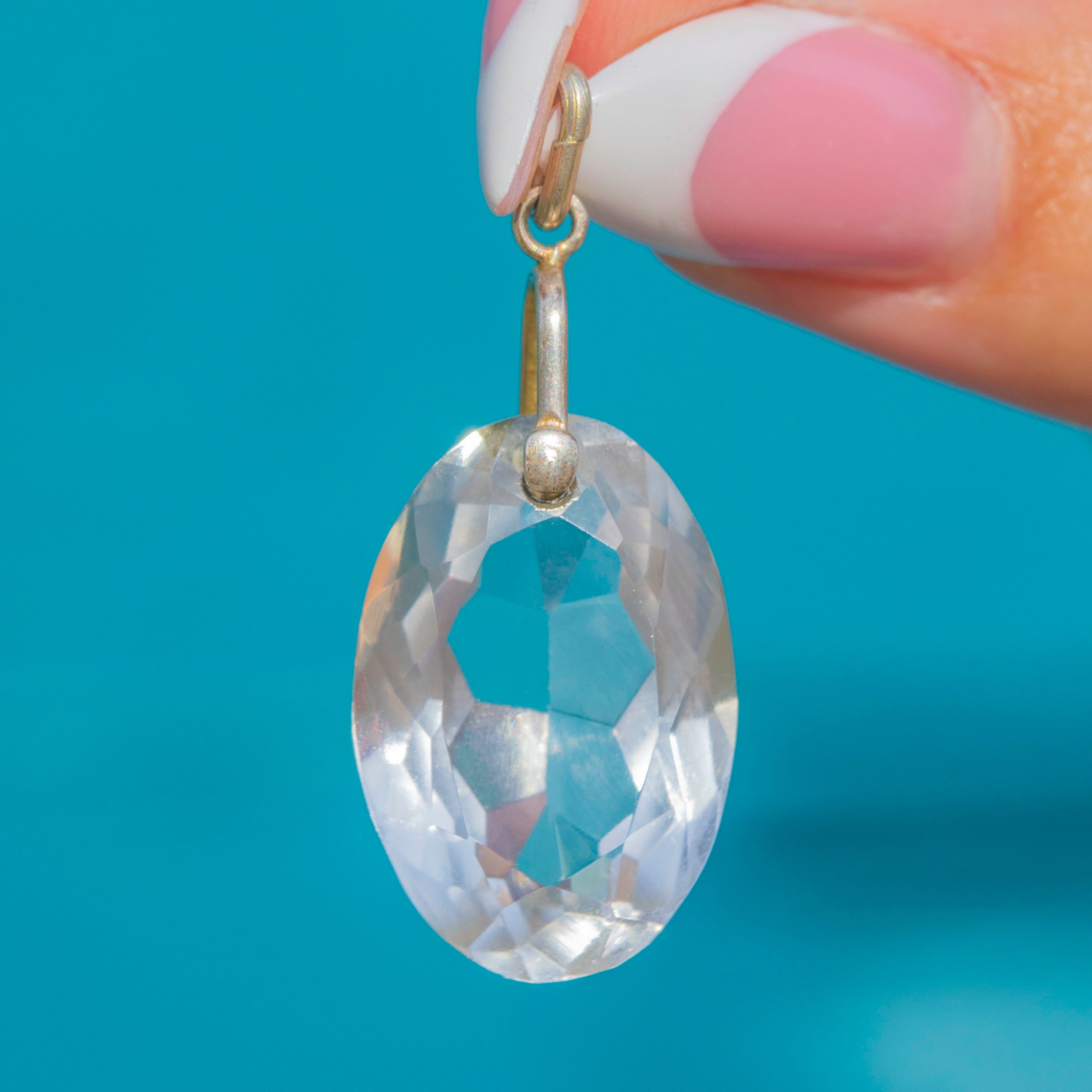 This Art Deco pendant showcases a beautifully faceted Rock Crystal, set in sleek Sterling Silver, boasting icy crisp tones.