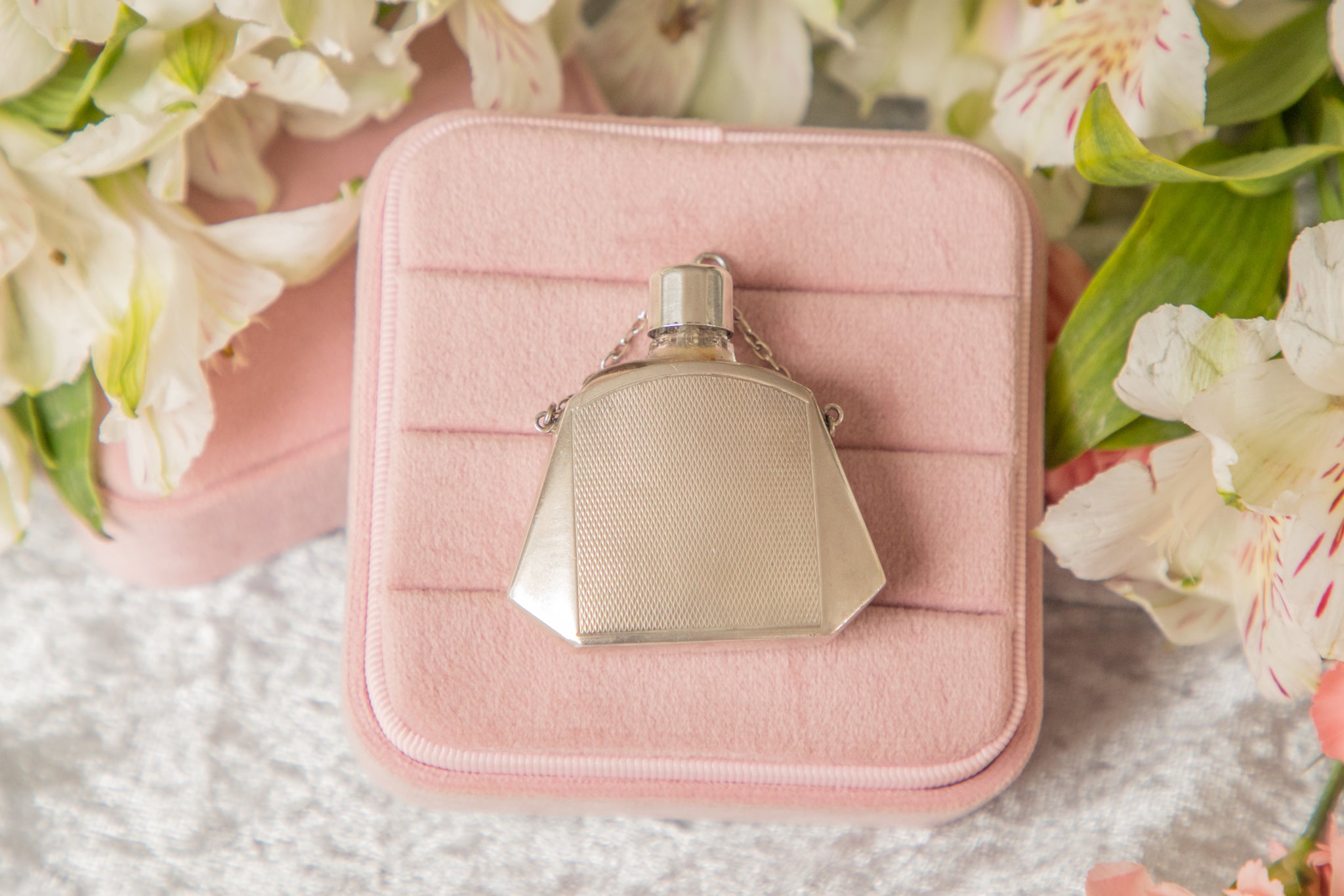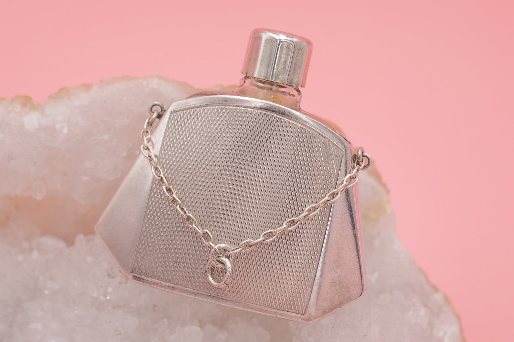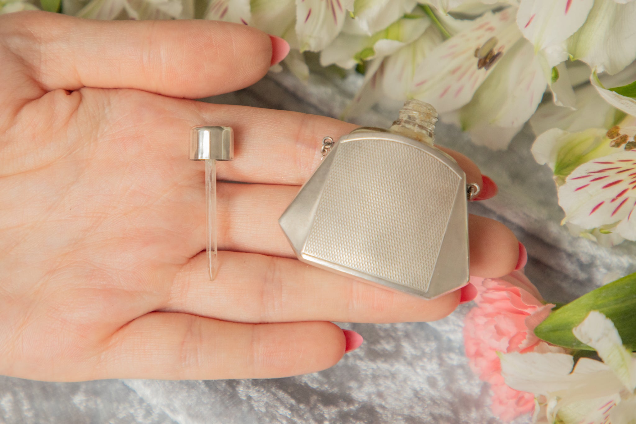 VERY GOOD: This Art Deco Silver Glass perfume bottle is in very good condition throughout. The 835 Silver has minor surface wear with a ding present on the base of the bottle, however this is not visible when worn! The bottle is fully functioning, the lid fully unscrews and stays secure so you can fill her up with your favourite perfume.