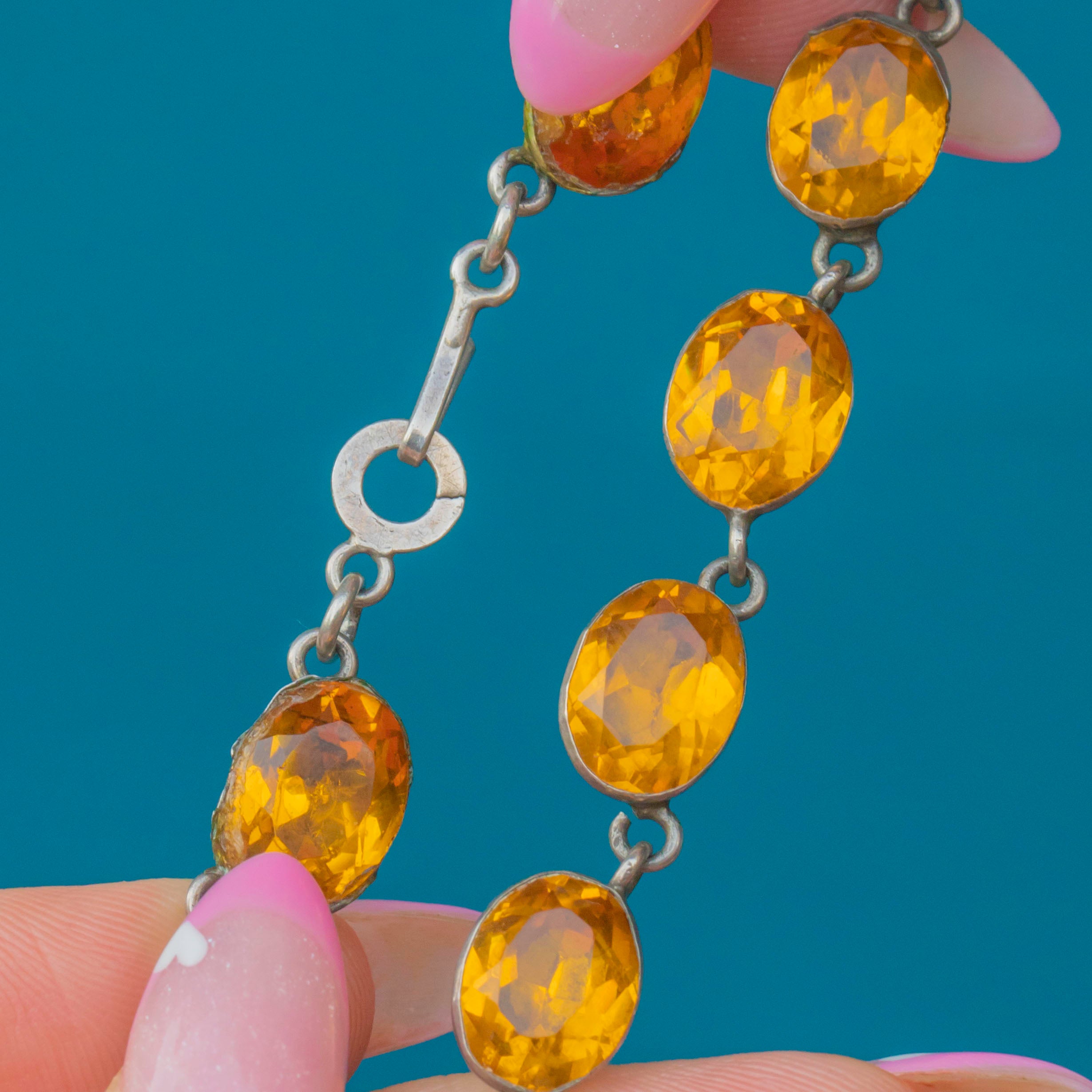 VERY GOOD. This Art Deco Silver Yellow Paste riviere necklace is in wonderful condition, especially when considering its grand age! The Paste gems are securely set, and the bright foils are fully intact. There is some minor surface wear to some of the Silver domed backs and minor abrasions to some of the gems, but these are only noticeable under close inspection and to be expected from a piece of her age. The Silver has accrued a light patina adding to her antique charm, creating a beautiful contrast against the vibrant Paste gems. The clasp is sturdy allowing you to wear this spectacular Art Deco necklace with absolute confidence!
