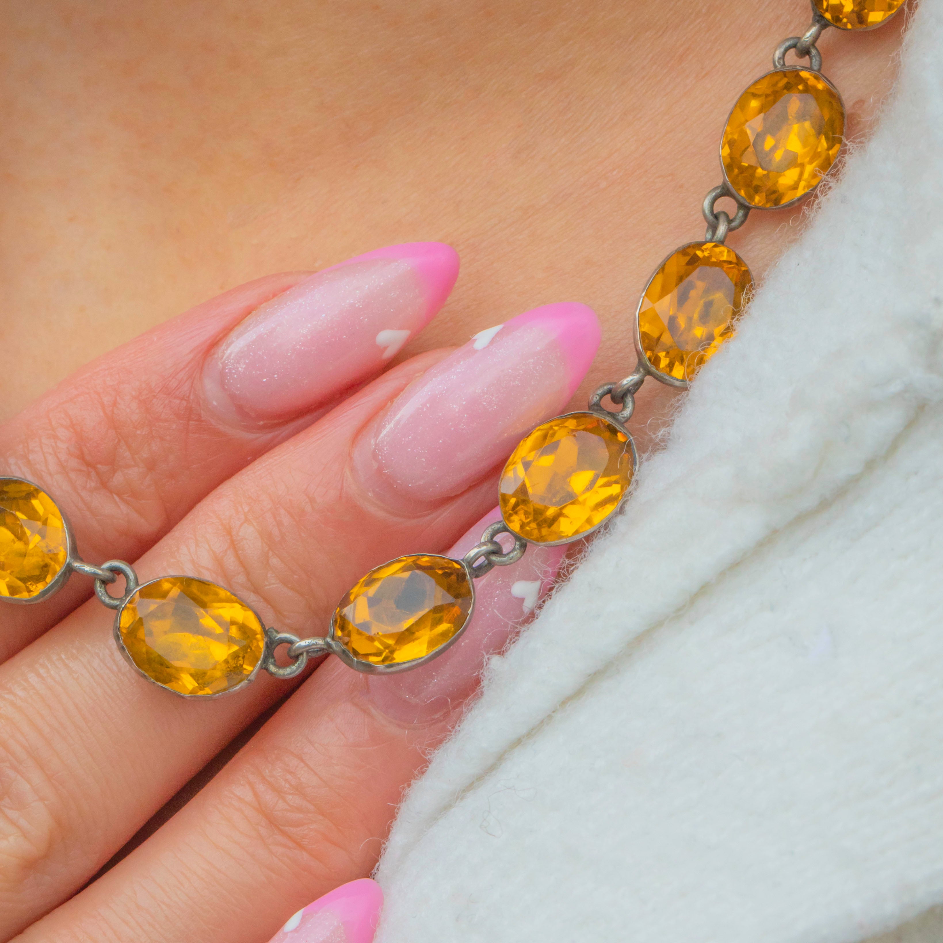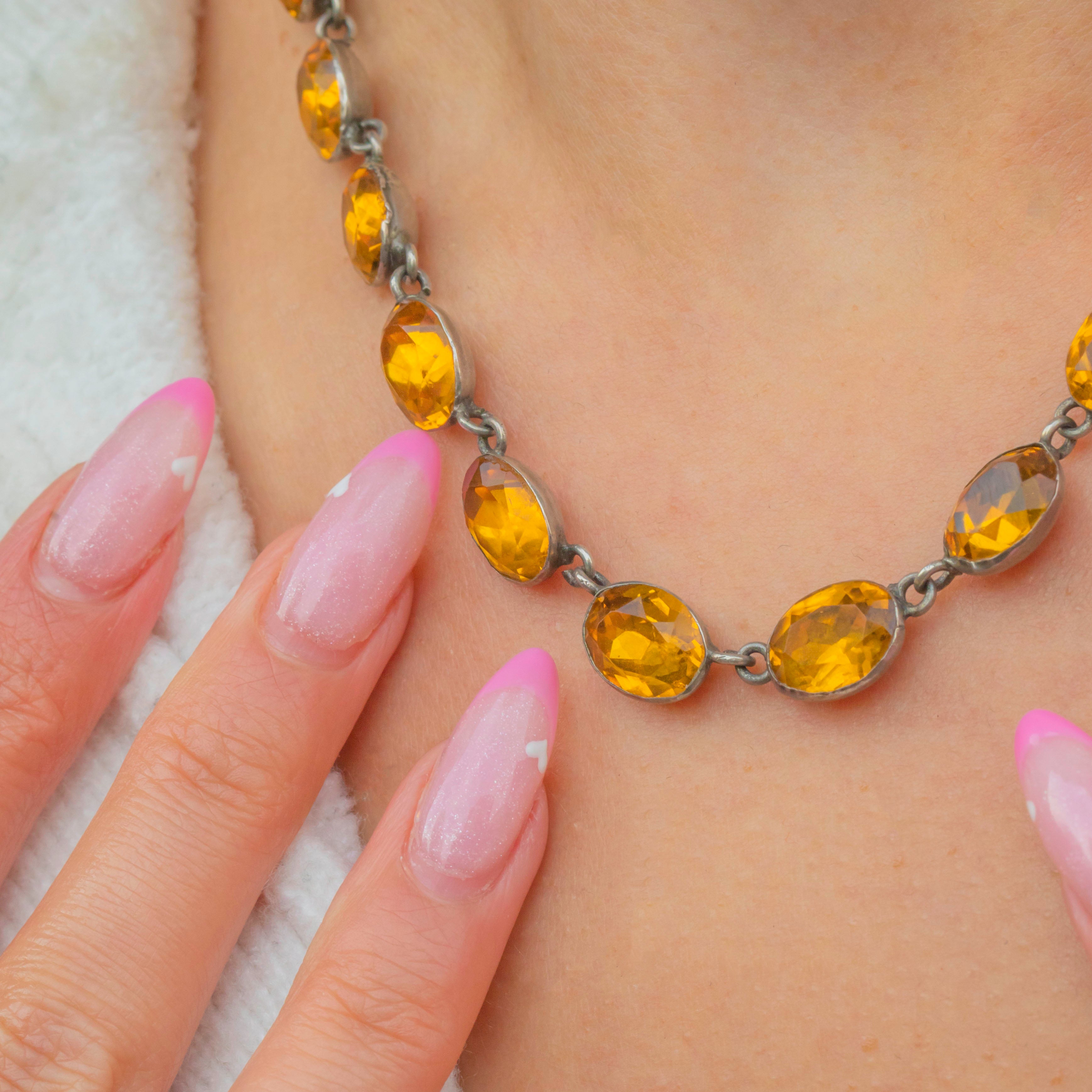 This Art Deco Silver Yellow Paste riviere necklace is resplendent in every way! Emanating lively honeycomb hues, this antique necklace has exquisite yellow foiled Paste gems, akin to the delights of Citrine and Topaz.