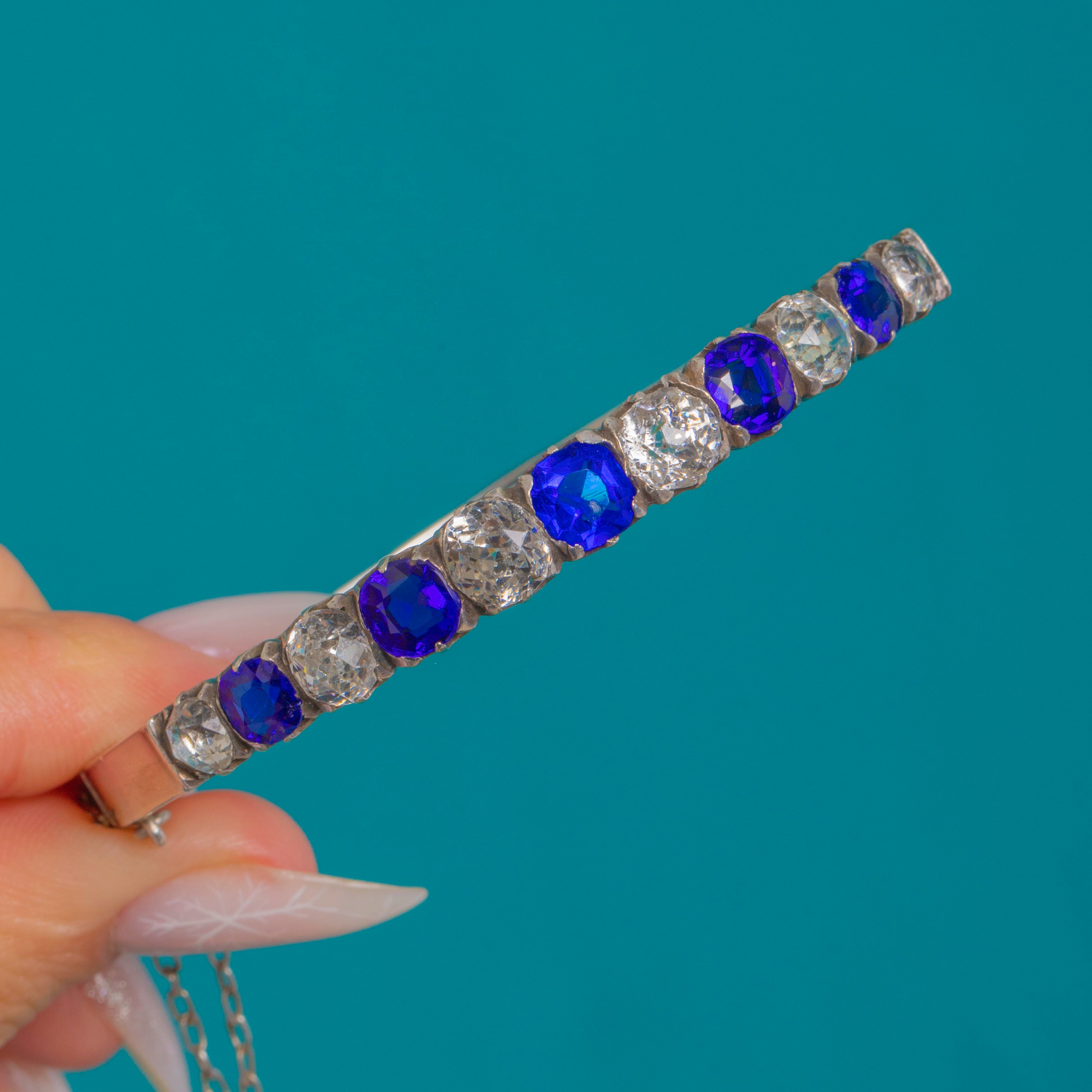 A sleek Art Deco Sterling Silver hinged bangle set with a crisp line of alternating Blue and White Paste. The stones are round to slightly cushion in old-style, high-crowned cuts, creating a lively play of light in a refined “line” arrangement across the front.