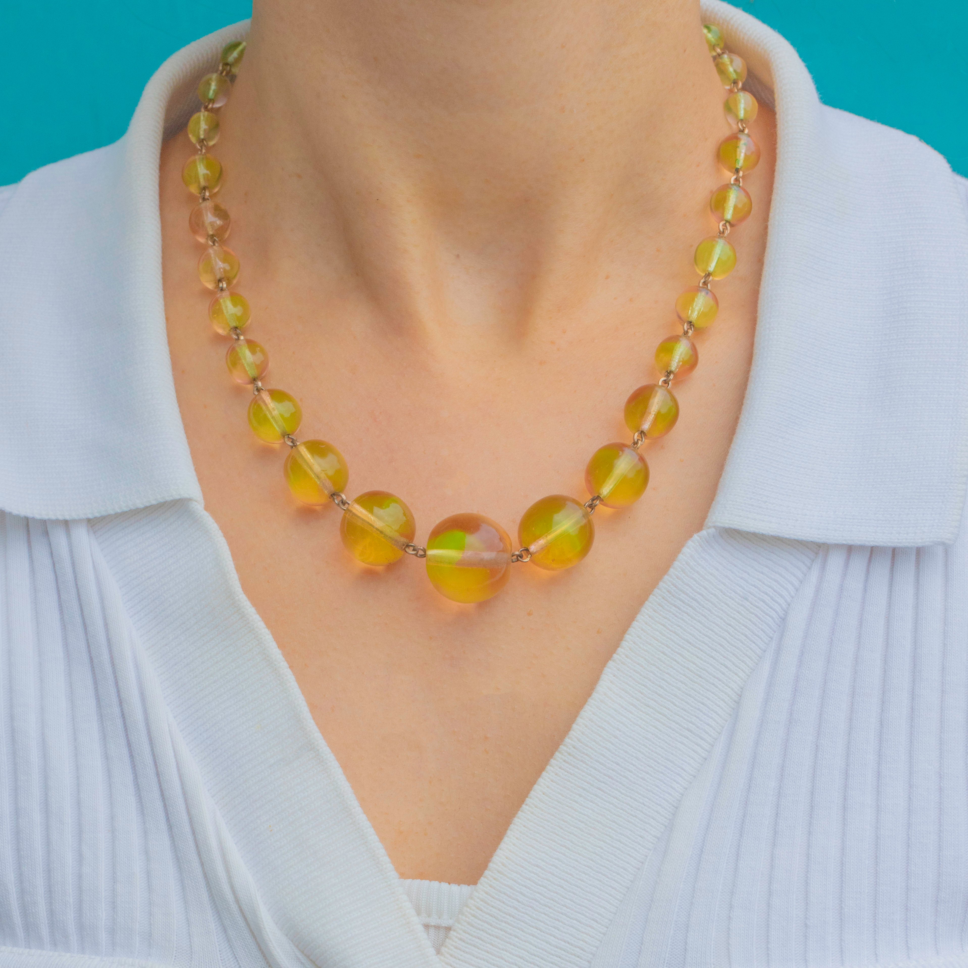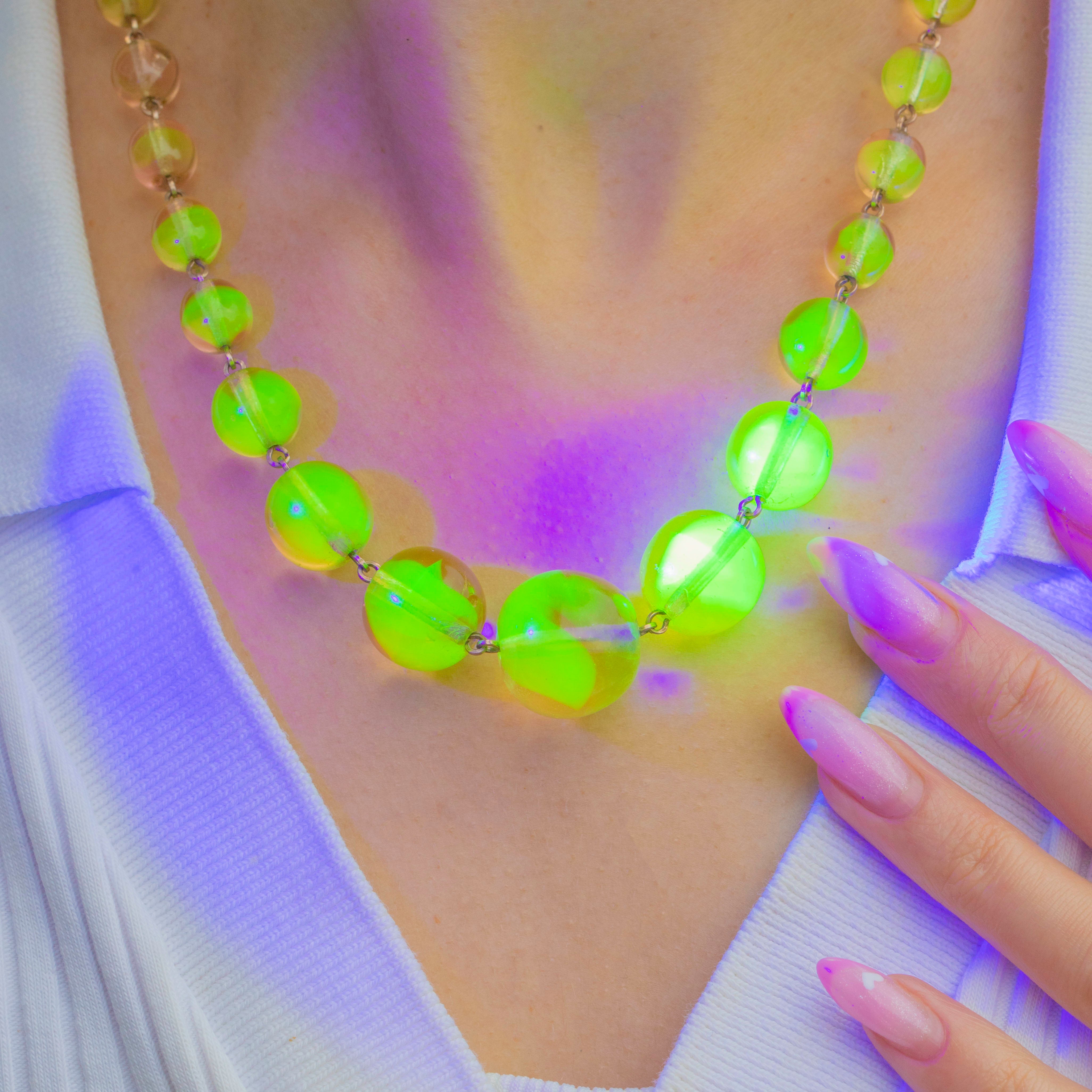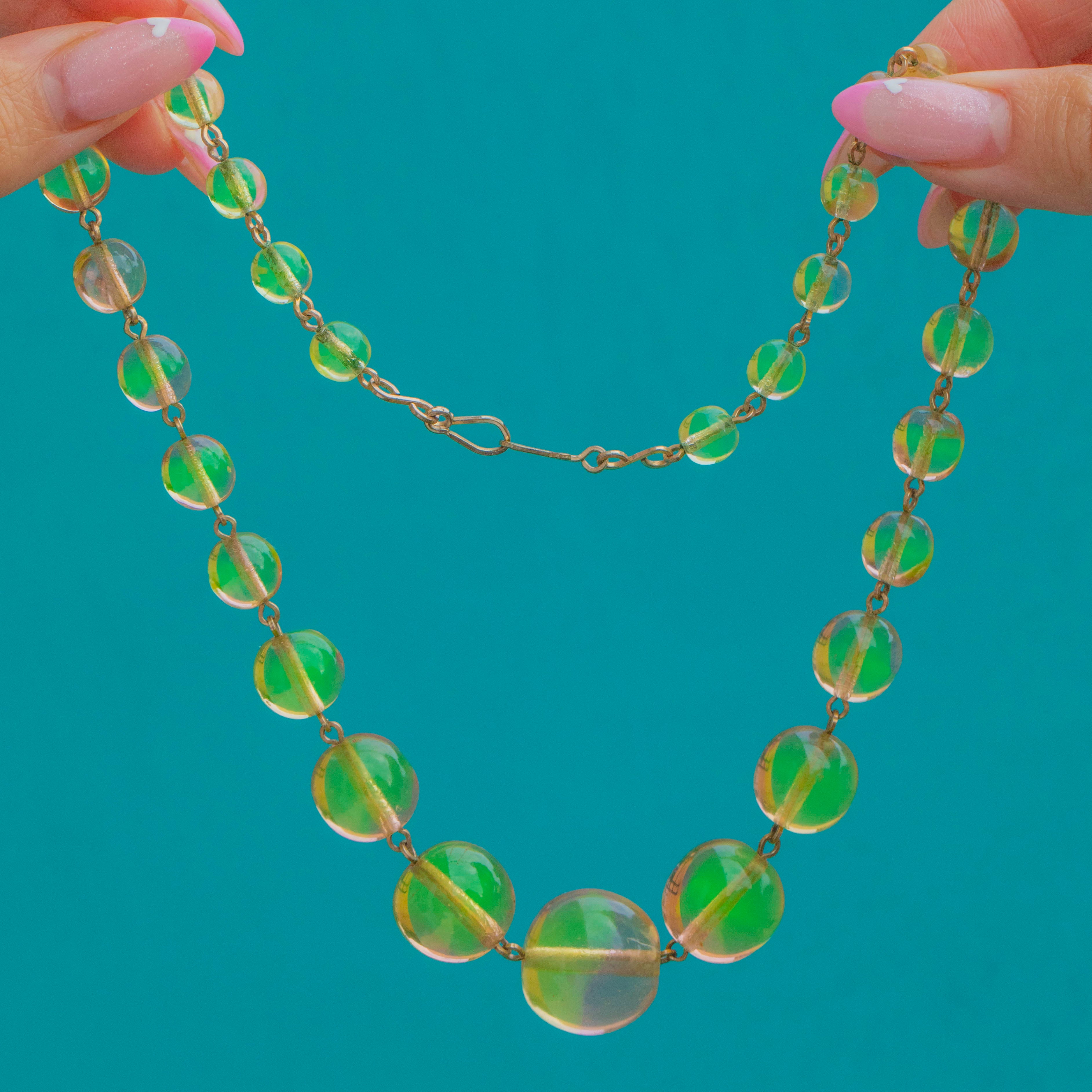 This vibrant Art Deco necklace glows with eye-catching Uranium glass beads that come alive under UV light.