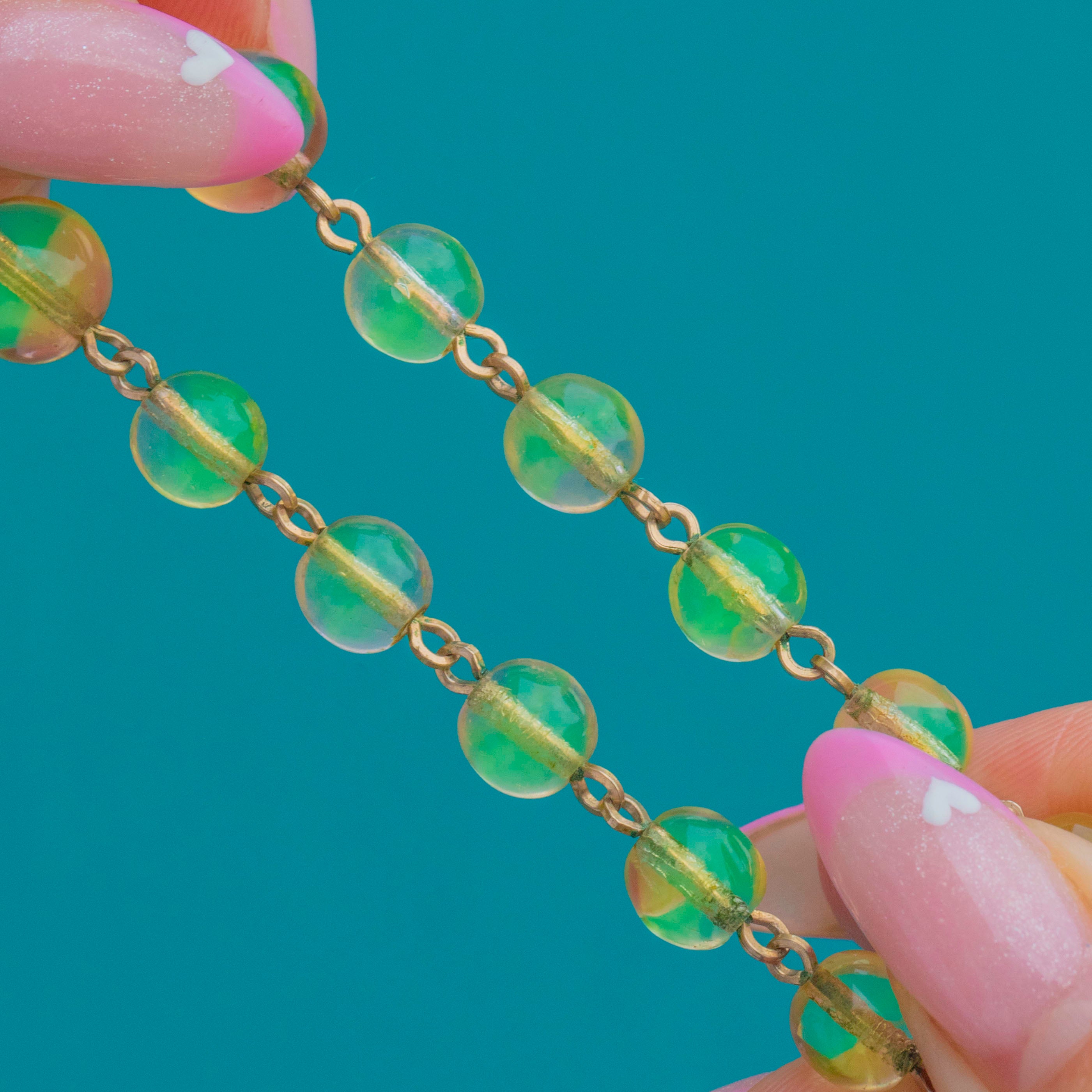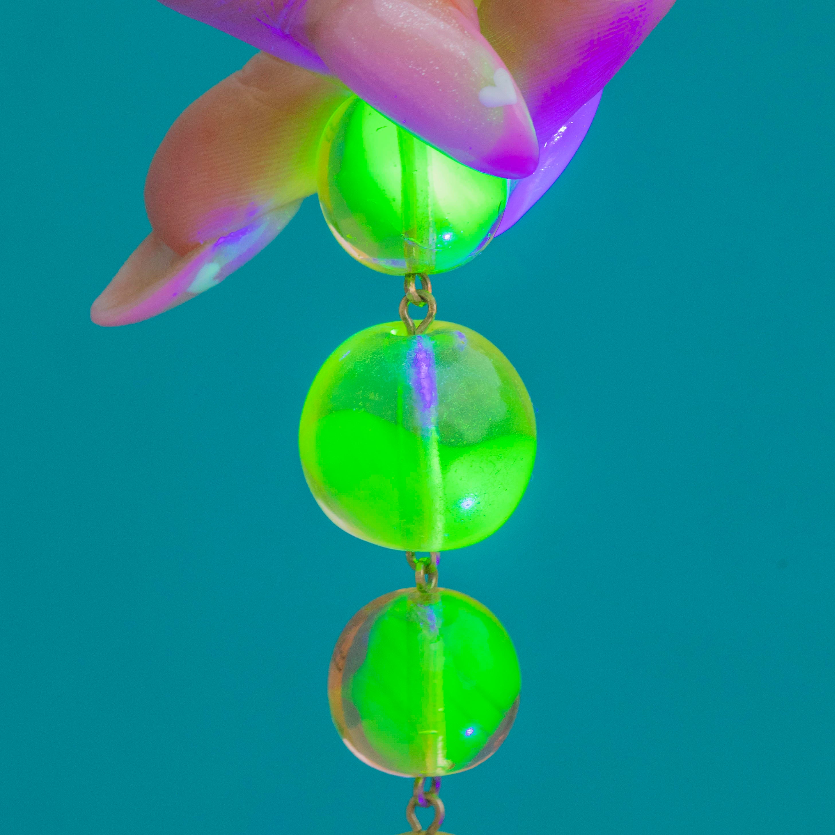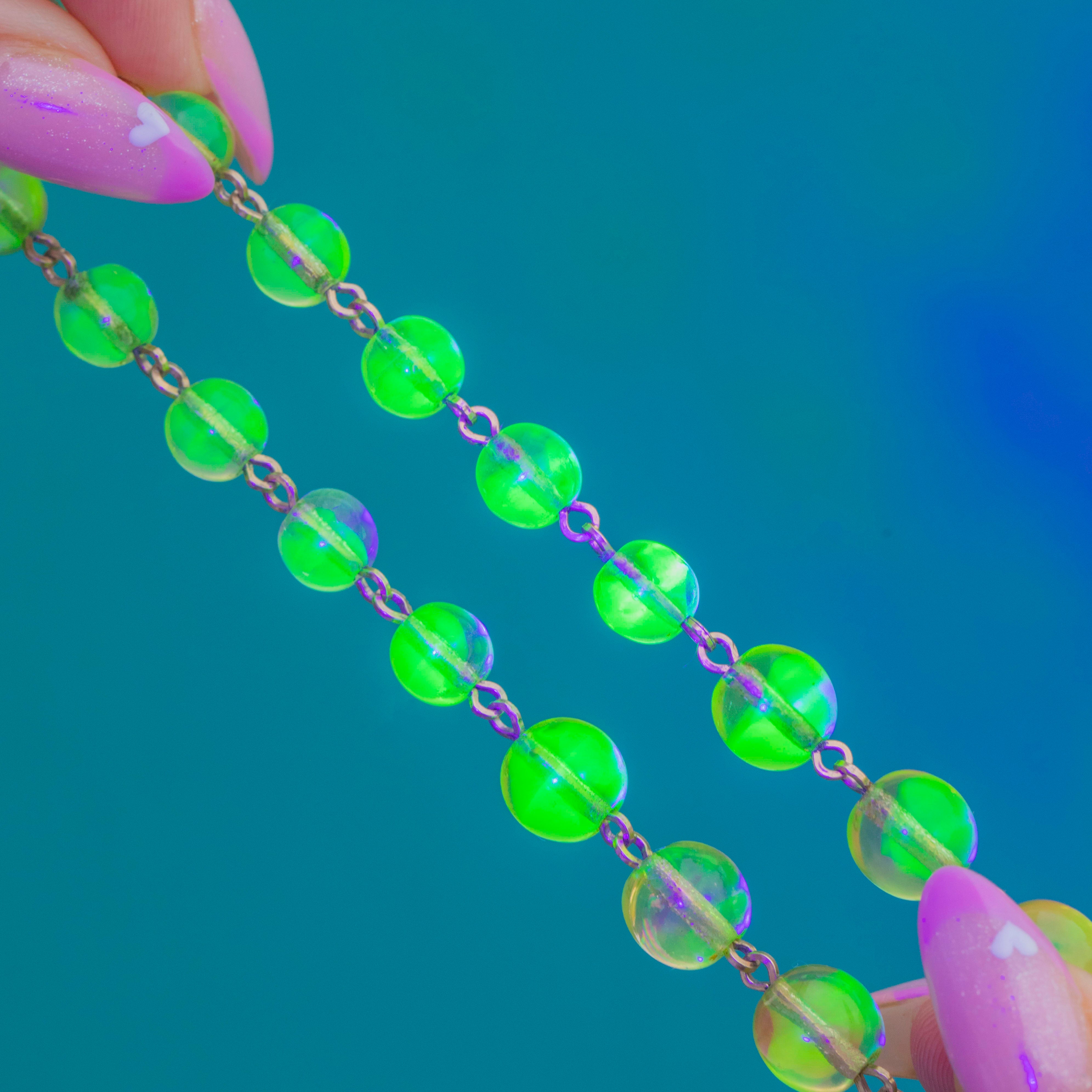 This vibrant Art Deco necklace glows with eye-catching Uranium glass beads that come alive under UV light.