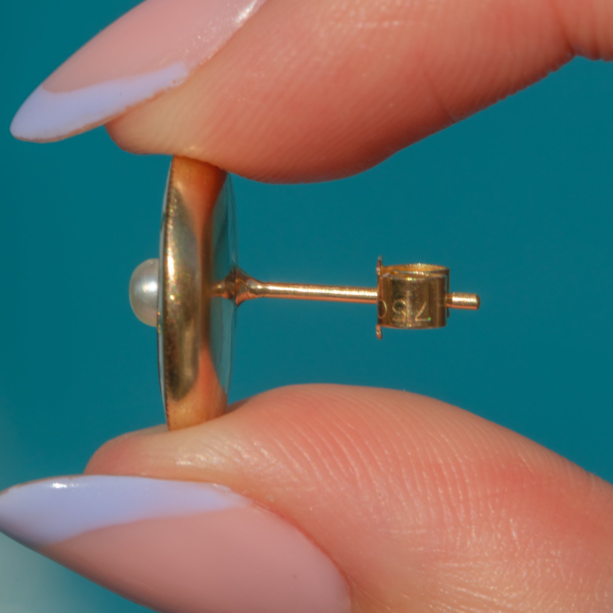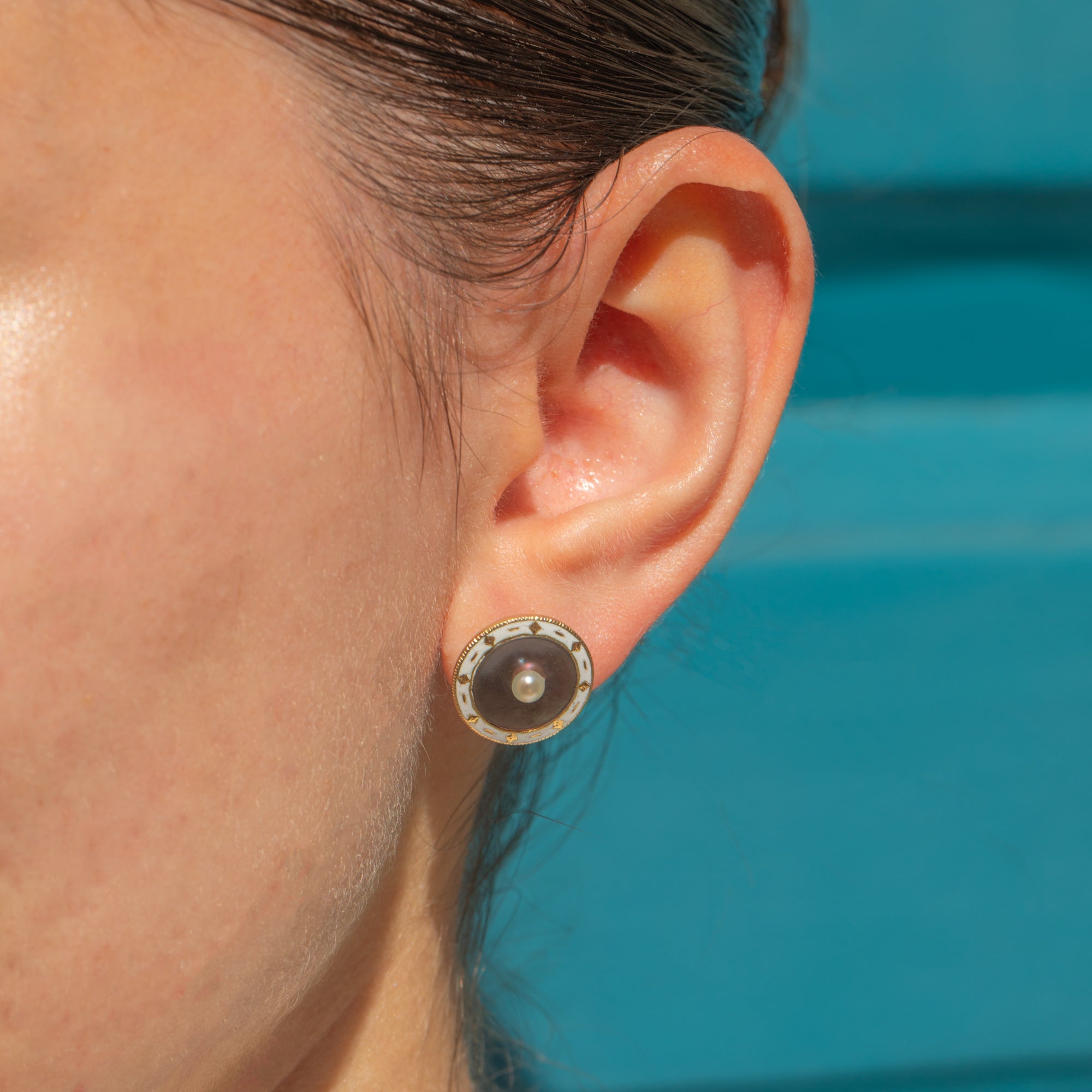 Crafted from buttery 18ct Gold, these round studs are adorned with a creamy Pearl, complemented beautifully by the iridescence of her surrounding shimmery lilac mother of Pearl. These antique studs are complete with a white Enamel border encircling the Pearl, with added Gold detail providing a wonderful texture.