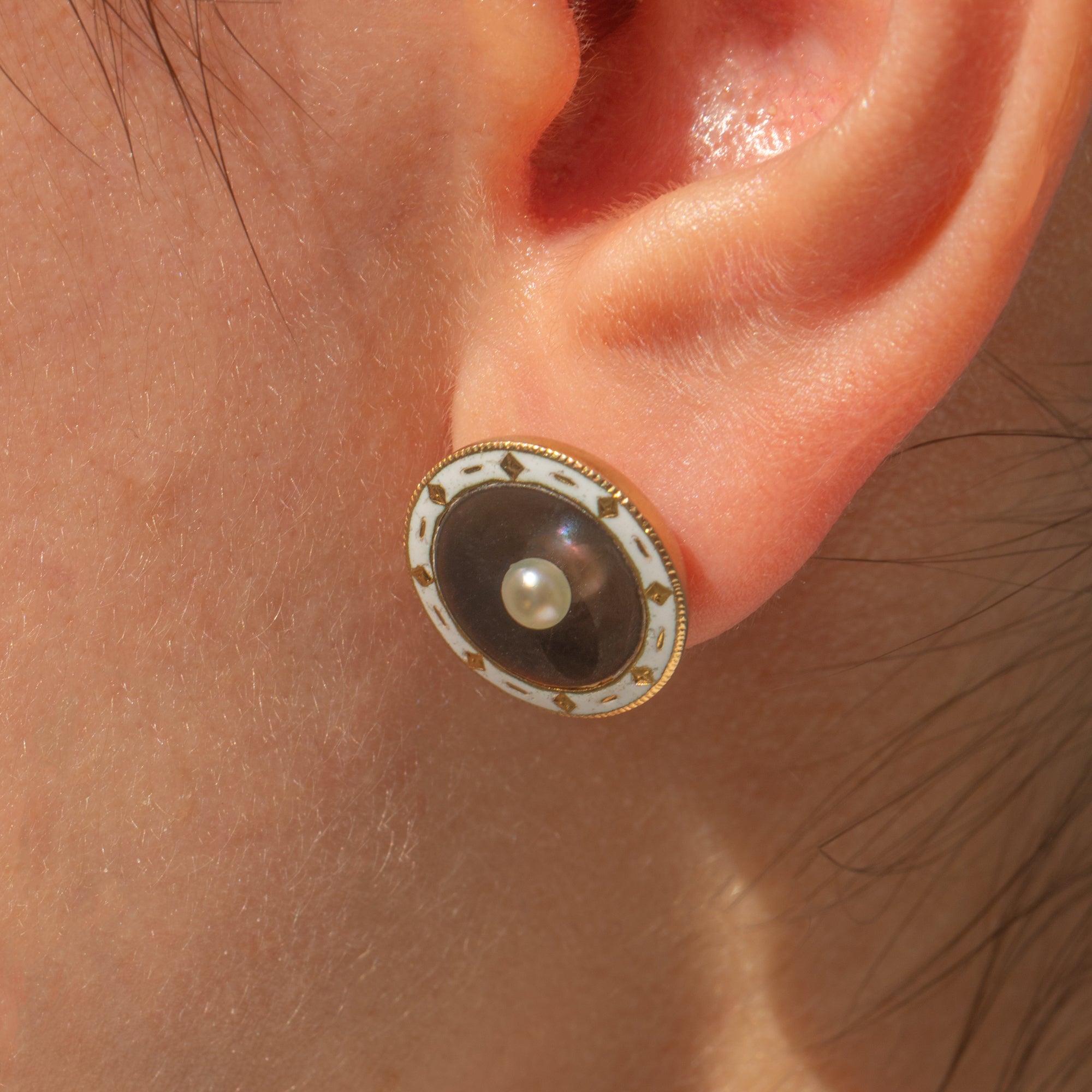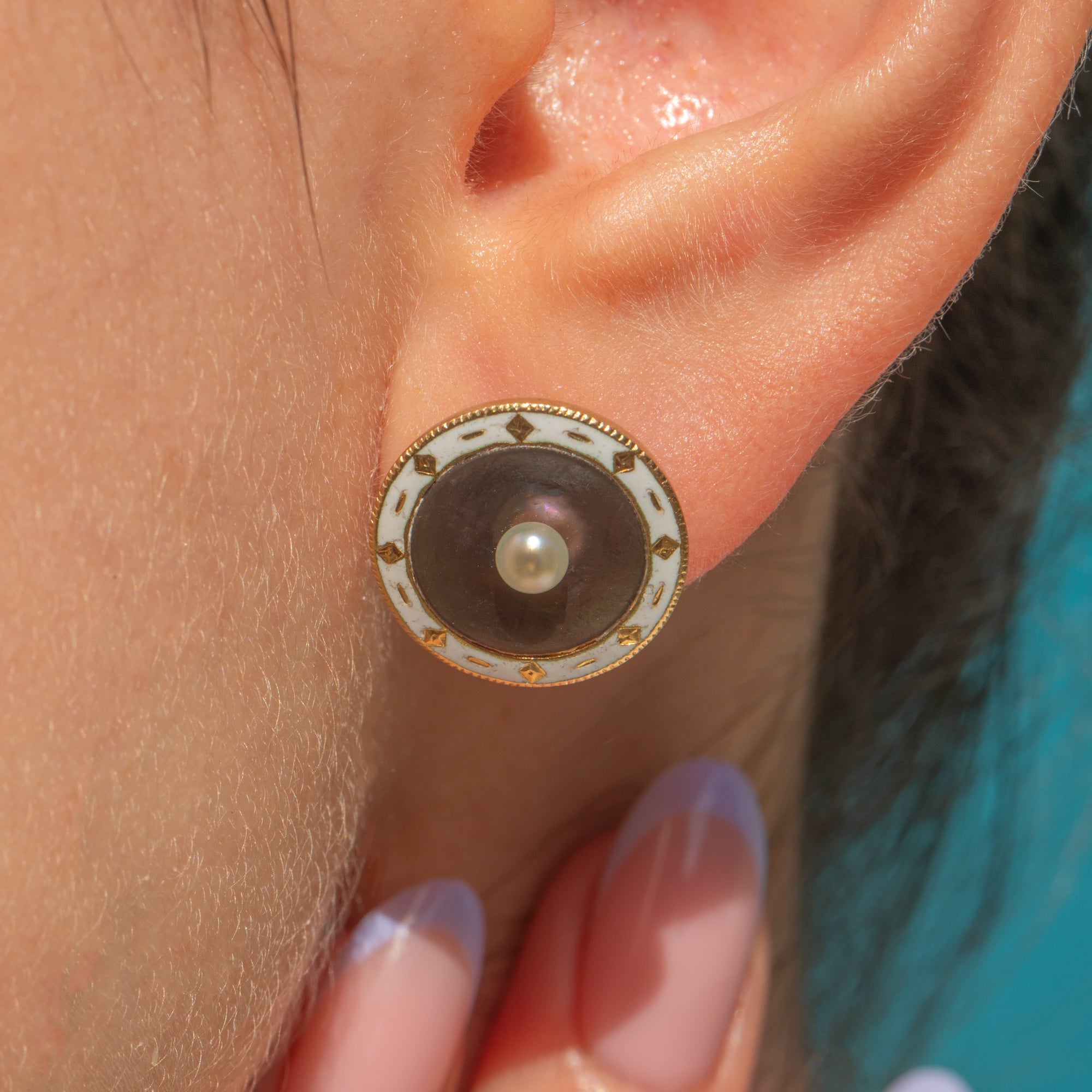 EXCELLENT: These Art Deco white Enamel Mother of Pearl stud earrings are in excellent condition. The Pearls are securely affixed and the Gold is glossy, with only minor surface wear present throughout. With secure butterfly backs, you can wear these Art Deco studs with confidence!