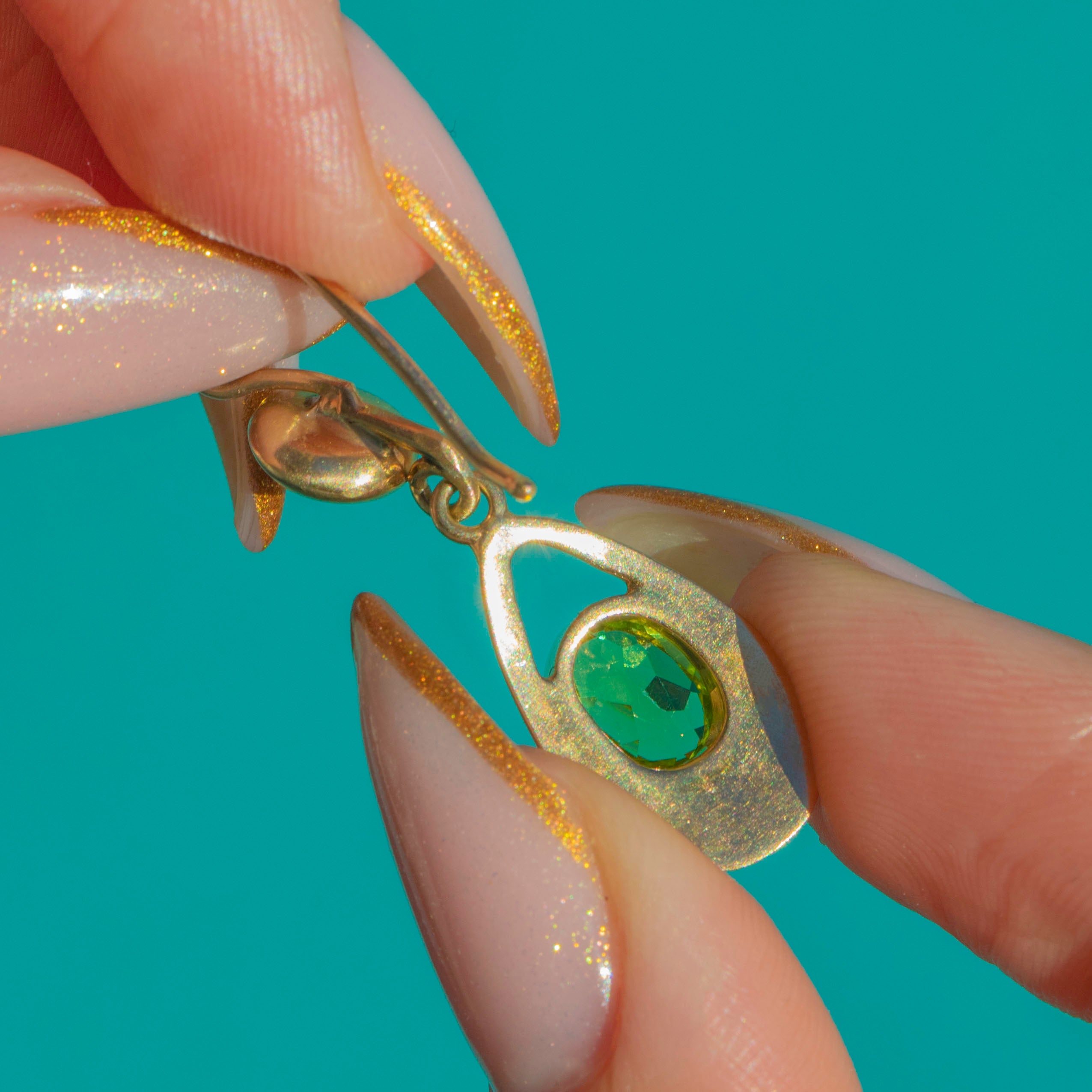 These dreamy Art Nouveau drop earrings are all about movement, line and luminous colour. Crafted in rich 14ct Gold, each earring features an open teardrop frame that curves gracefully around a vivid green Peridot, creating that soft, organic silhouette the era is so loved for.