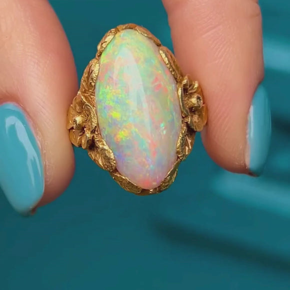 We are swooning over the sheer beauty of this Art Nouveau 15ct Gold Opal cabochon ring! Behold her 4.10ct Opal cabochon, with iridescent shimmers beyond your imagination, possessing a captivating beauty you will never tire of.