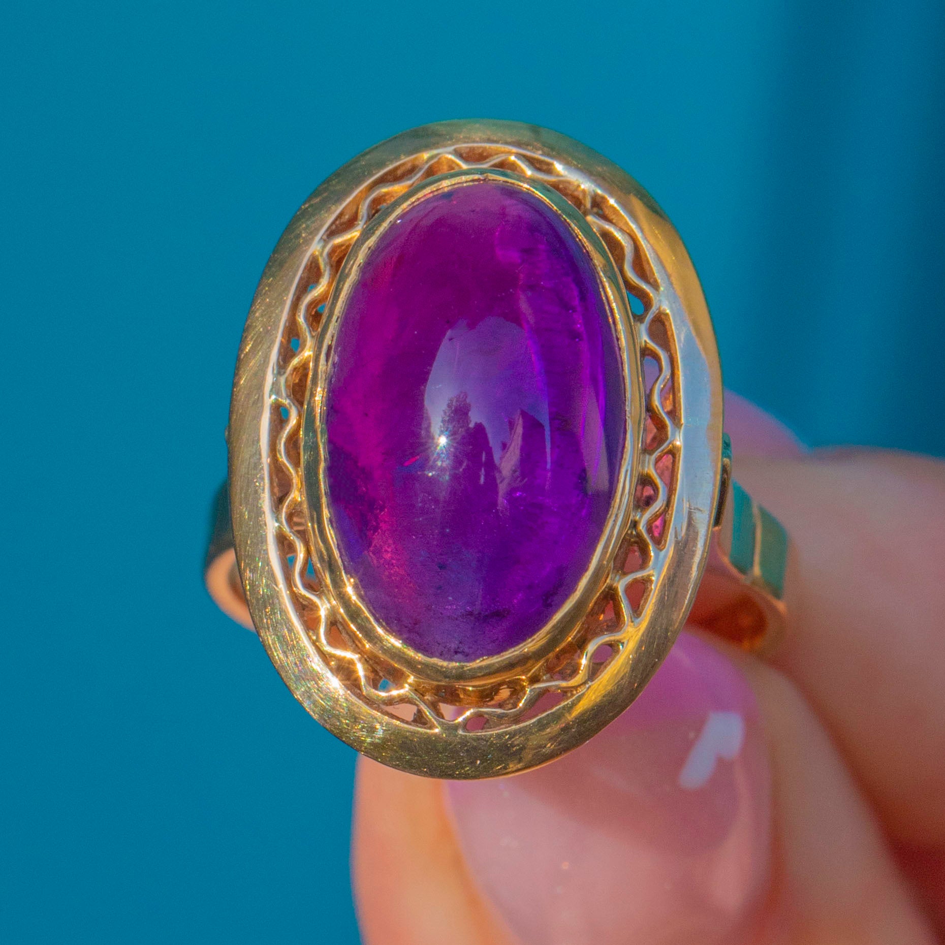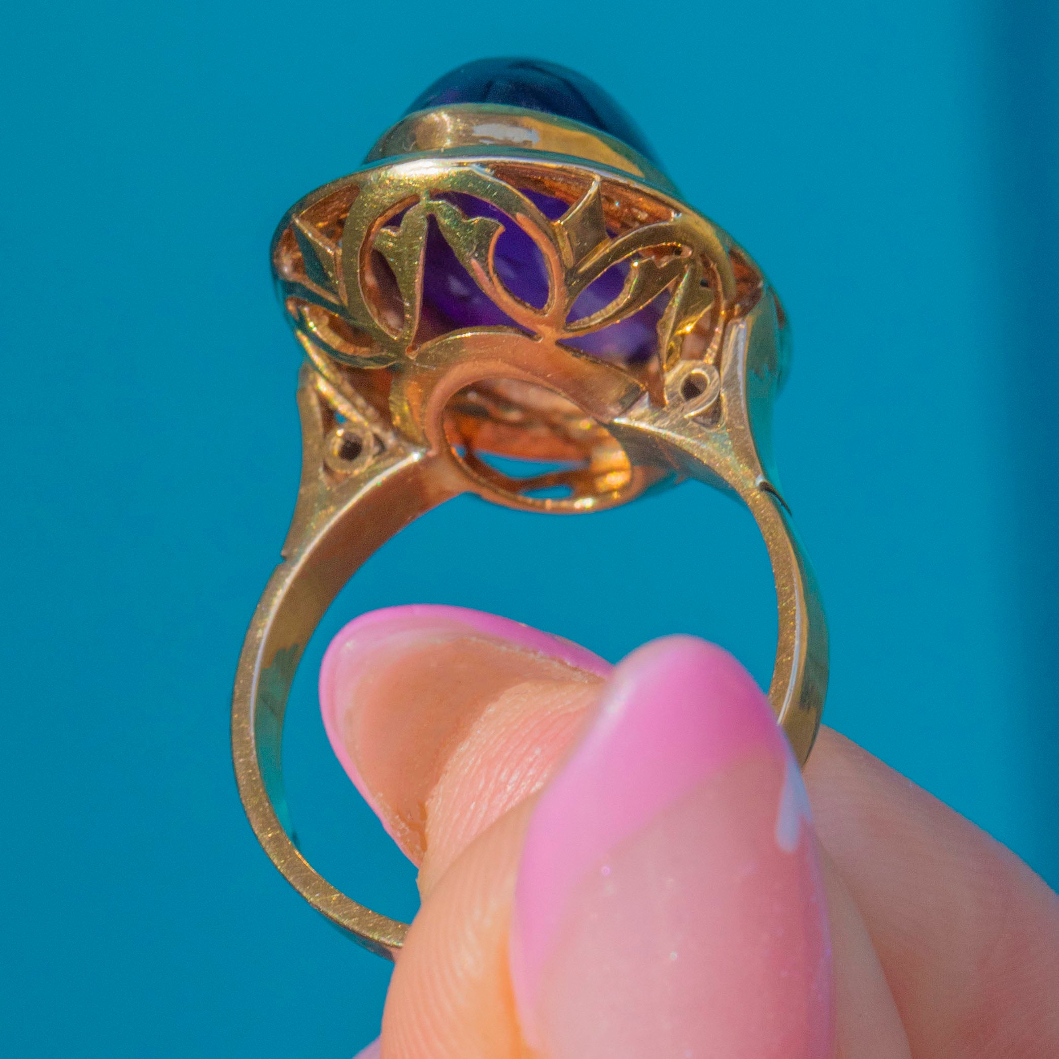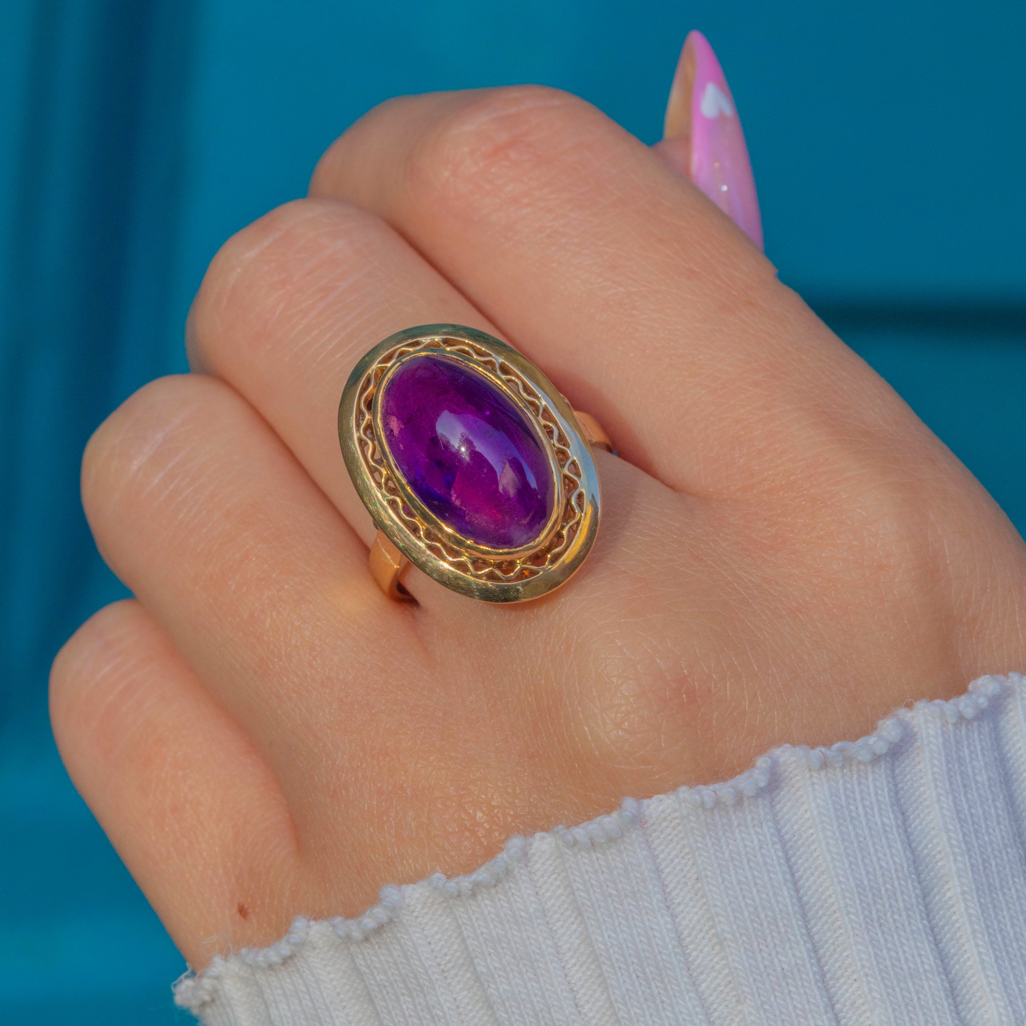 EXCELLENT: The striking Amethyst is an impressive size, vibrant colour and free from chips or scratches. The gem is smooth and glossy with lots of light and life within the stone. The solid 18ct Gold mount is sturdy enough to wear often, (or even daily!) and retains its bright, polished finish.