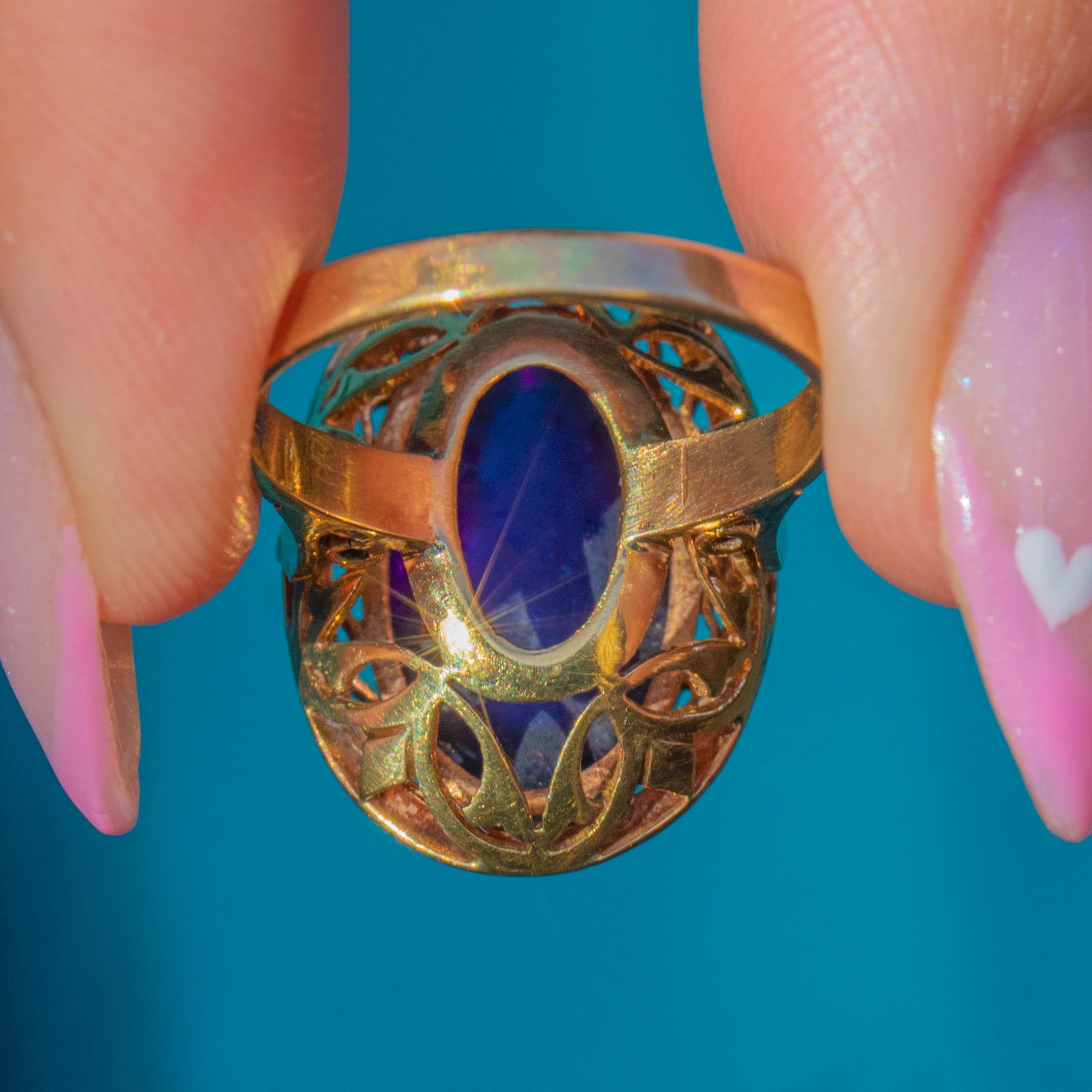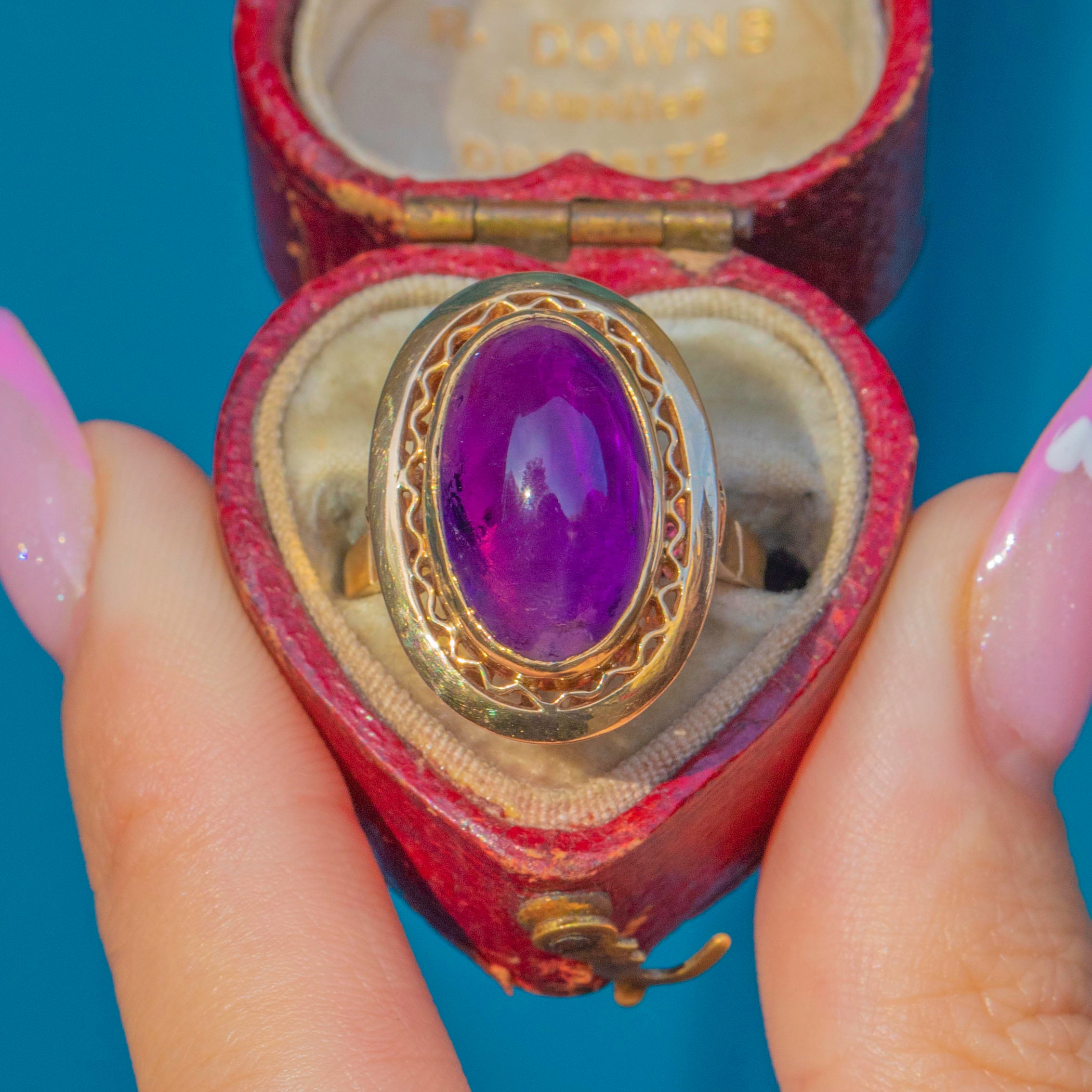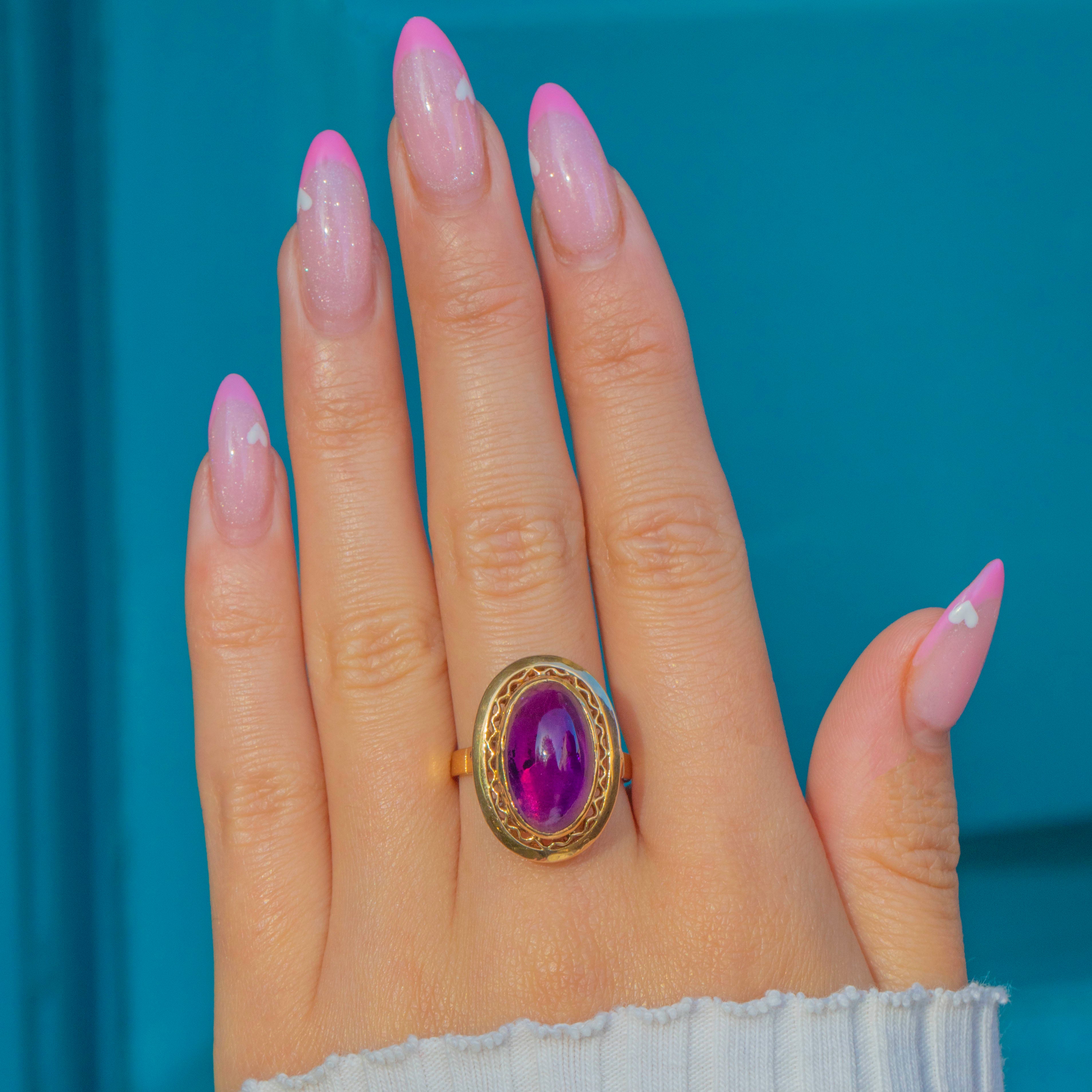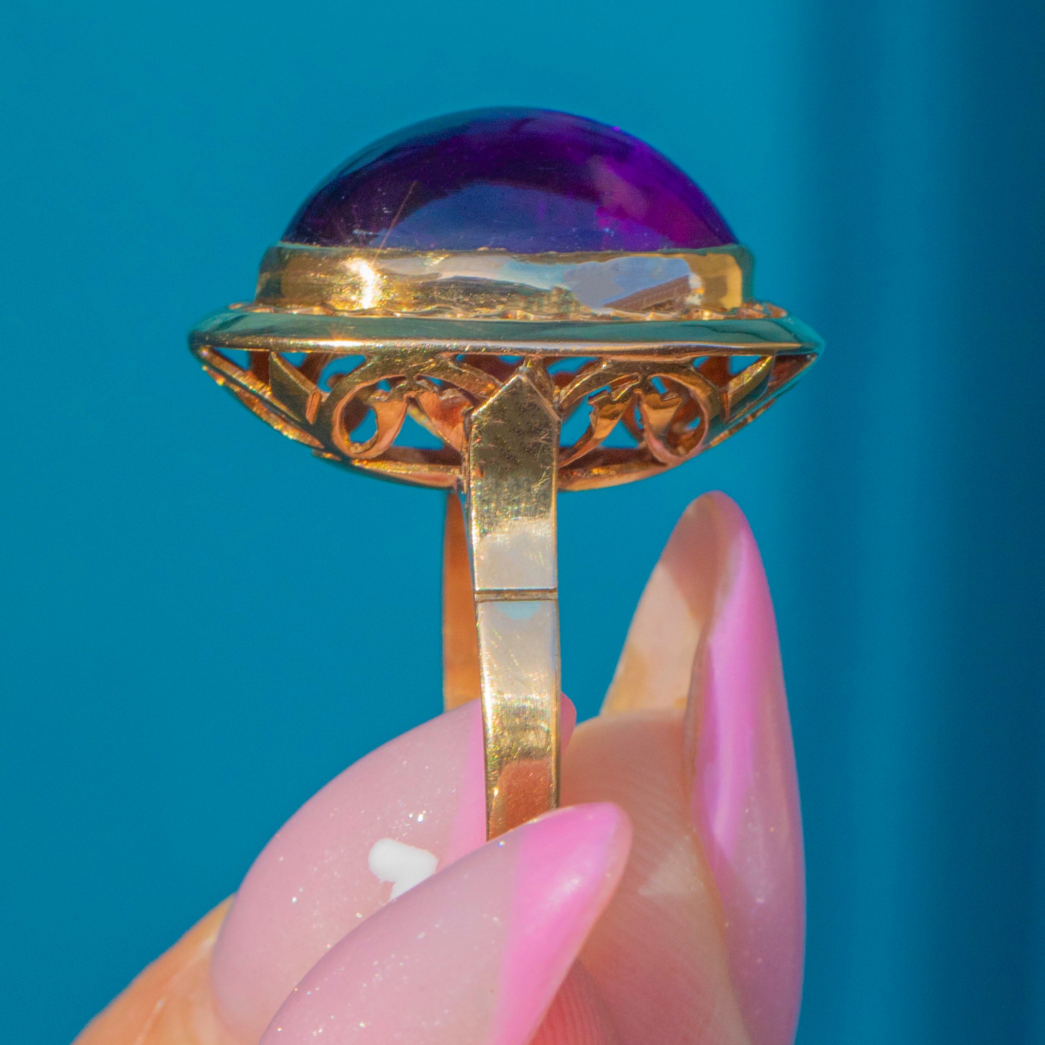 EXCELLENT: The striking Amethyst is an impressive size, vibrant colour and free from chips or scratches. The gem is smooth and glossy with lots of light and life within the stone. The solid 18ct Gold mount is sturdy enough to wear often, (or even daily!) and retains its bright, polished finish.