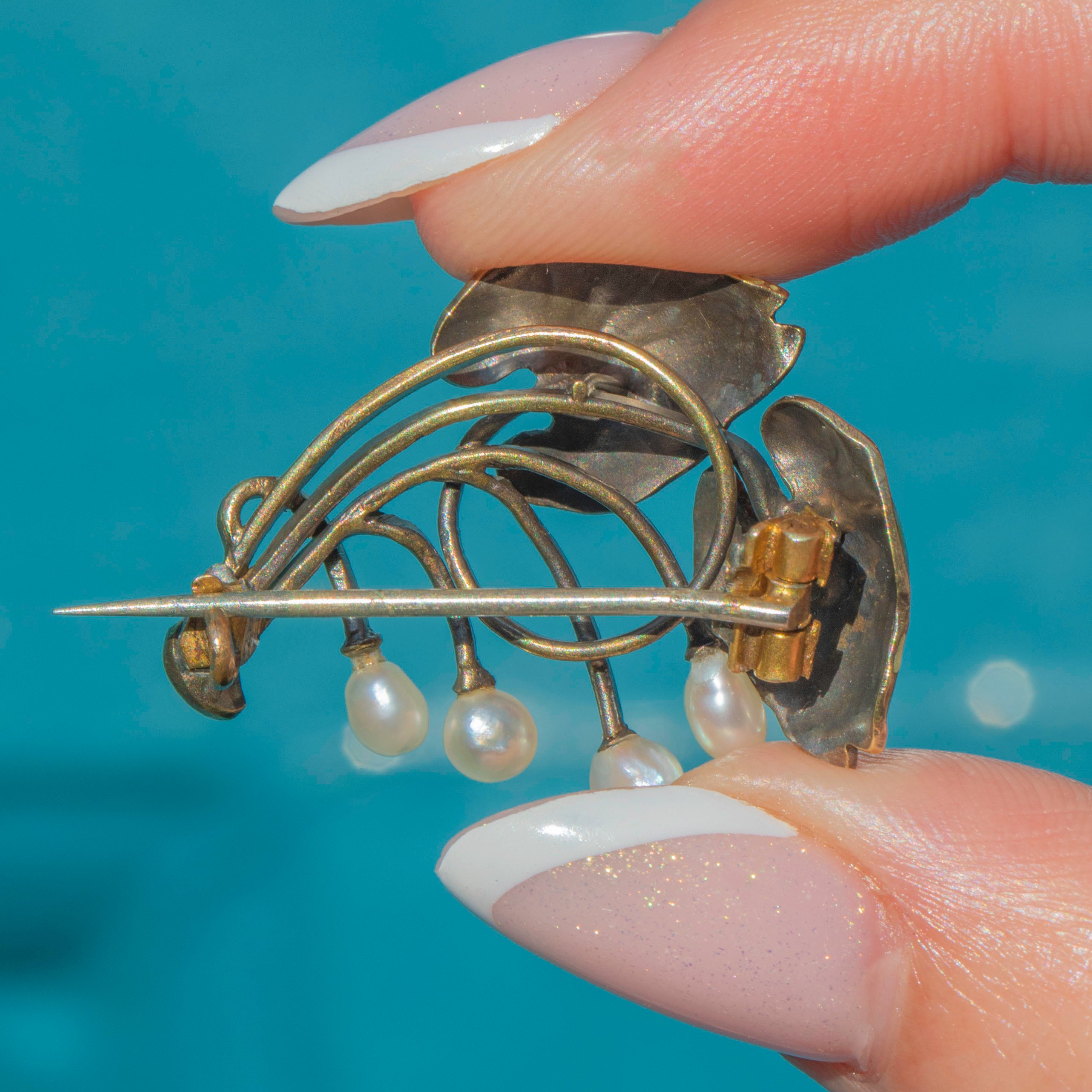 This Art Nouveau 18ct Gold Enamel Pearl brooch is a unique treasure! Curvaceous vines of 18ct Gold form this whimsical piece, proudly displaying shimmering white Pearls and striking Enamel lily pads.