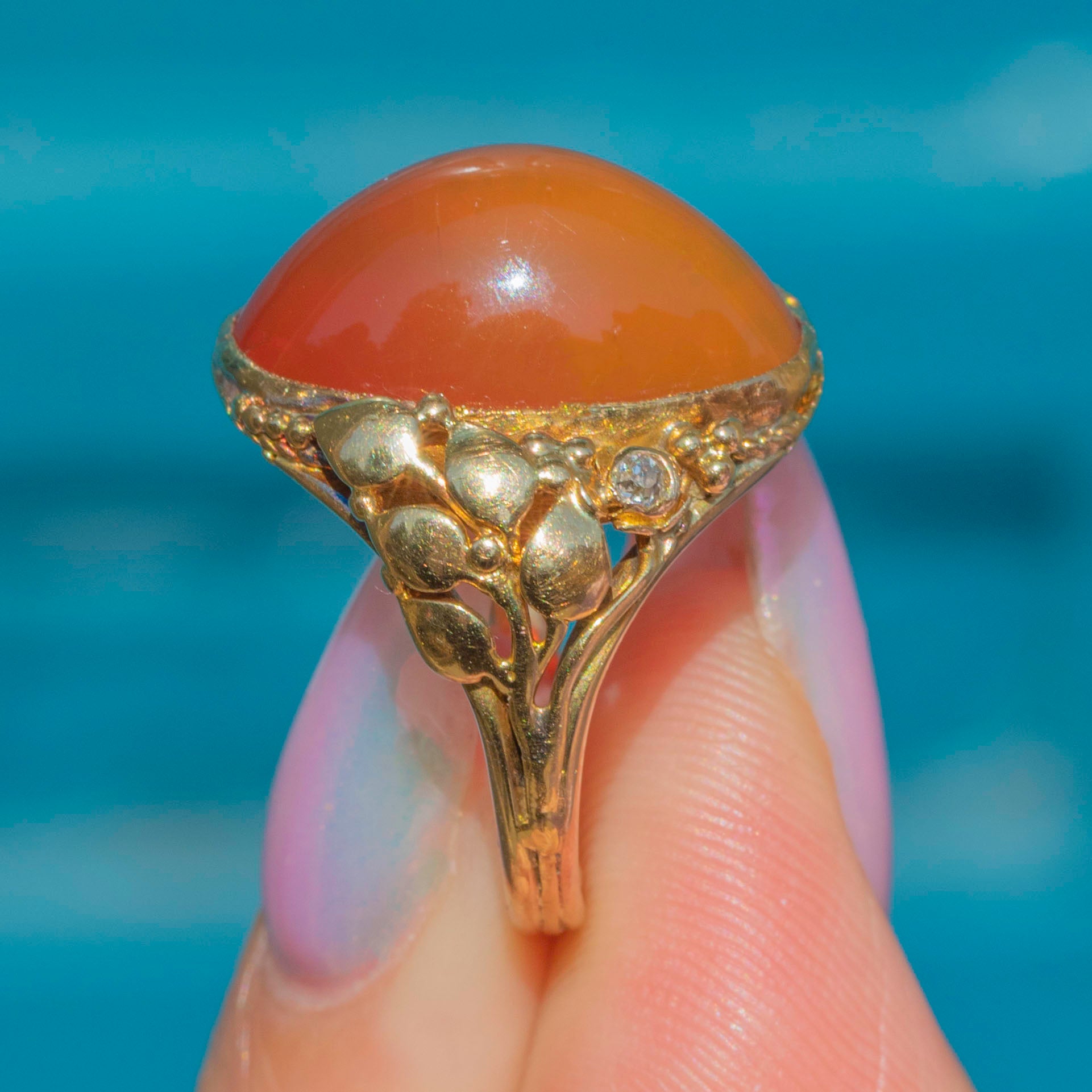 Art Nouveau 18ct Gold Fire Opal Cabochon Diamond Ring, 5.60ct Natural Solid Fire Opal