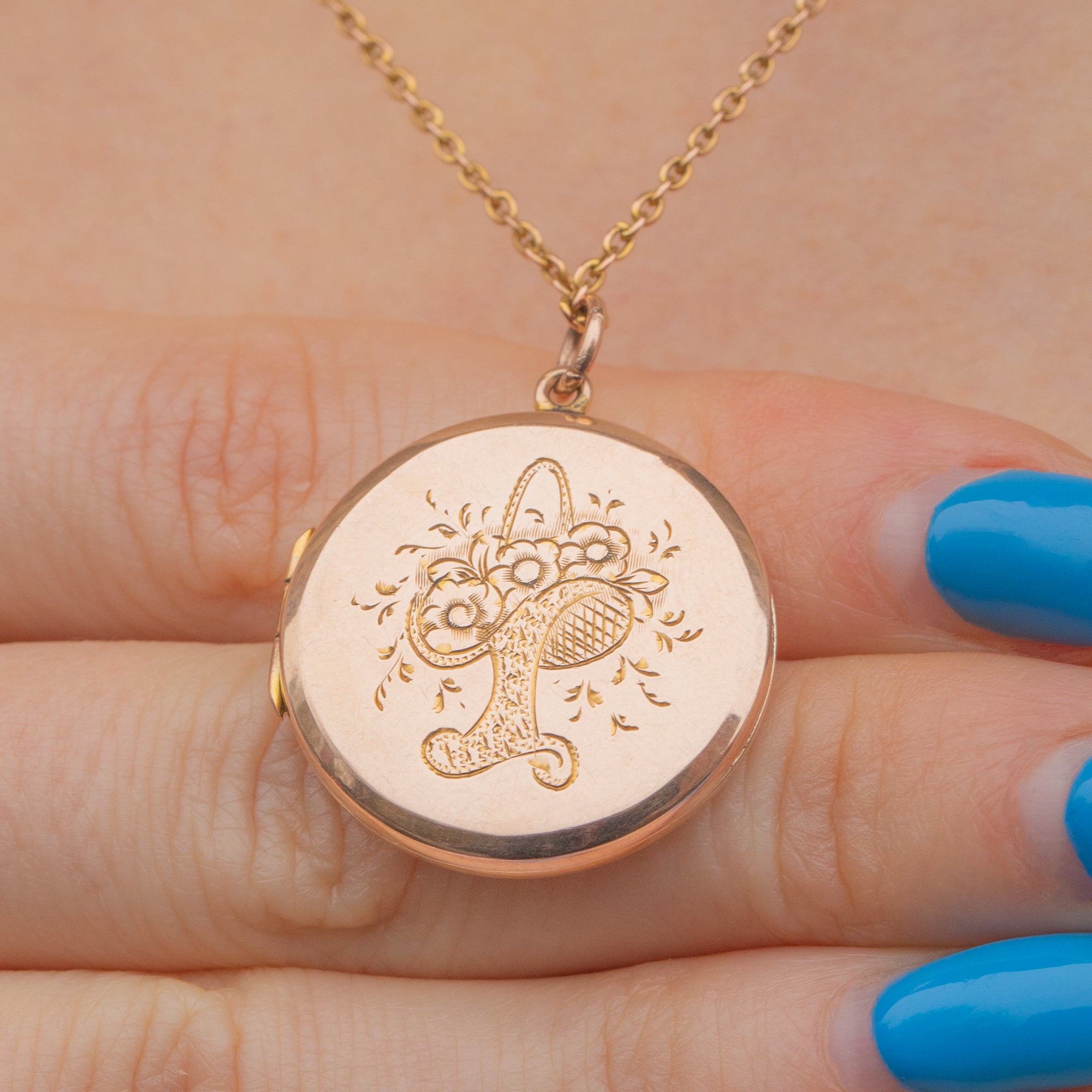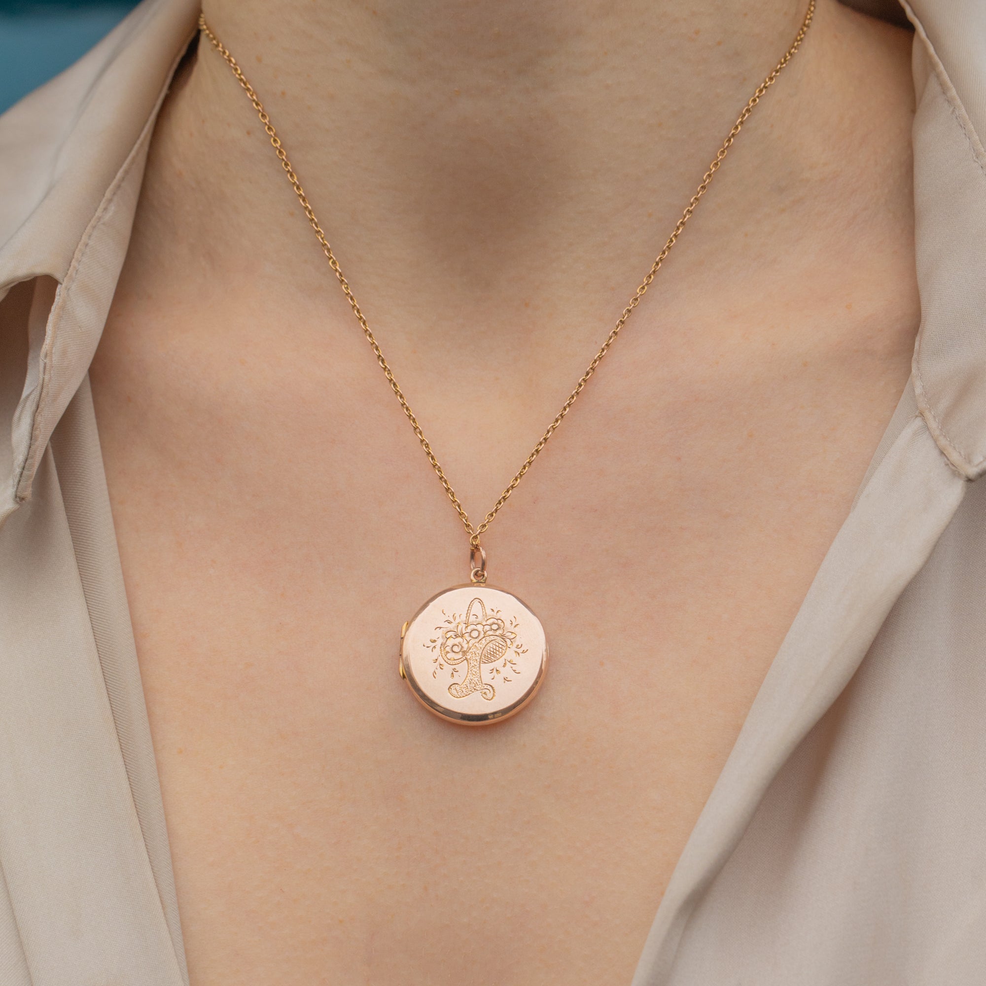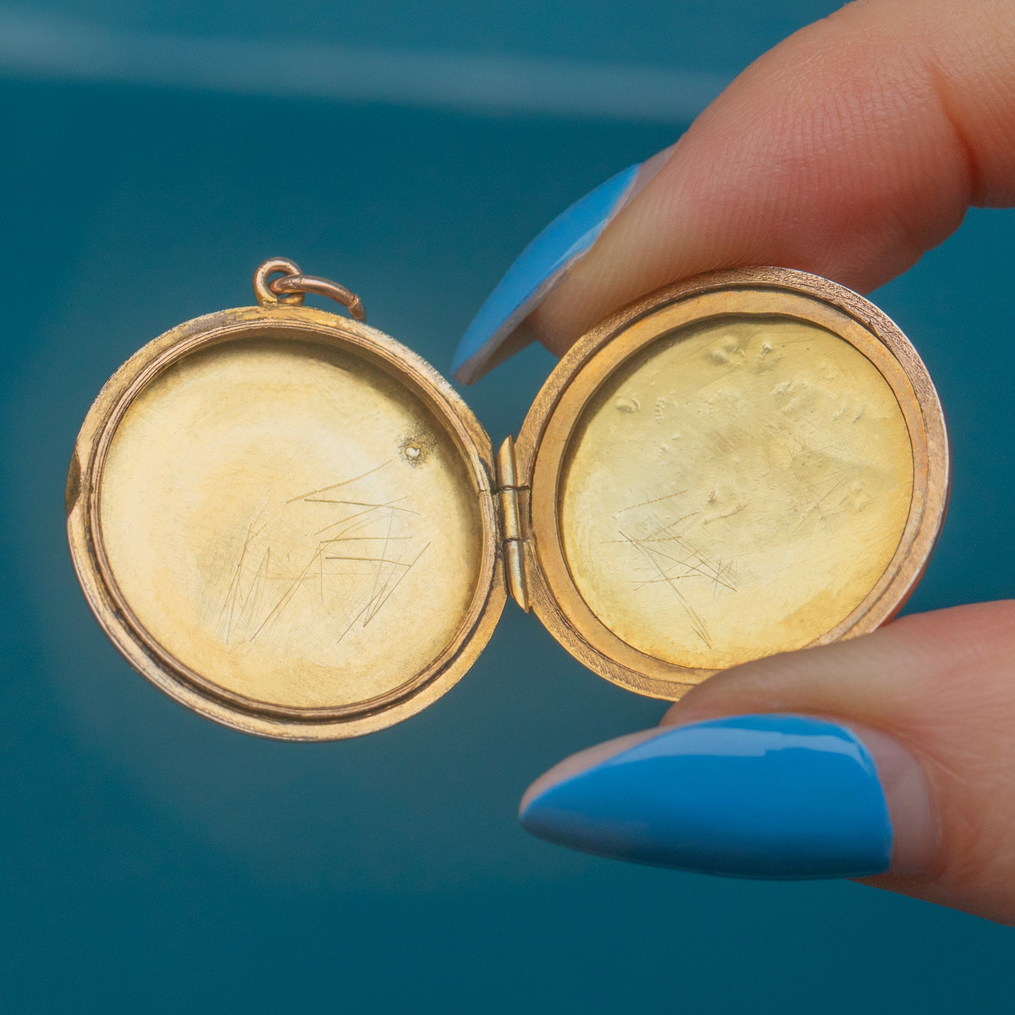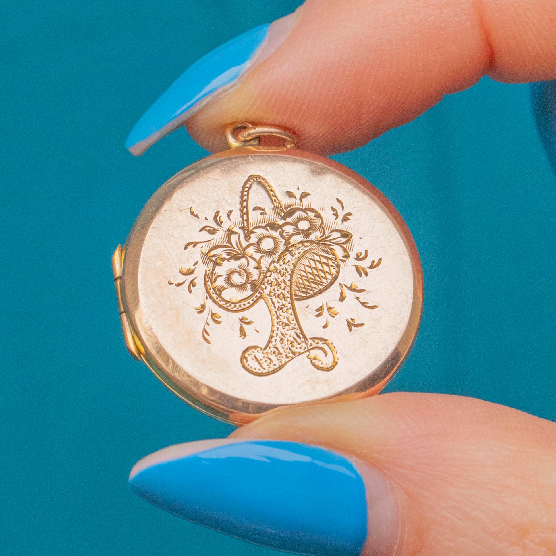 VERY GOOD-EXCELLENT. This Art Nouveau 9ct Gold bouquet of flowers round locket is in lovely antique condition! The Gold has an even, buttery hue throughout and the engraved details have remained crisp on both sides. The locket doors are smooth and free from dings with only a few minor scratches inside the locket, likely from a previous purity testing. The doors close firmly promising many more years of wear and enjoyment!