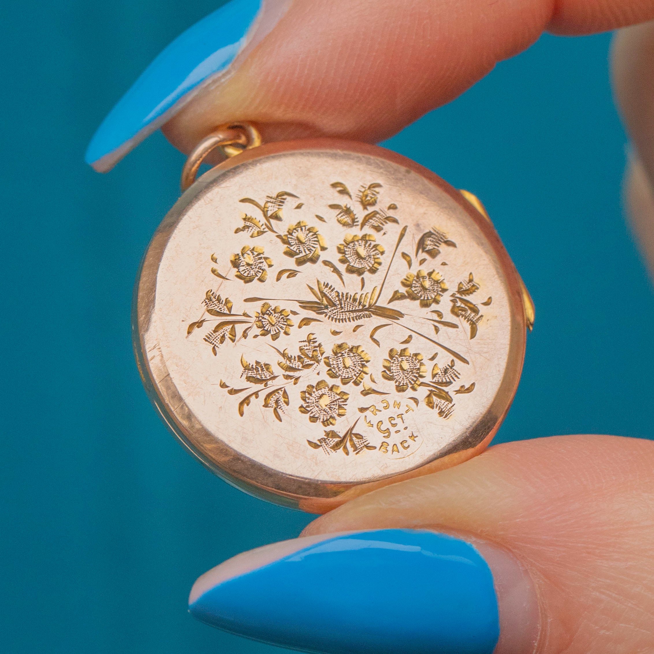 Steeped in romantic sentiment, this glorious Art Nouveau 9ct Gold bouquet of flowers round locket is bursting with antique allure! Crafted from luscious 9ct Gold, both sides of this antique locket is inlaid with finely engraved floral details, each design different offering you two styles in one.