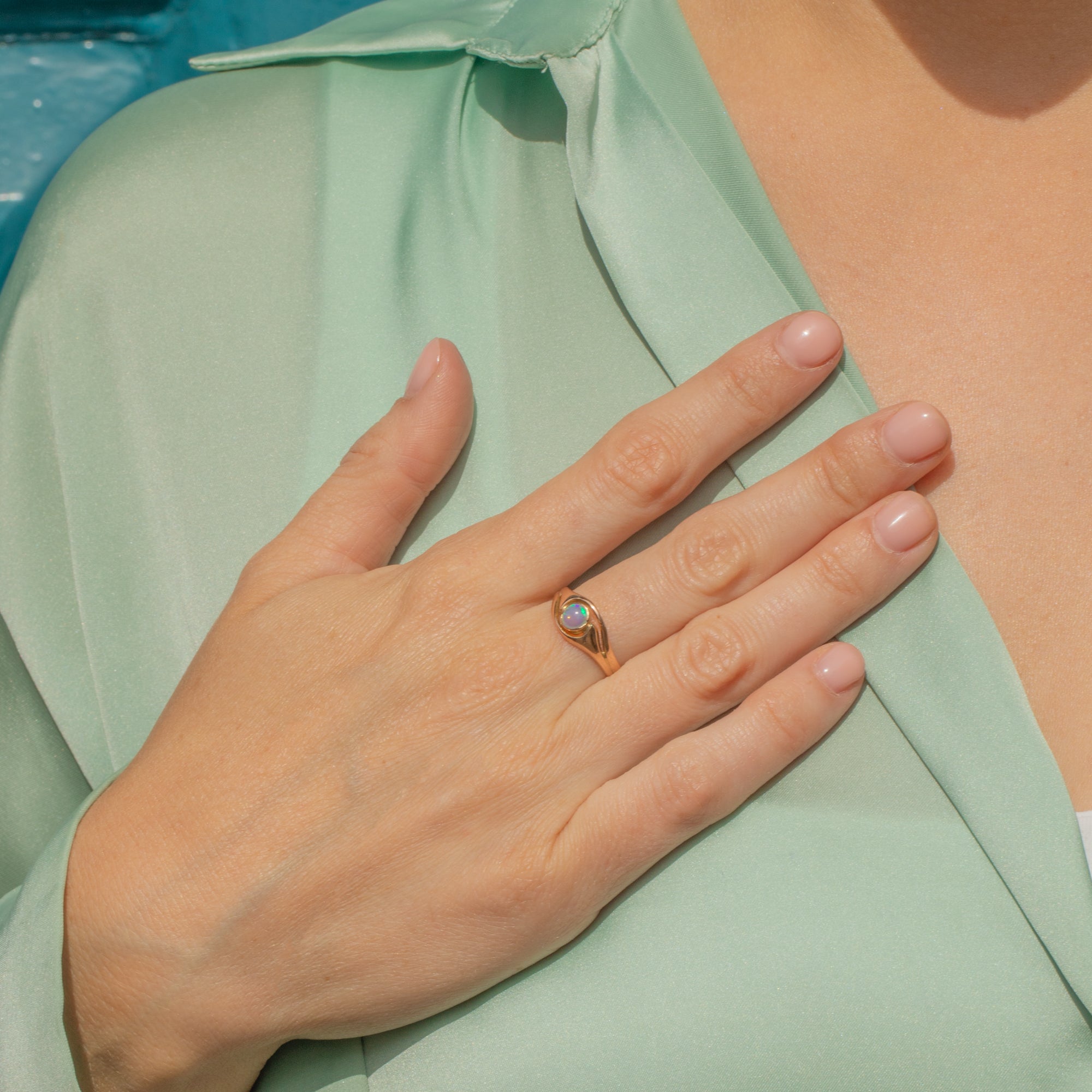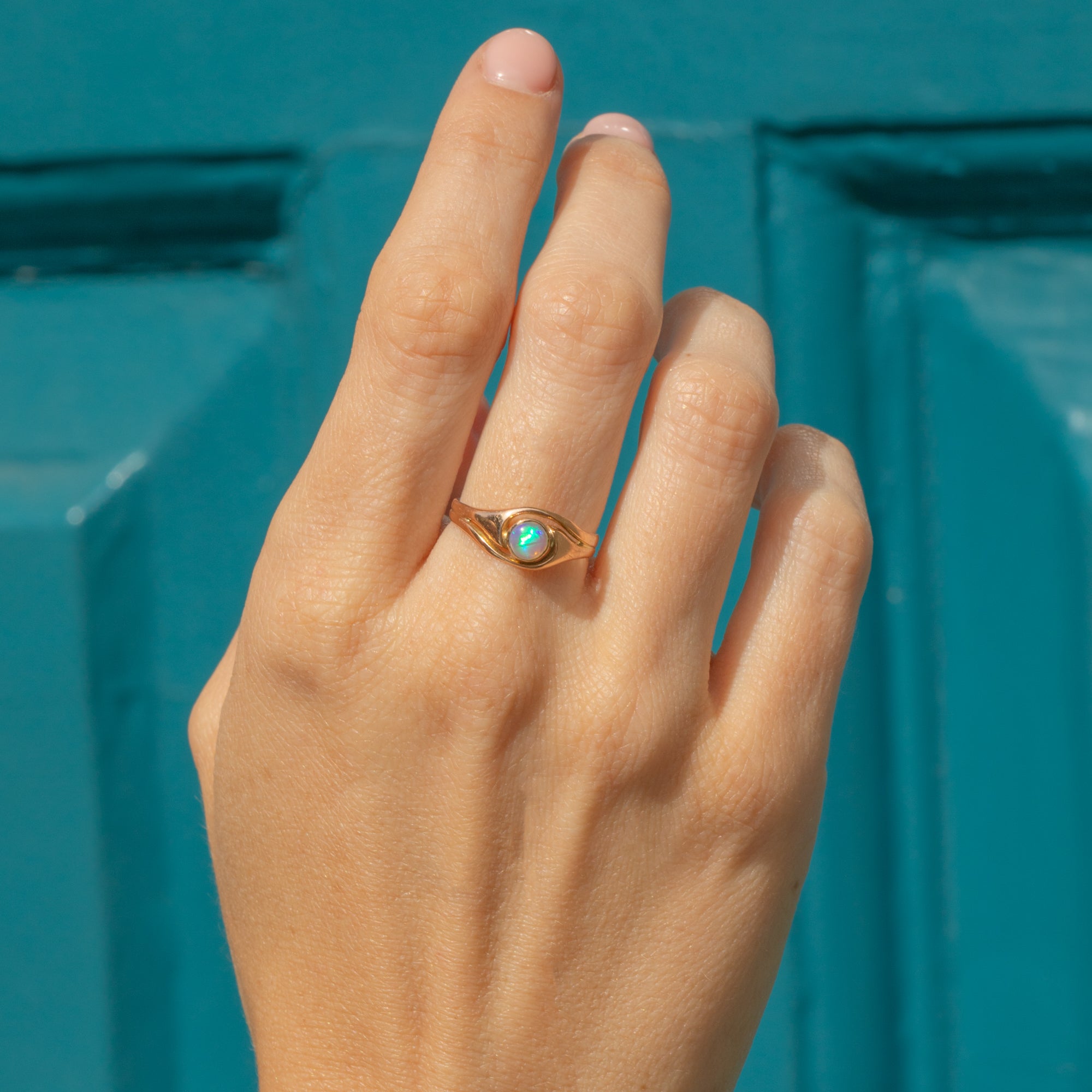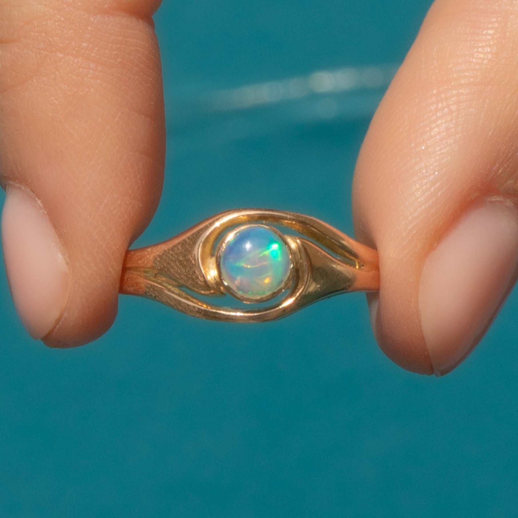 Upon the 9ct Gold throne sits an enchanting Opal with a spellbinding festival of colour, with electric greens, mesmerising blues and passionate oranges. The shapes and colours of this ring combined can be described as nothing short of ethereal!