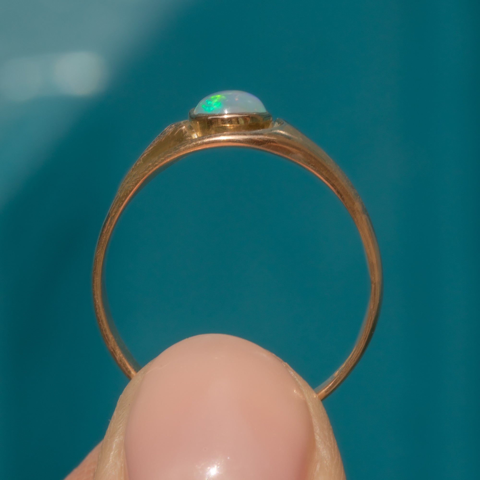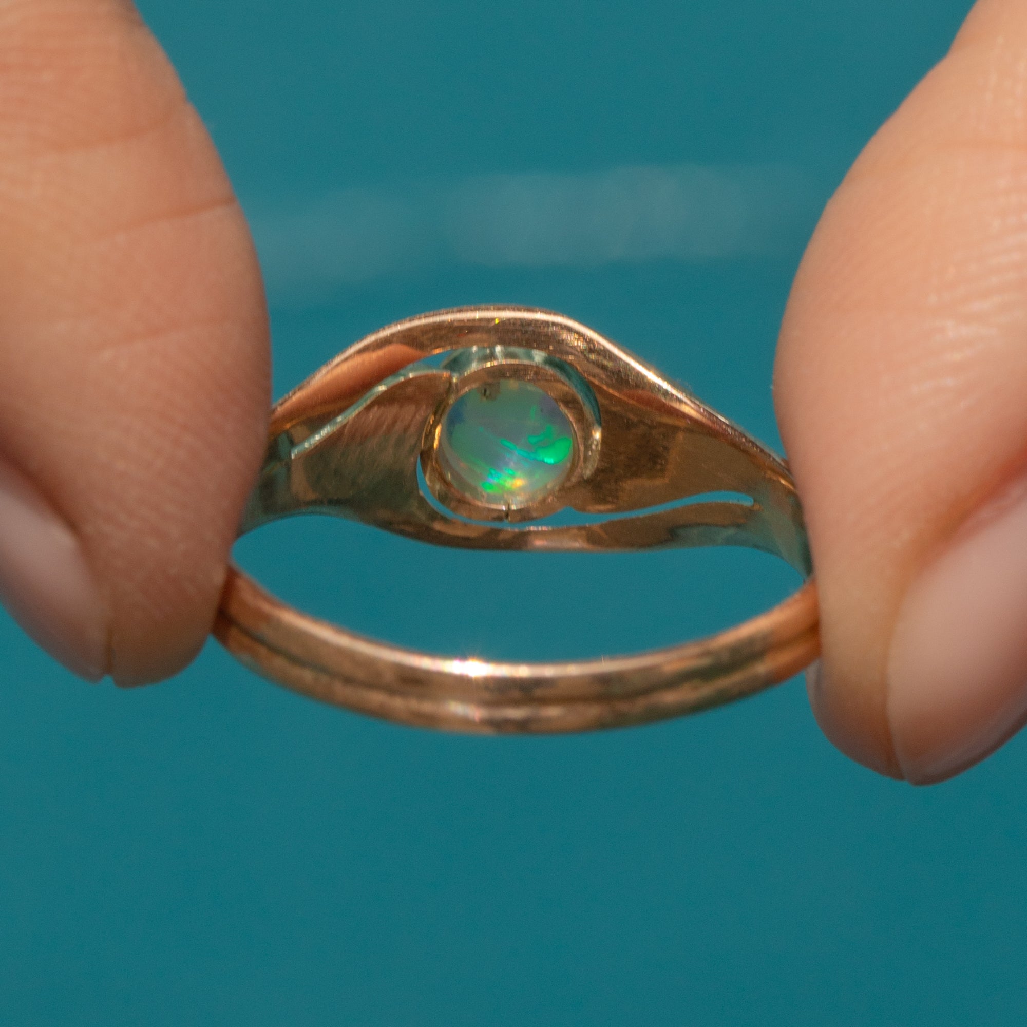 EXCELLENT. This Art Nouveau 9ct Gold Opal twist ring is in excellent condition. Her 9ct Gold is beautifully preserved and glossy with her Opal securely set and free from wear. It is safe to say that this ring is just as beautiful today as when it was first created in the 1900s!