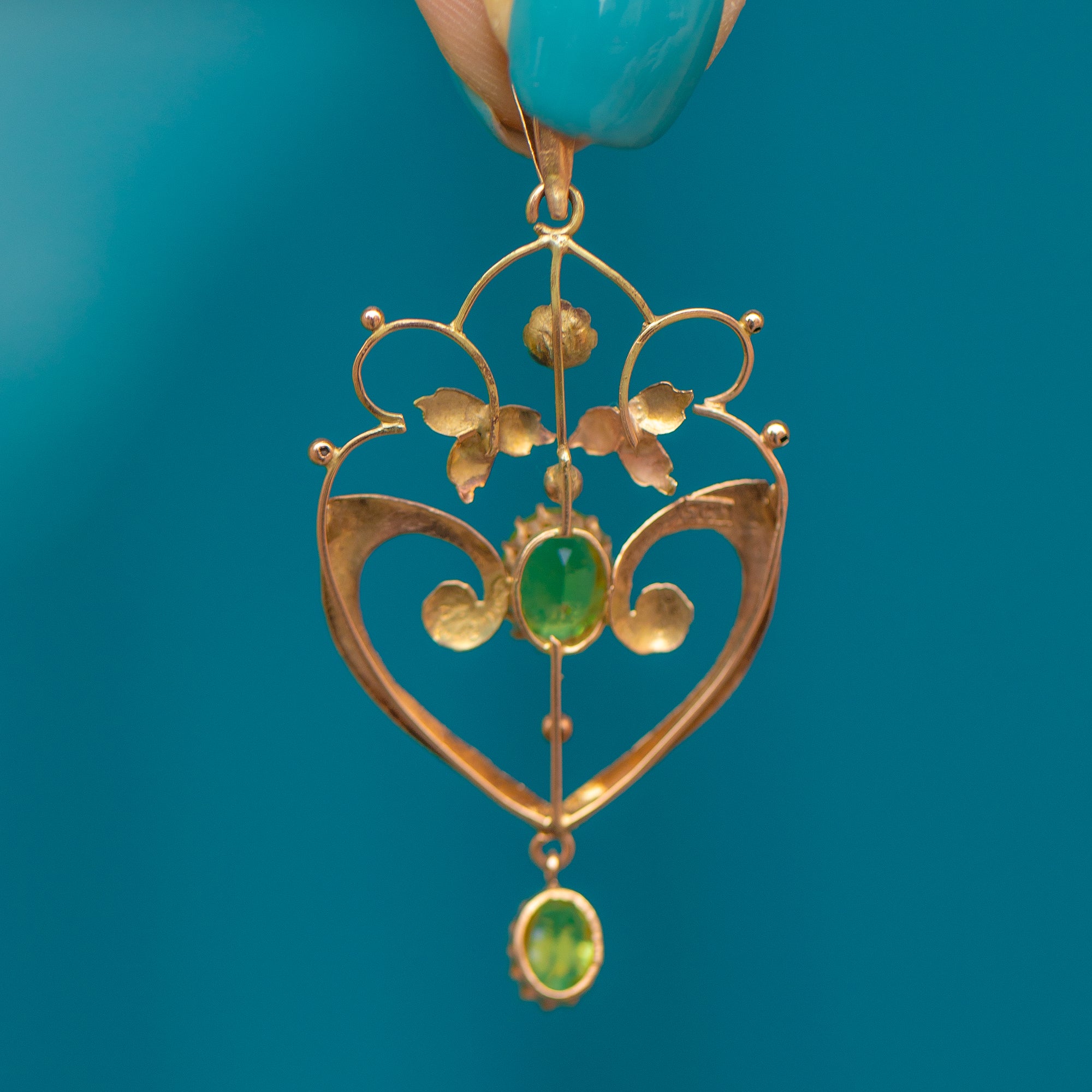 EXCELLENT. This Art Nouveau 9ct Gold Peridot lavalier pendant is in excellent condition! Each Peridot are secure within their settings, with not damage to note. The Gold is perfectly formed and possesses wonderful reflective qualities. With a modestly sized jump-ring, you can suspend this Art Nouveau pendant from a variety of chains!