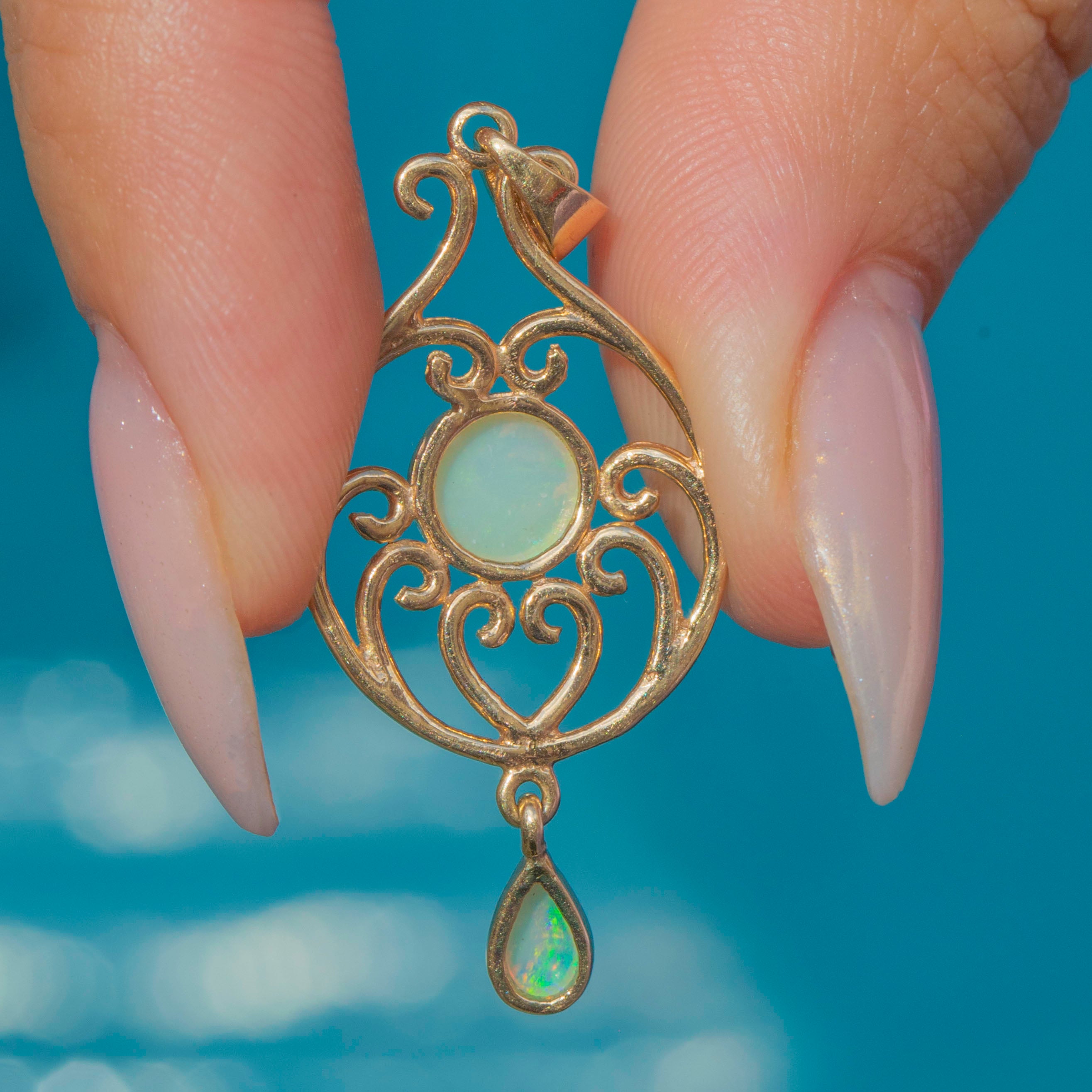 A striking antique Opal pendant crafted in 9ct Yellow Gold, designed in the romantic Art Nouveau style. The openwork frame features graceful swirling motifs inspired by nature, centring on a glowing round Opal with vibrant flashes of neon green, blue and fiery orange. A pear-shaped Opal drop swings elegantly beneath, adding movement and a luminous finishing touch.