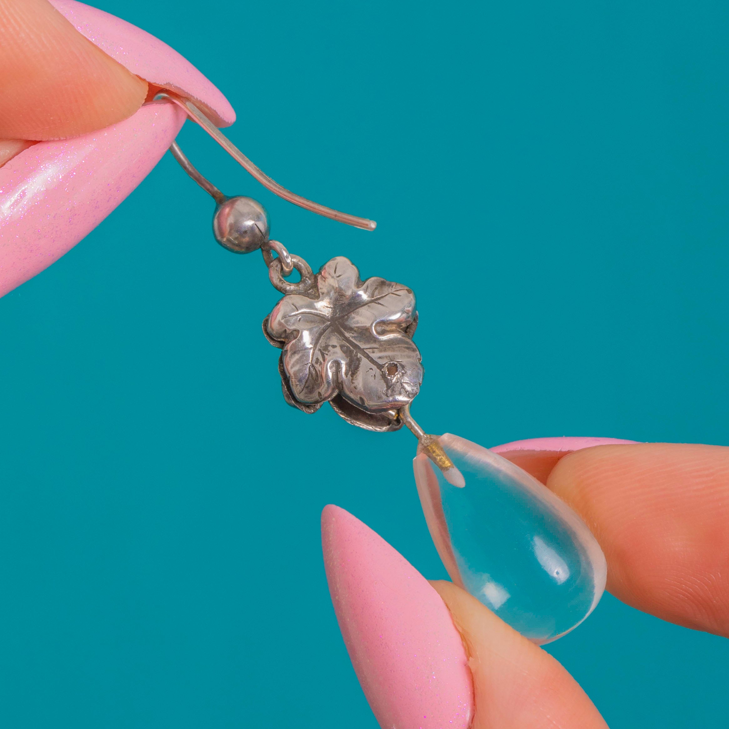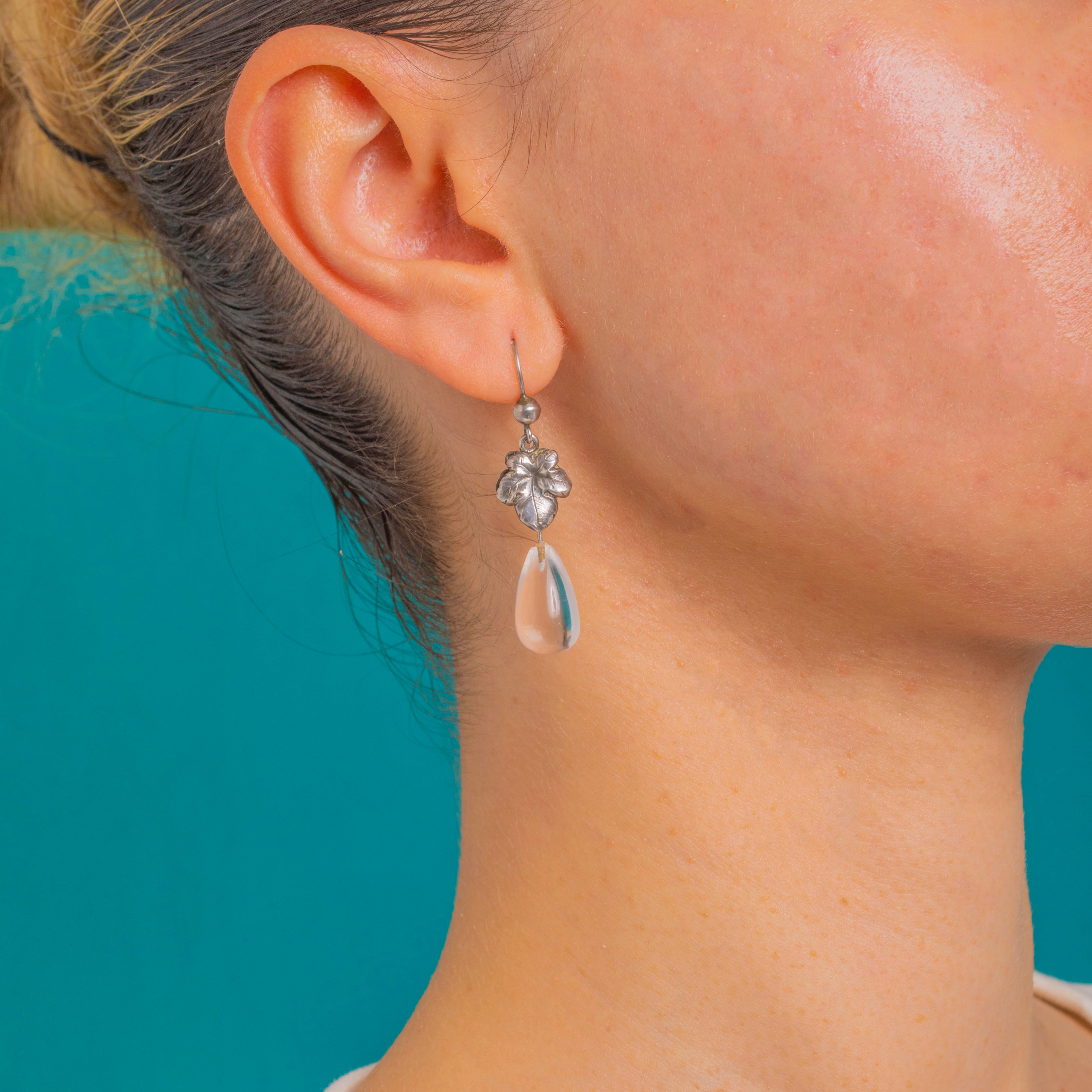 These Art Nouveau Rock Crystal drop earrings capture the movement and romance of the era. A repoussé fig leaf in Sterling Silver, rich with naturalistic veining, suspends a sleek, clear Rock Crystal teardrop that plays beautifully with the light. The gentle patina across the Silver adds a soft, antique glow.