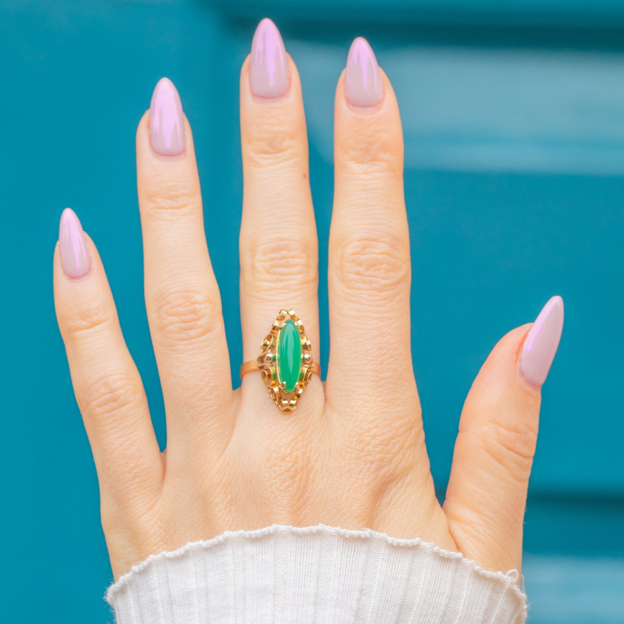 EXCELLENT: The green Chalcedony is smooth, glossy and free from damage and glowing bright! The solid 14ct Gold band is well-shaped and polished  well with a gorgeous buttery yellow hue and no re-size marks or thinning to the band.