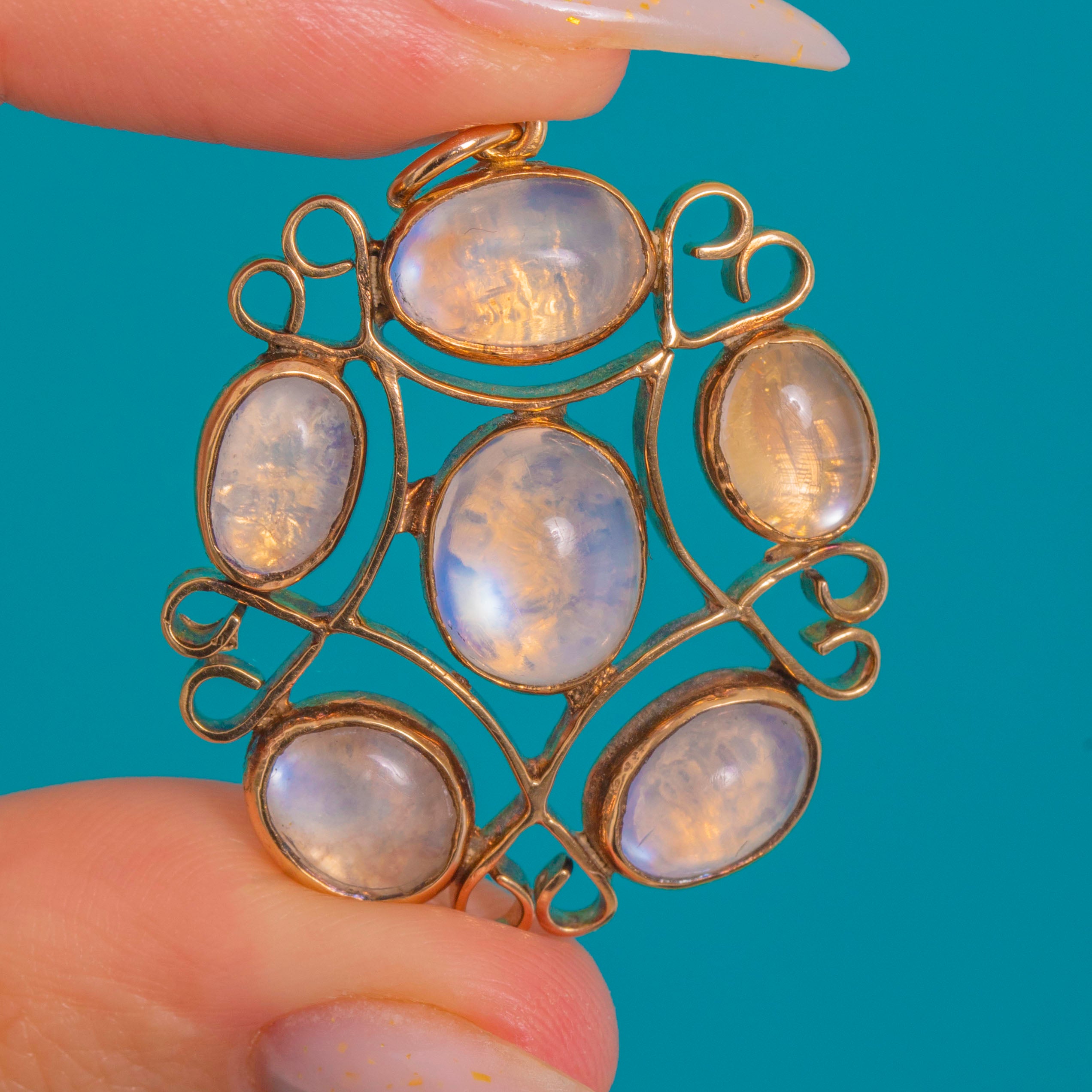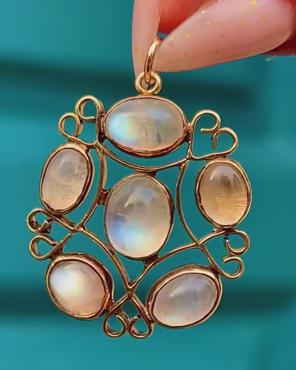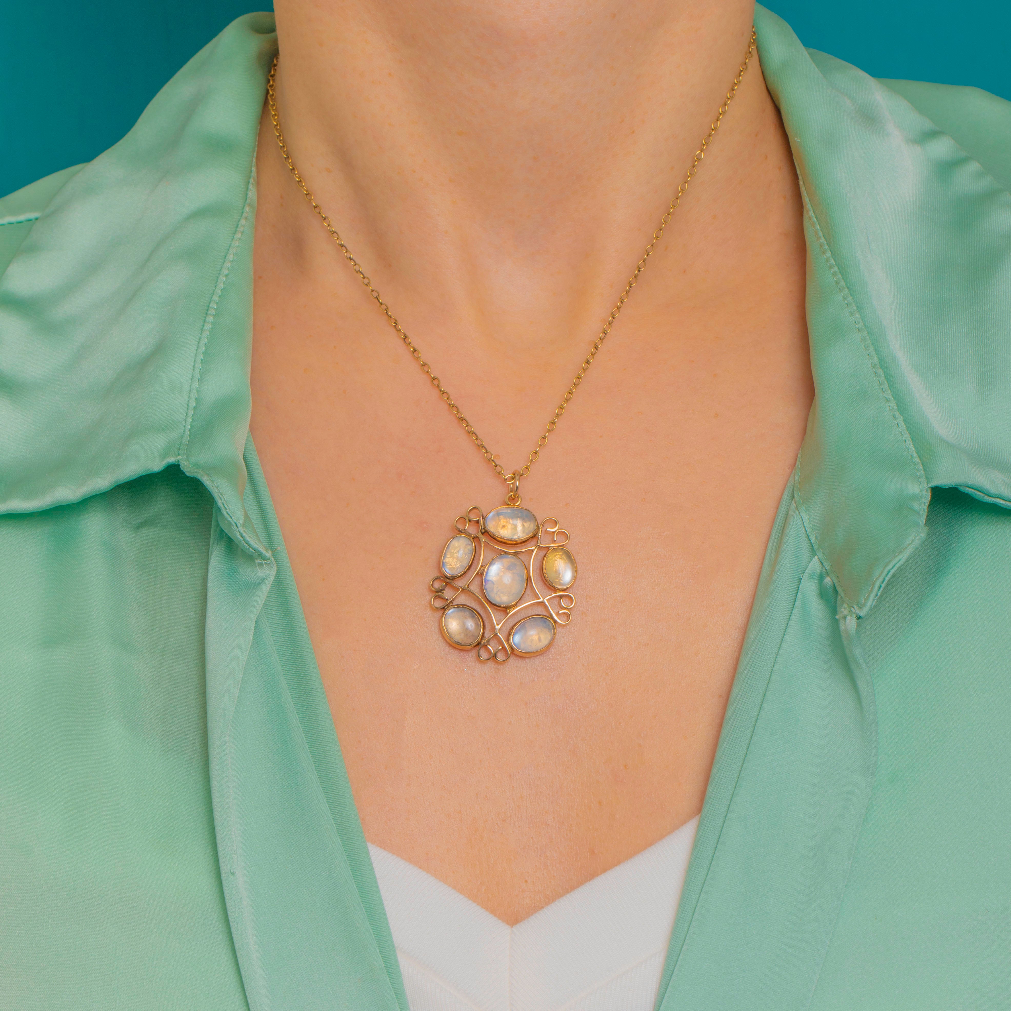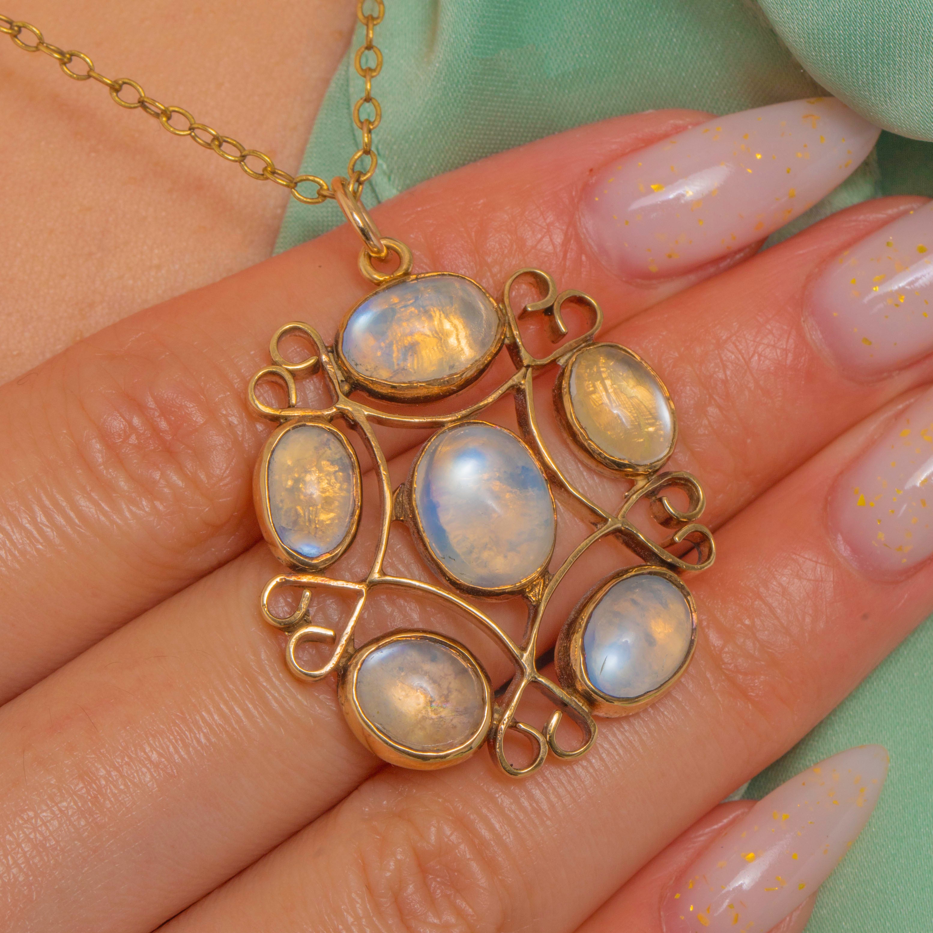 Hand-wrought in the Arts & Crafts tradition, this romantic pendant is a lacework of sinuous scrolls and tender heart-like curls, all crafted in warm 9ct Gold. Five luminous Moonstone cabochons nestle in rubbed-over bezels, their translucent bodies coming alive with soft bluish-white glow as they move.