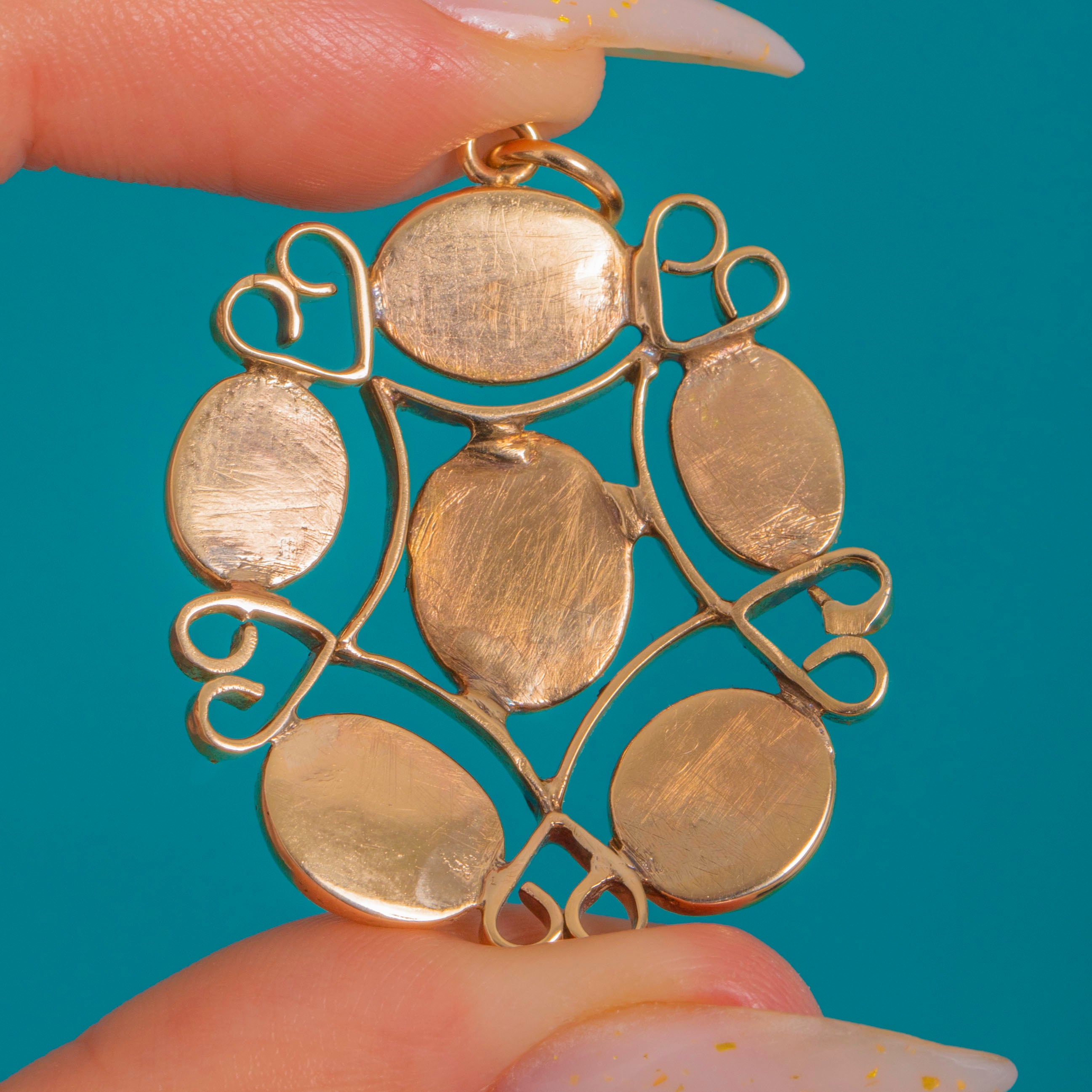 The openwork design feels airy and artisanal, with subtle irregularities that speak to its handmade origins. A simple jump-ring bail completes the piece, while the closed-back settings and gentle patina add depth and old-world charm.