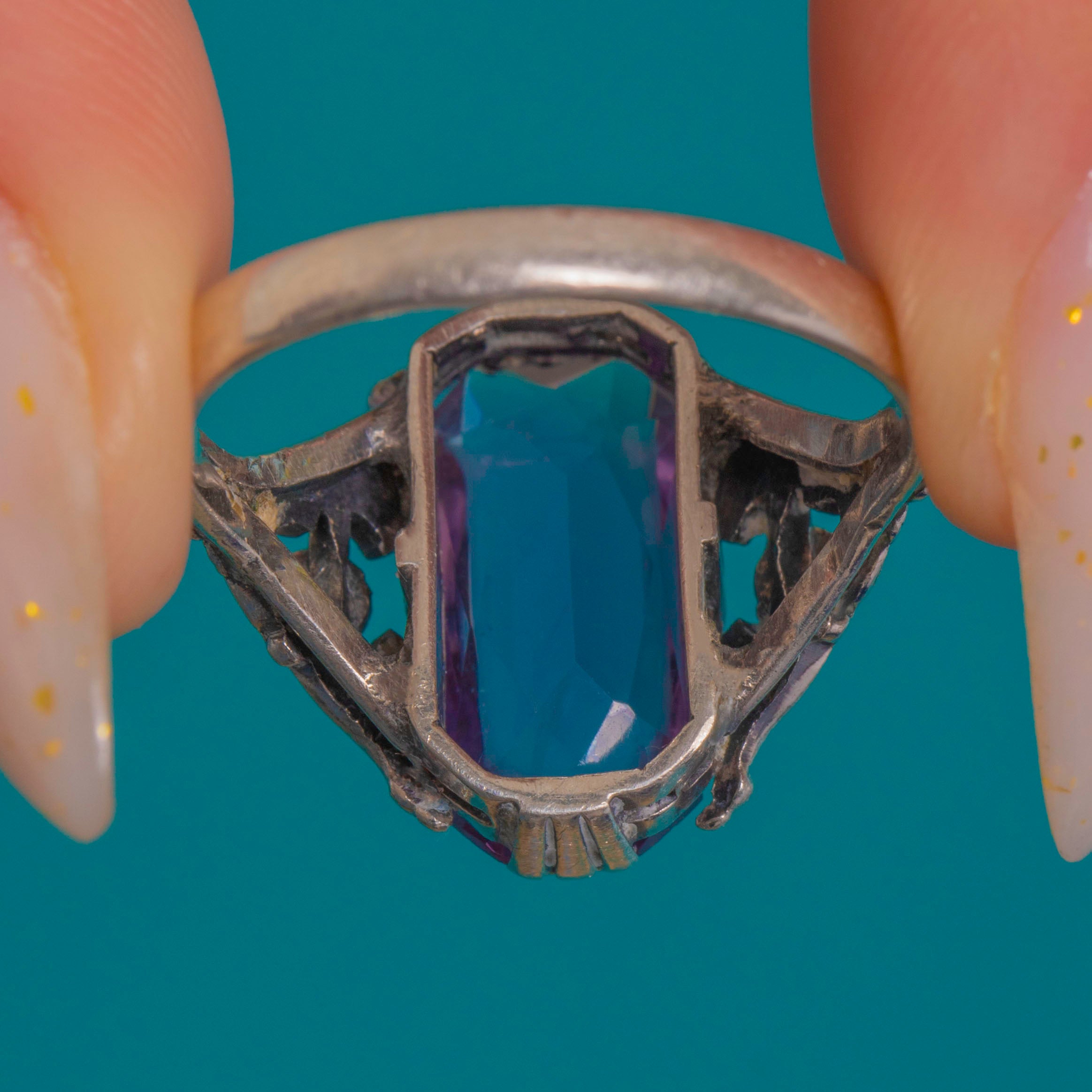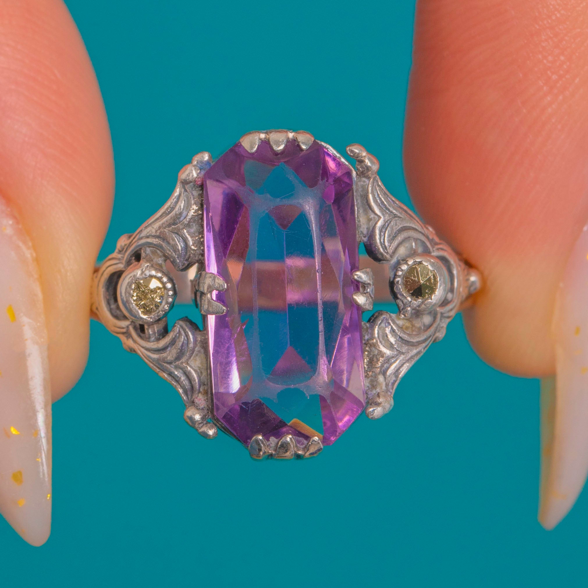 An ornate Arts & Crafts Amethyst dress ring, hand-crafted in gleaming Silver and alive with sculptural detail. An elongated, step-cut Amethyst of approximately 2.35ct takes centre stage in a softly geometric claw setting, its pretty mauve hue flanked by twinkling Marcasite accents set in fine milgrained bezels. Pierced scrolls and foliate engraving flow through the open gallery and shoulders, giving this finger‑spanning beauty a refined, romantic silhouette.