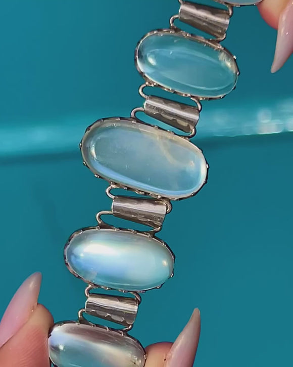 EXCELLENT: The stones are generally in excellent order with a single very minor nibble to one moonstone; there are no loose stones. The Silver links and clasp are secure and present with minimal wear, indicating the necklace has been well cared for. There are no visible restoration or repair marks.