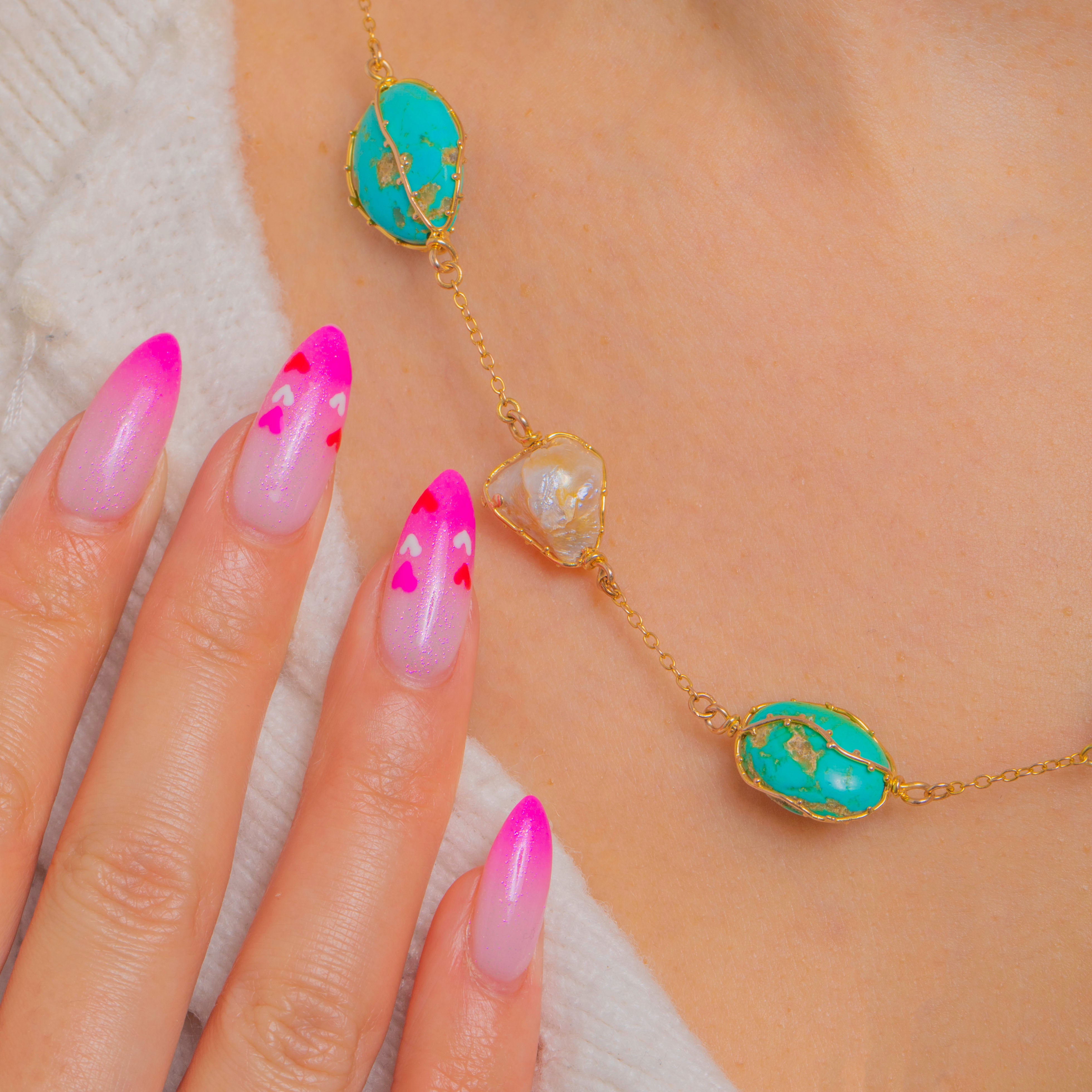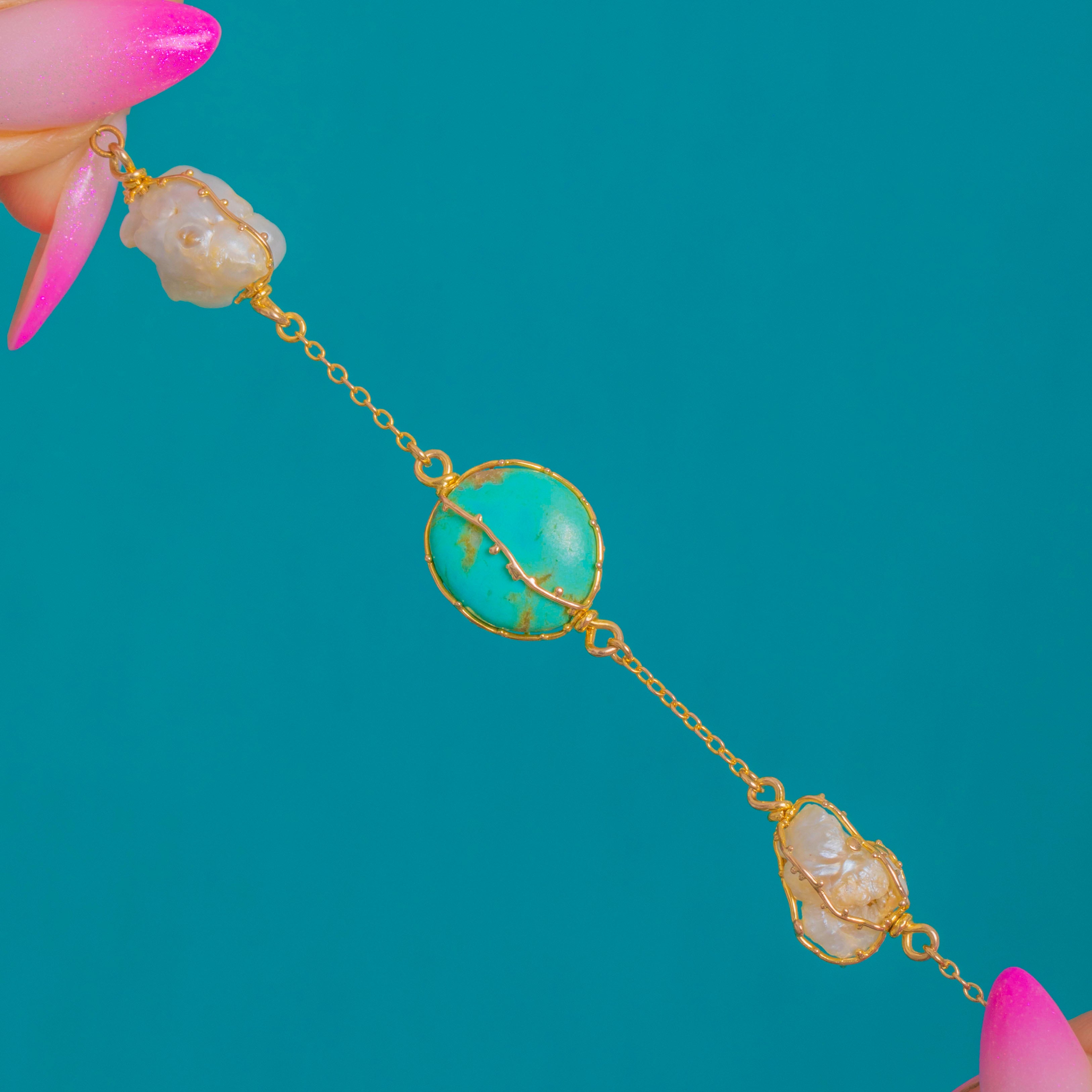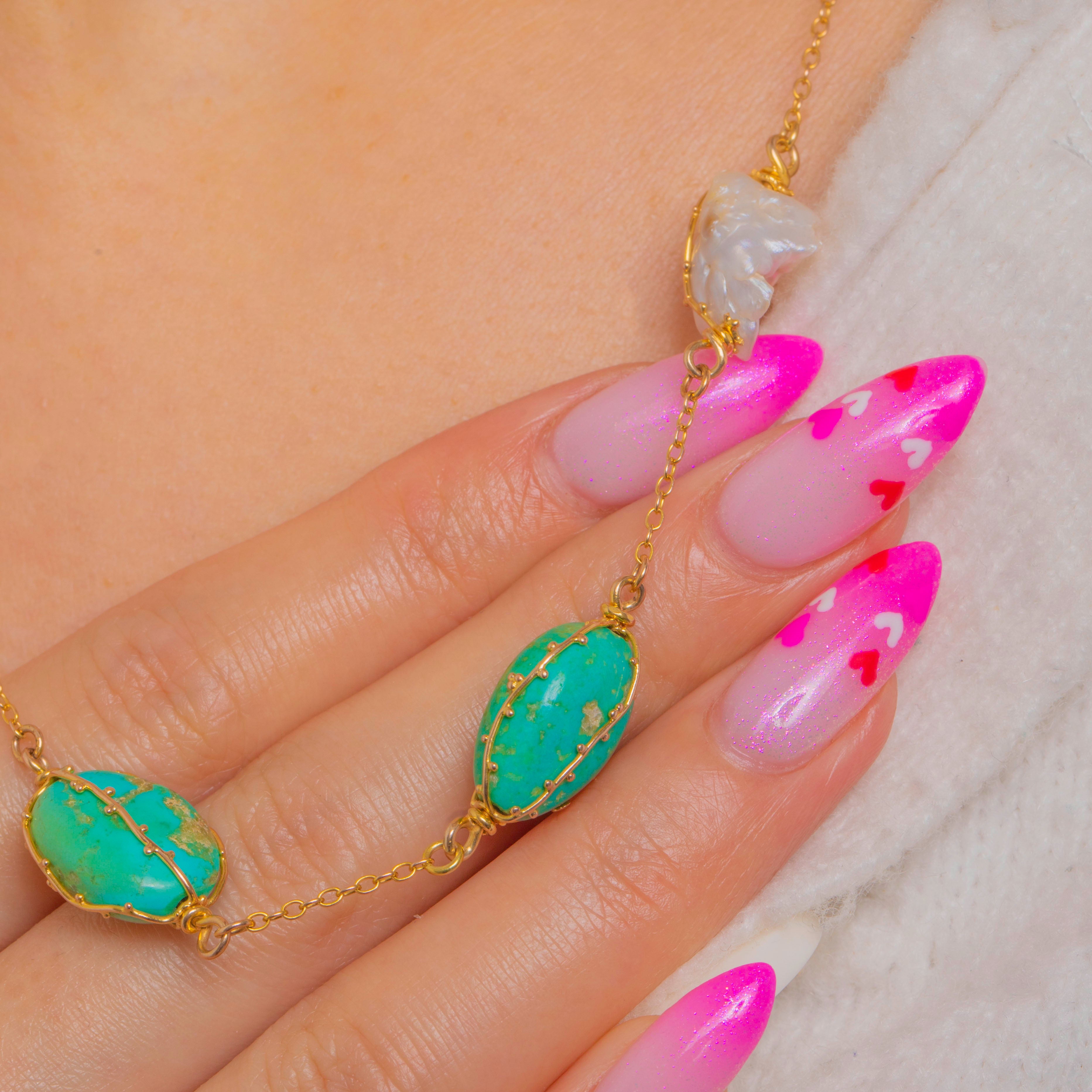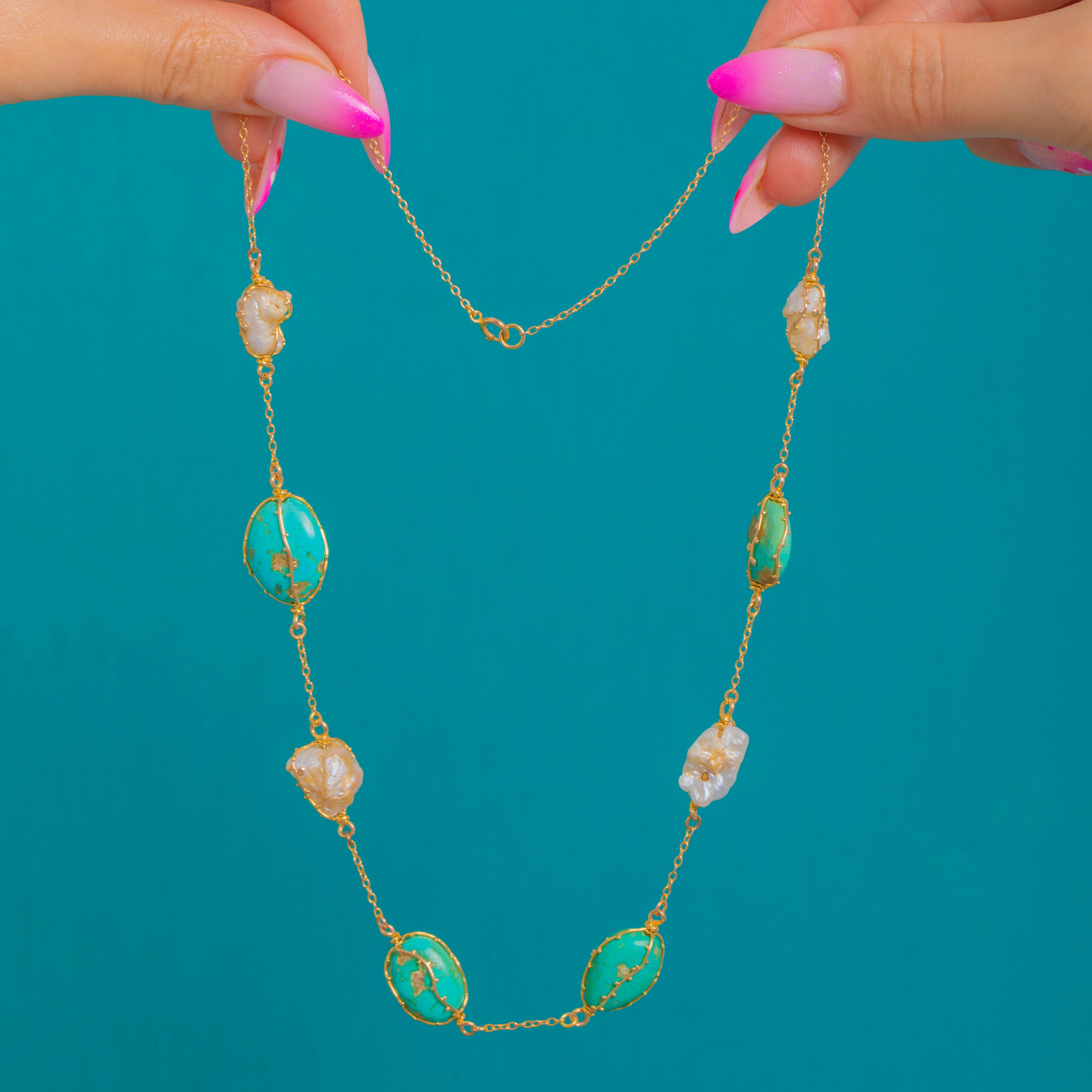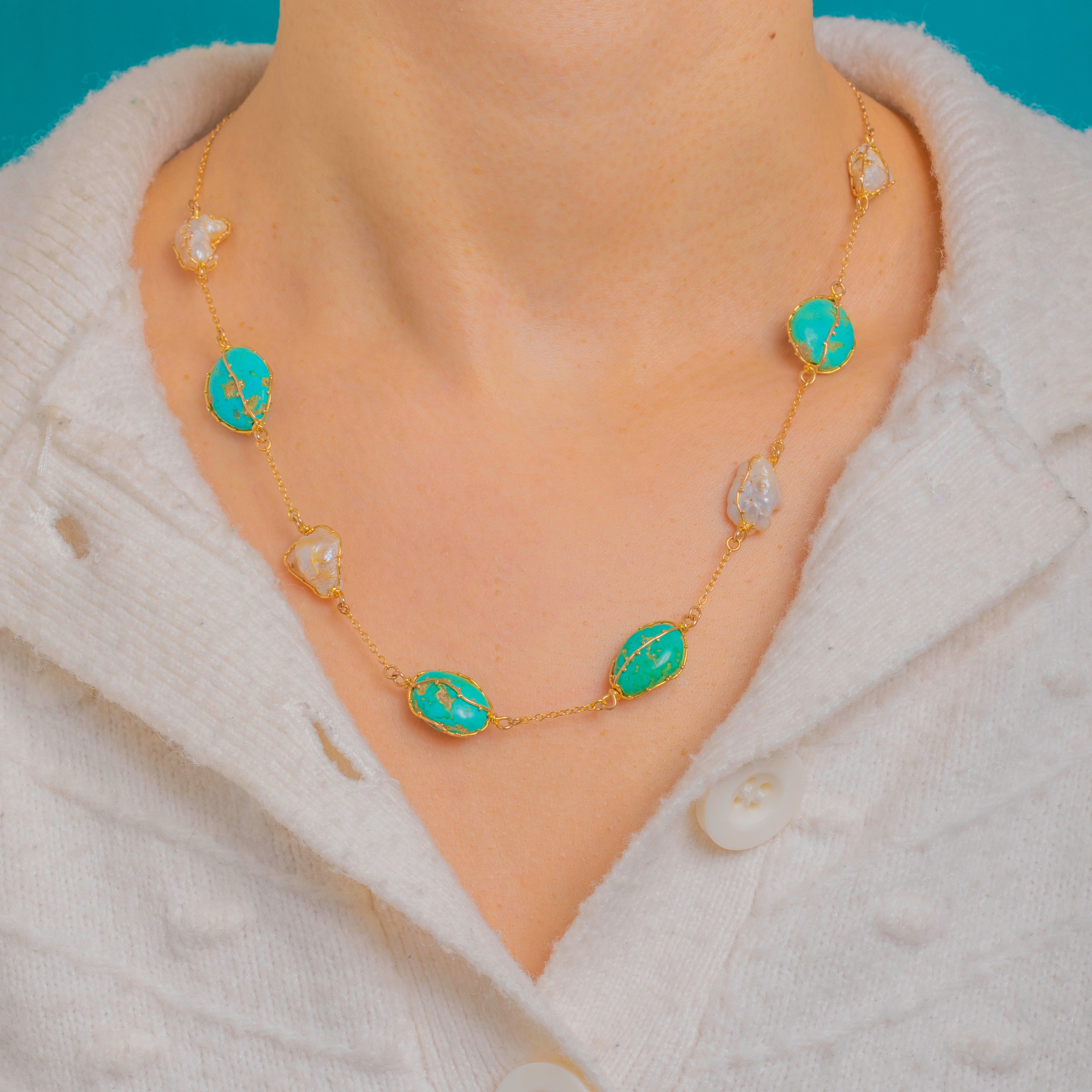 The palette is beautifully naturalistic: vivid blue-green Turquoise with characteristic matrix set against softly iridescent Baroque Pearls, each element celebrating its own unique contours. Elegant at the collarbone and perfect alone or layered, this is an effortlessly wearable piece that captures the spirit of the Arts and Crafts movement.