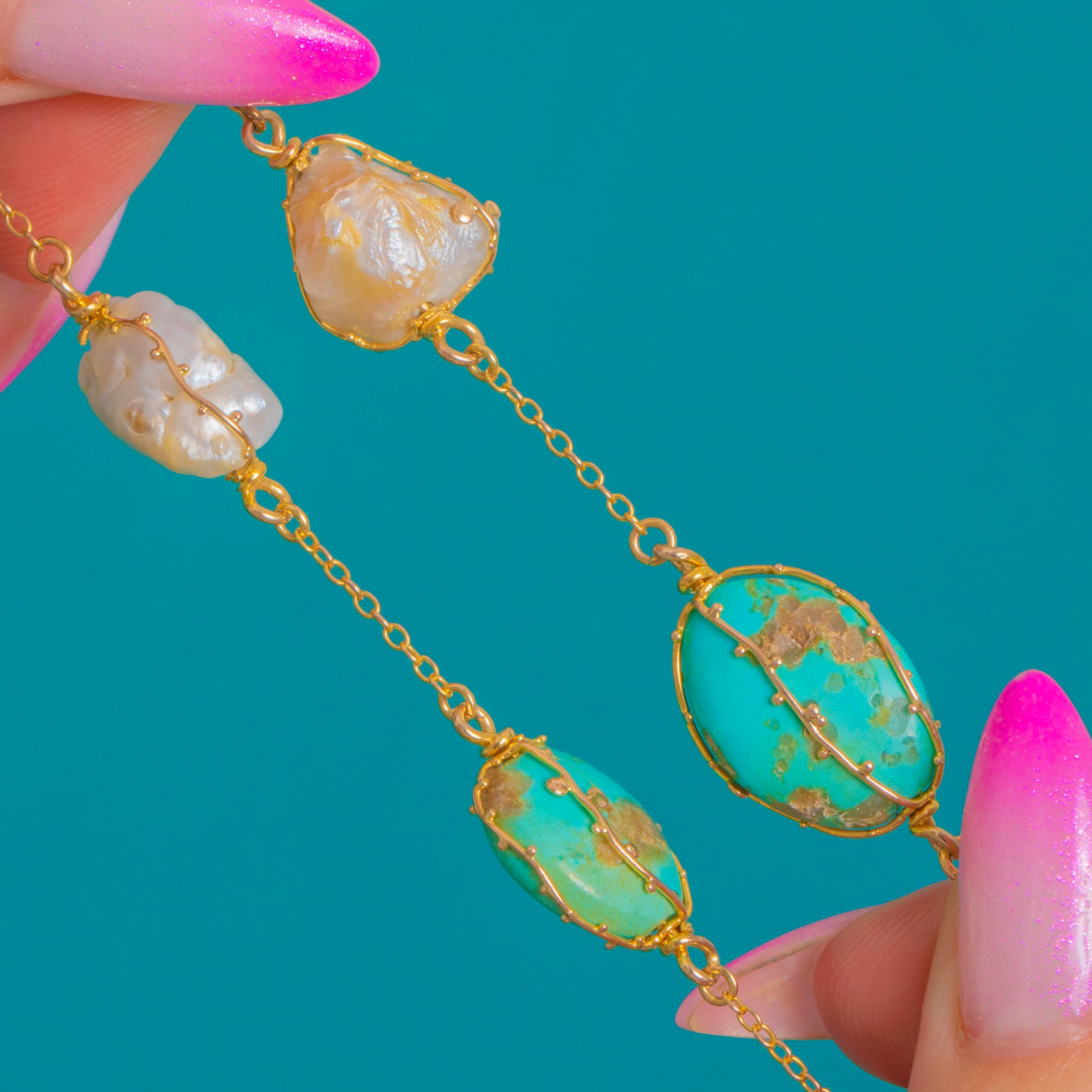 A lyrical Arts and Crafts station necklace where organic form meets refined craftsmanship. Alternating Turquoise and creamy Baroque Pearls are individually caged in hand-wrought 15ct Gold wirework, their open-backed collets allowing colour and lustre to glow with every movement. The fine cable chain threads these treasures into a graceful rhythm that feels unmistakably artisan.