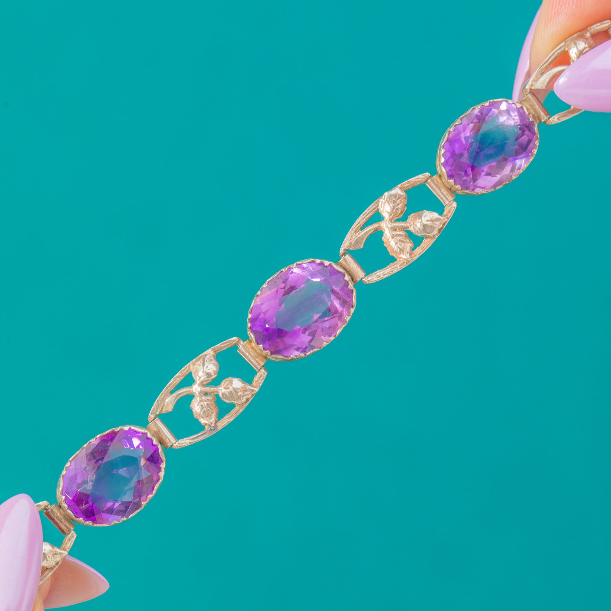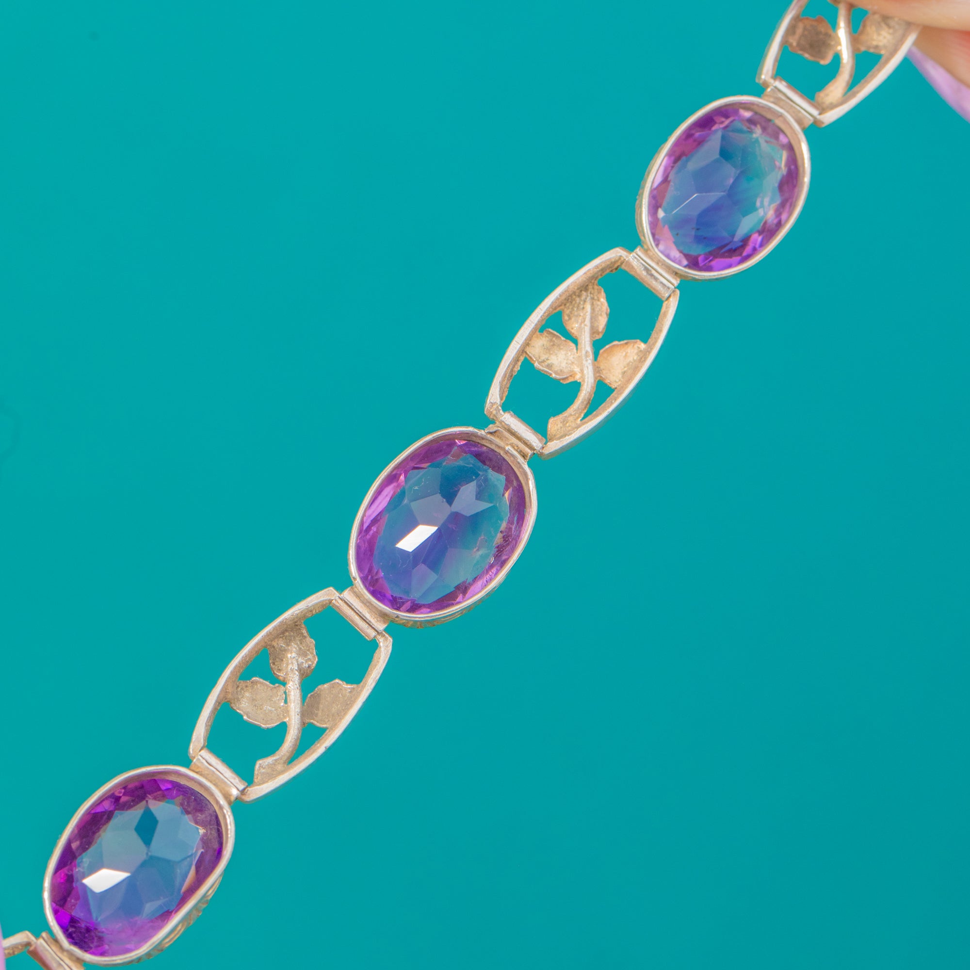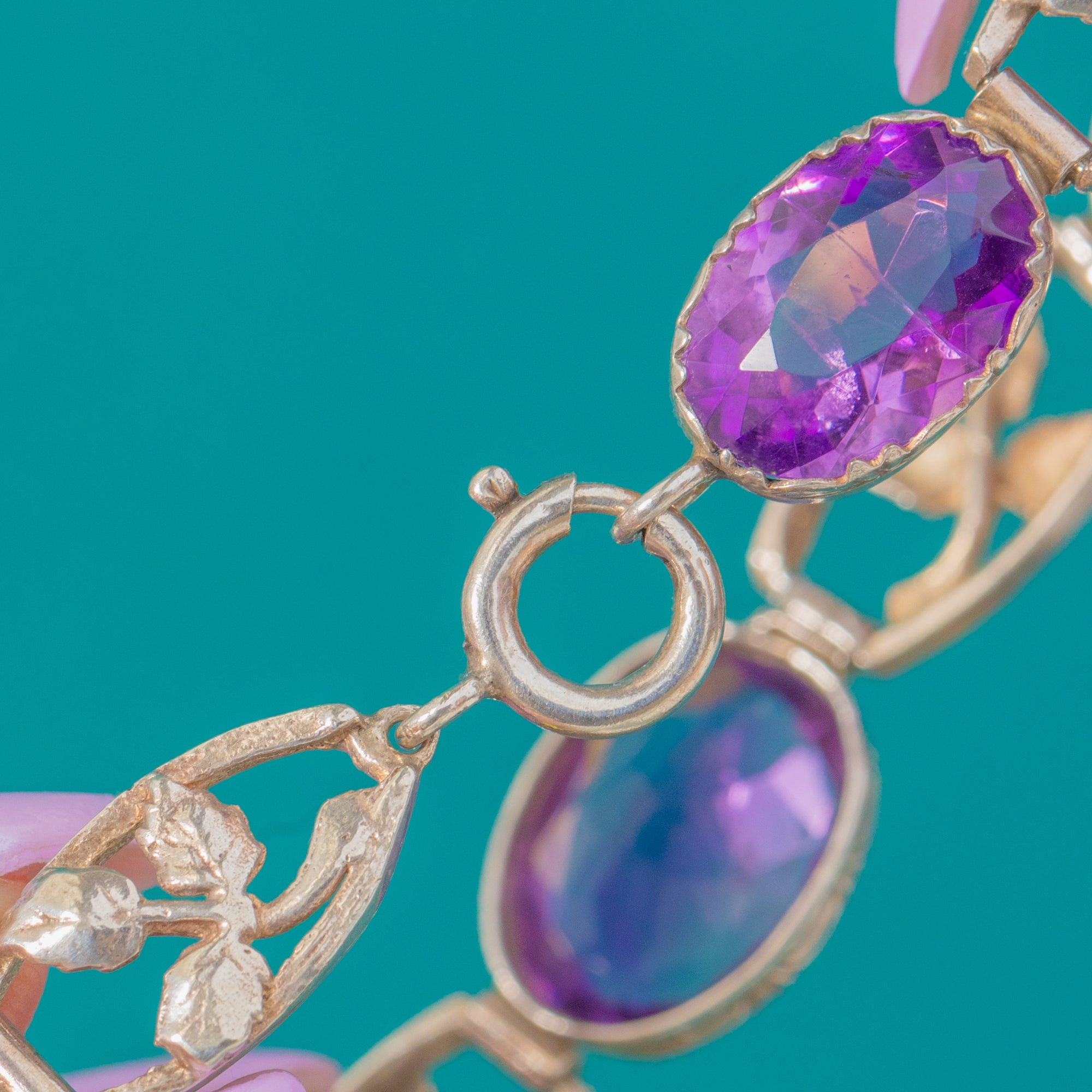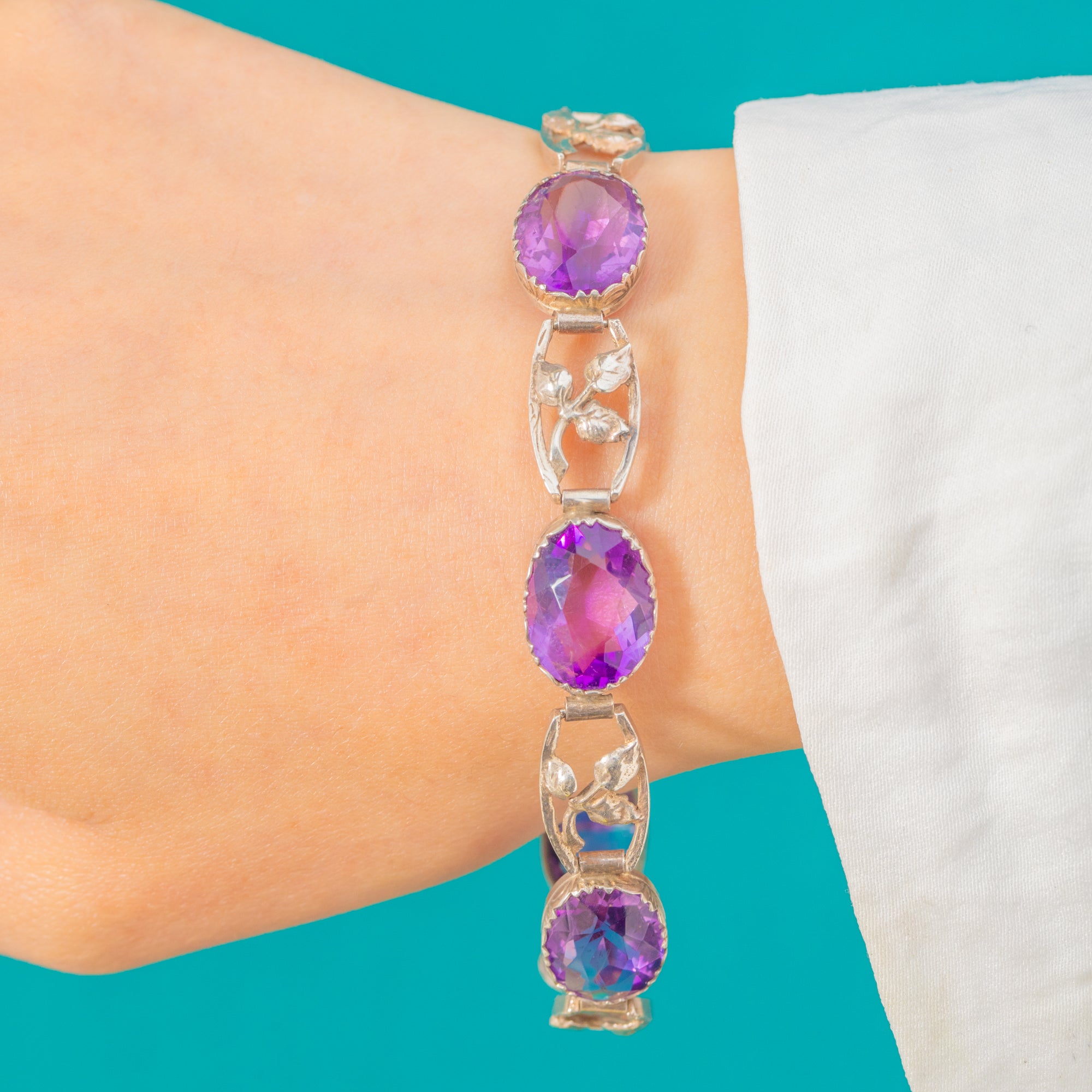Richly hued Amethysts and romantic foliate links make this Arts and Crafts bracelet a delight to behold! .. Vivid violet oval gems are cradled in scalloped bezel settings and typical cut claws.. alternating with airy, openwork leaves to create a lyrical, botanical rhythm around the wrist.