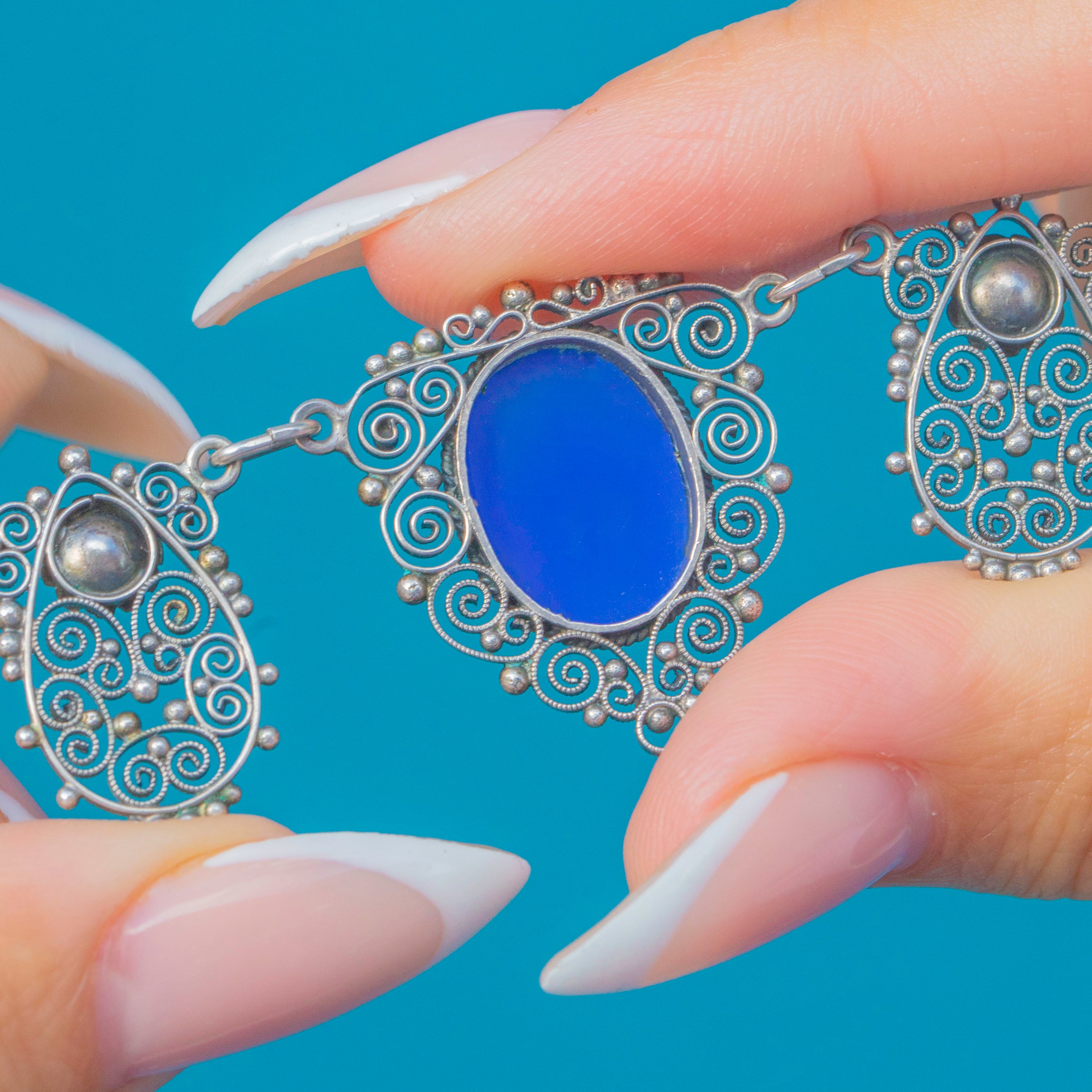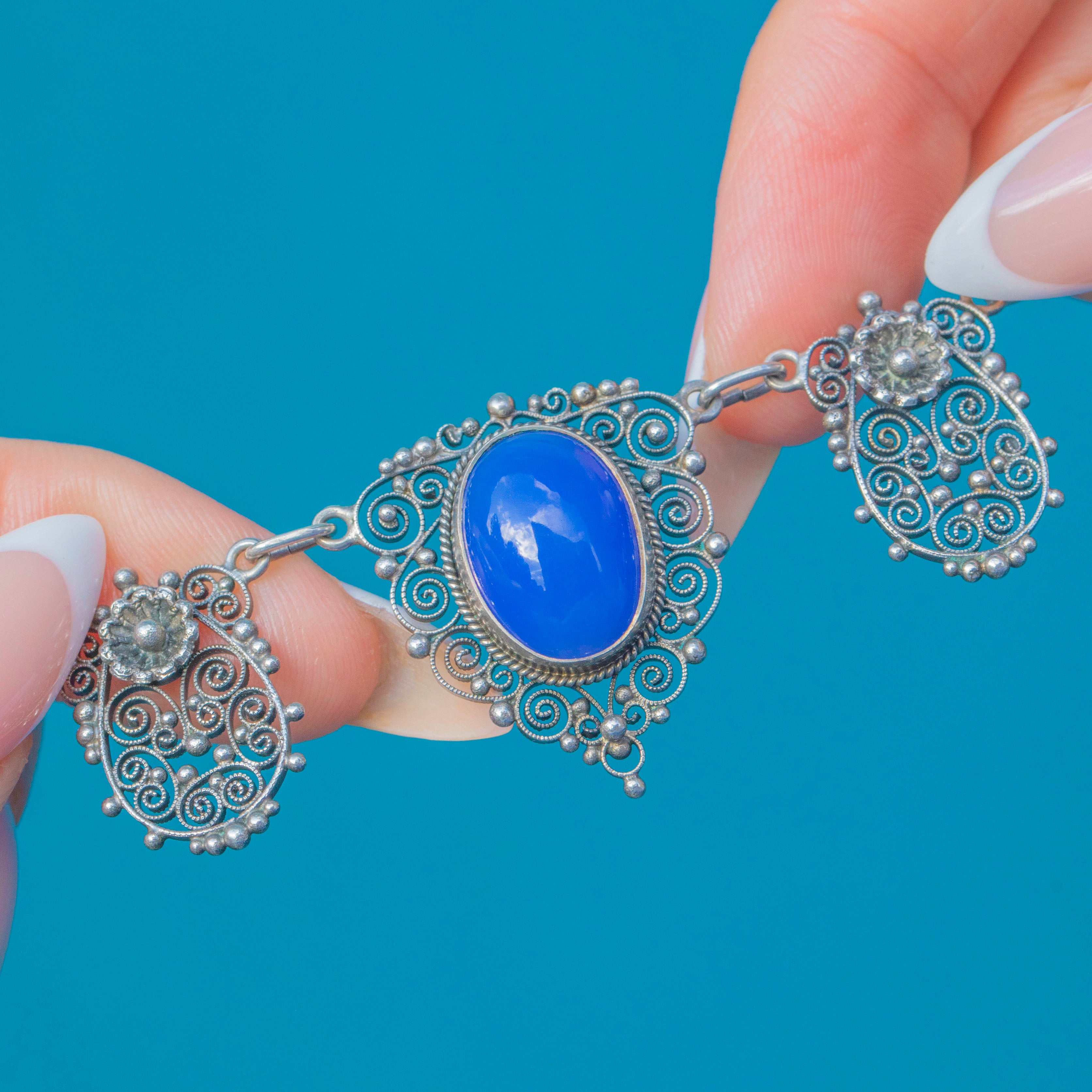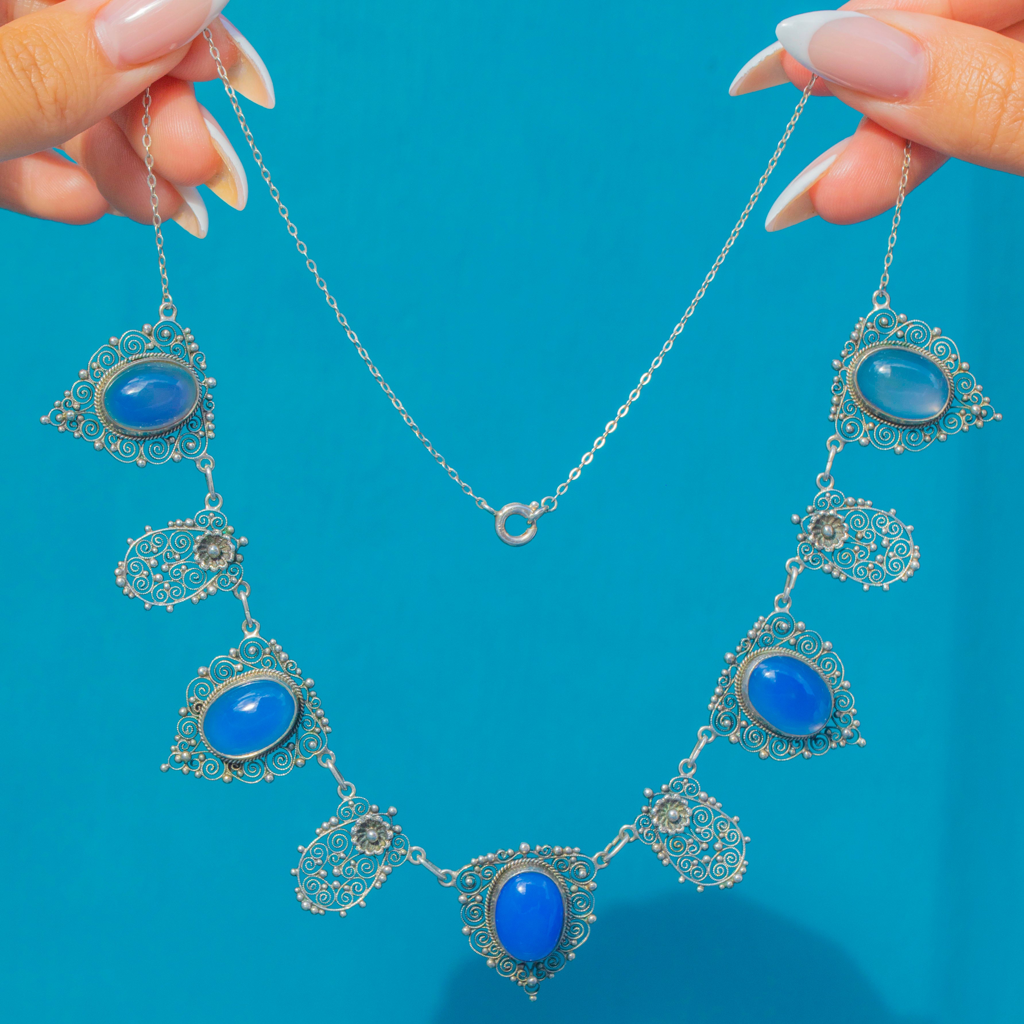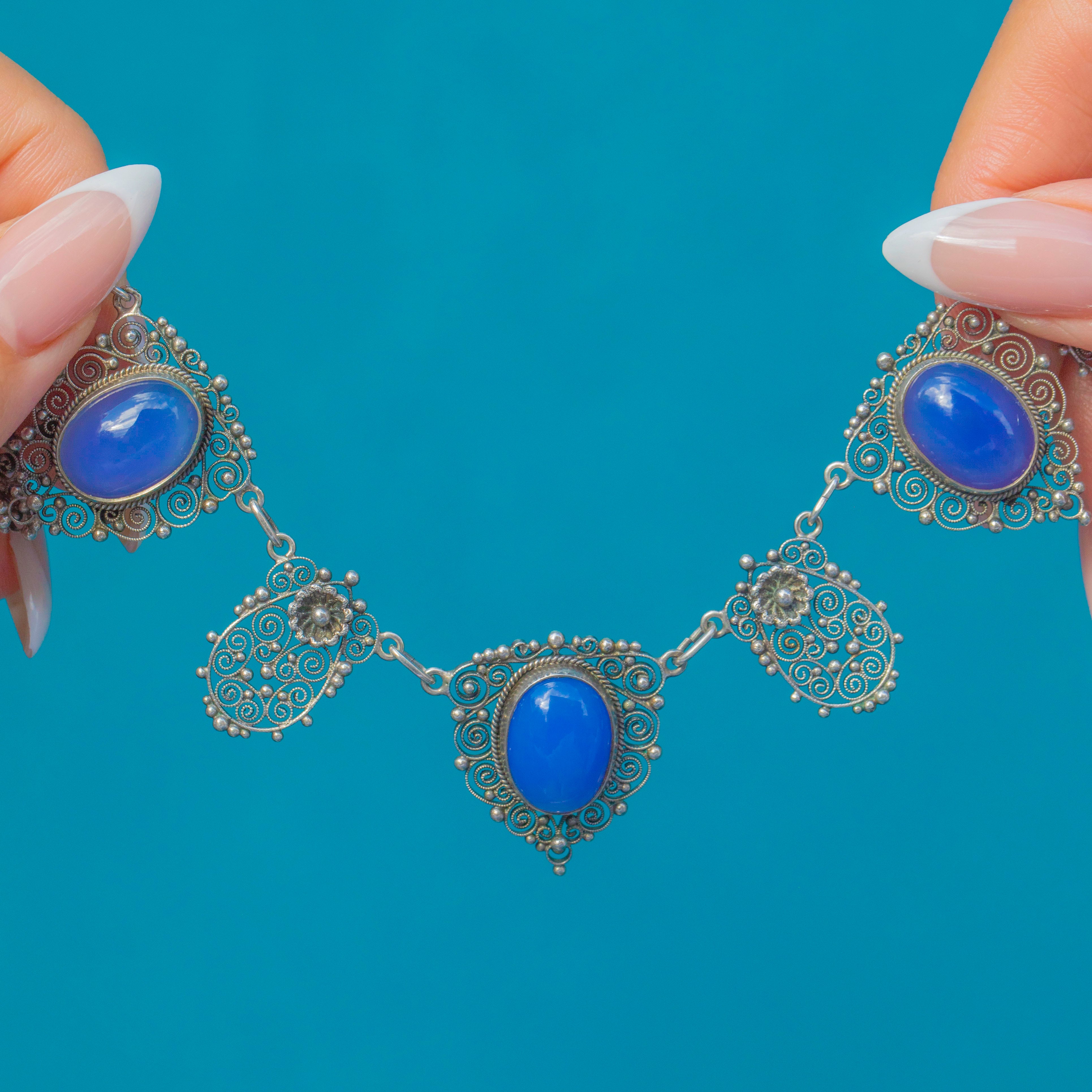 A dreamy Arts & Crafts necklace with five luminous Blue Chalcedony cabochons framed by ornate Silver filigree. The hand-worked scrolls and granulated details give wonderful movement and texture, while the cool blue stones glow beautifully on the skin. Elegant and wearable at 18", it’s a striking piece of period design that sits effortlessly with both everyday shirts and evening dresses.