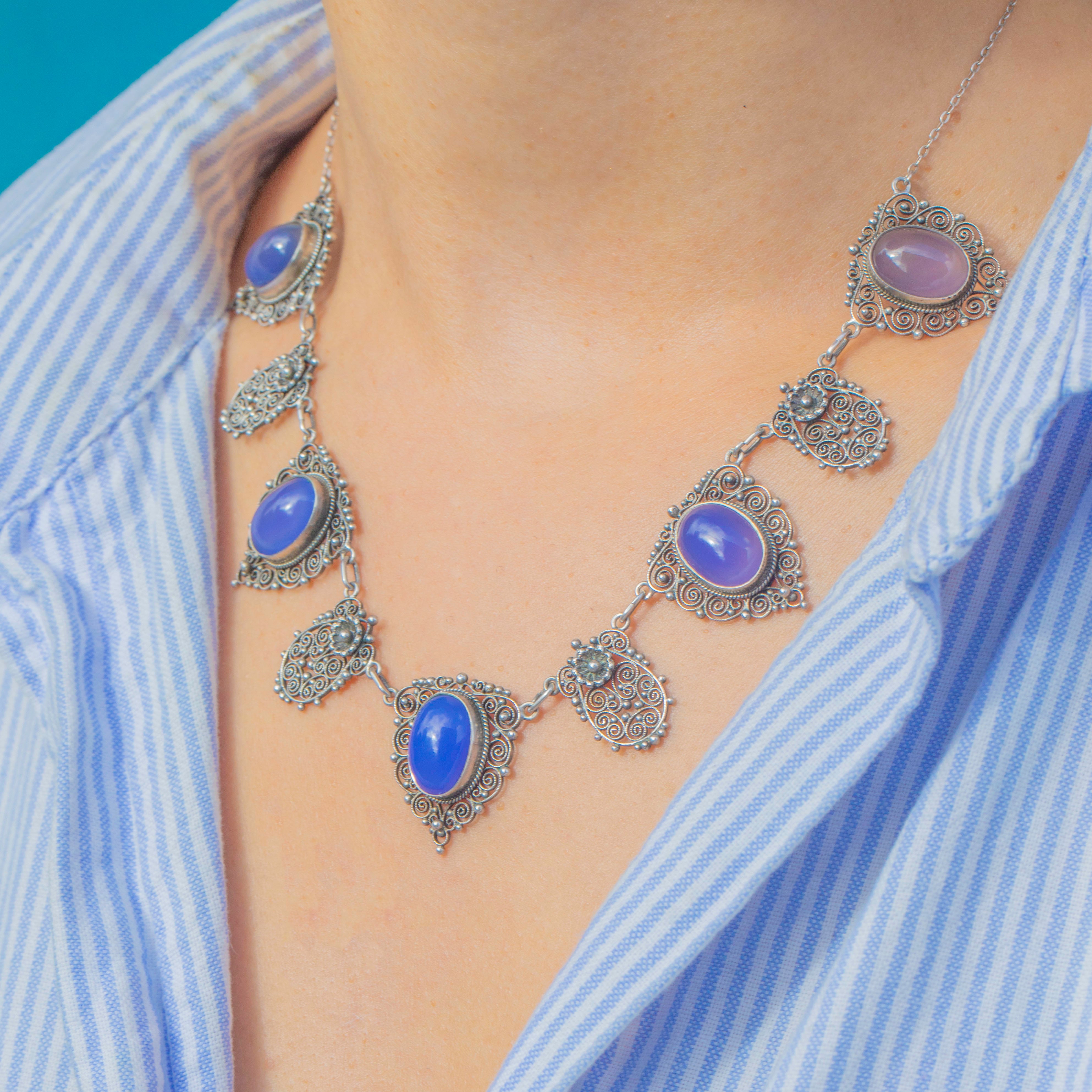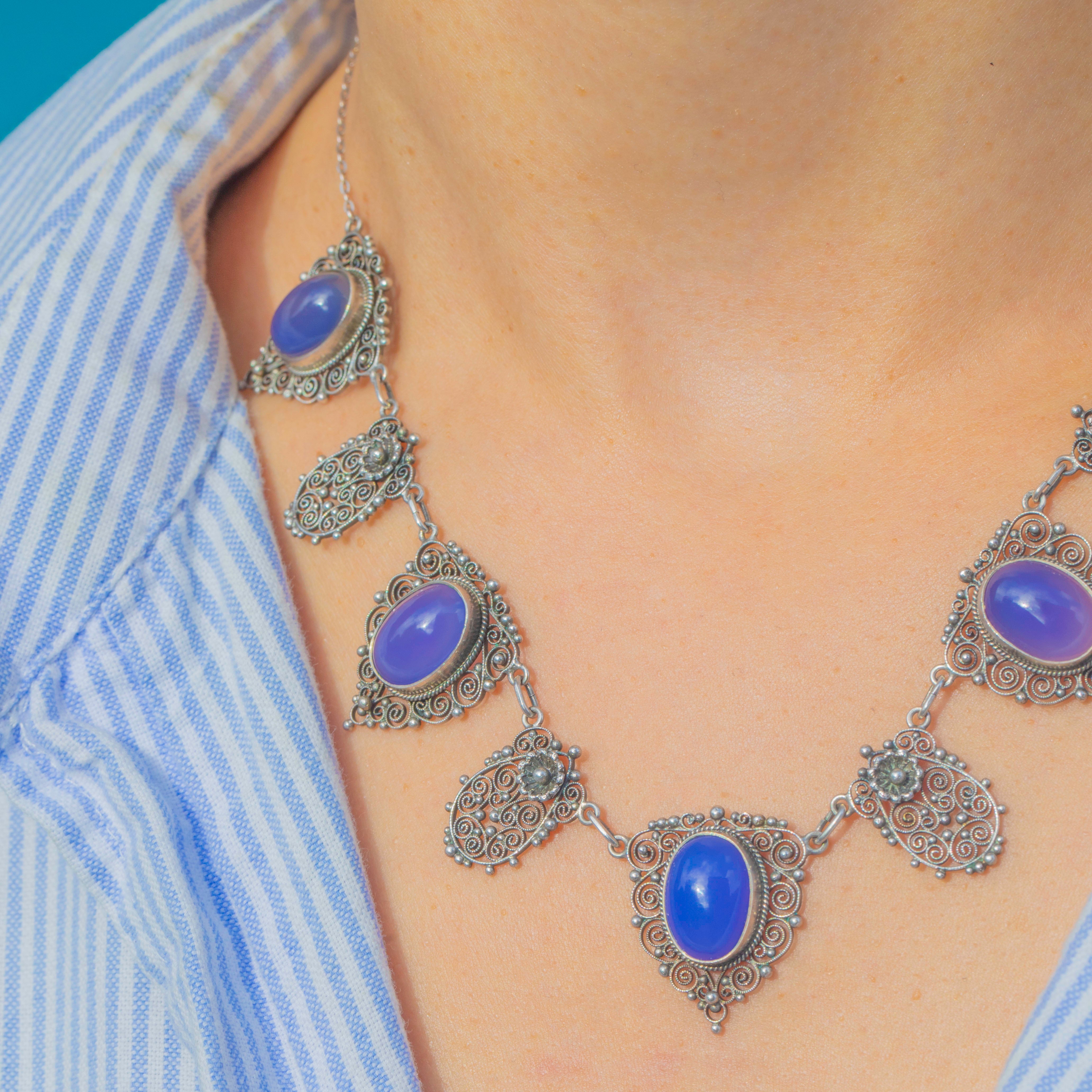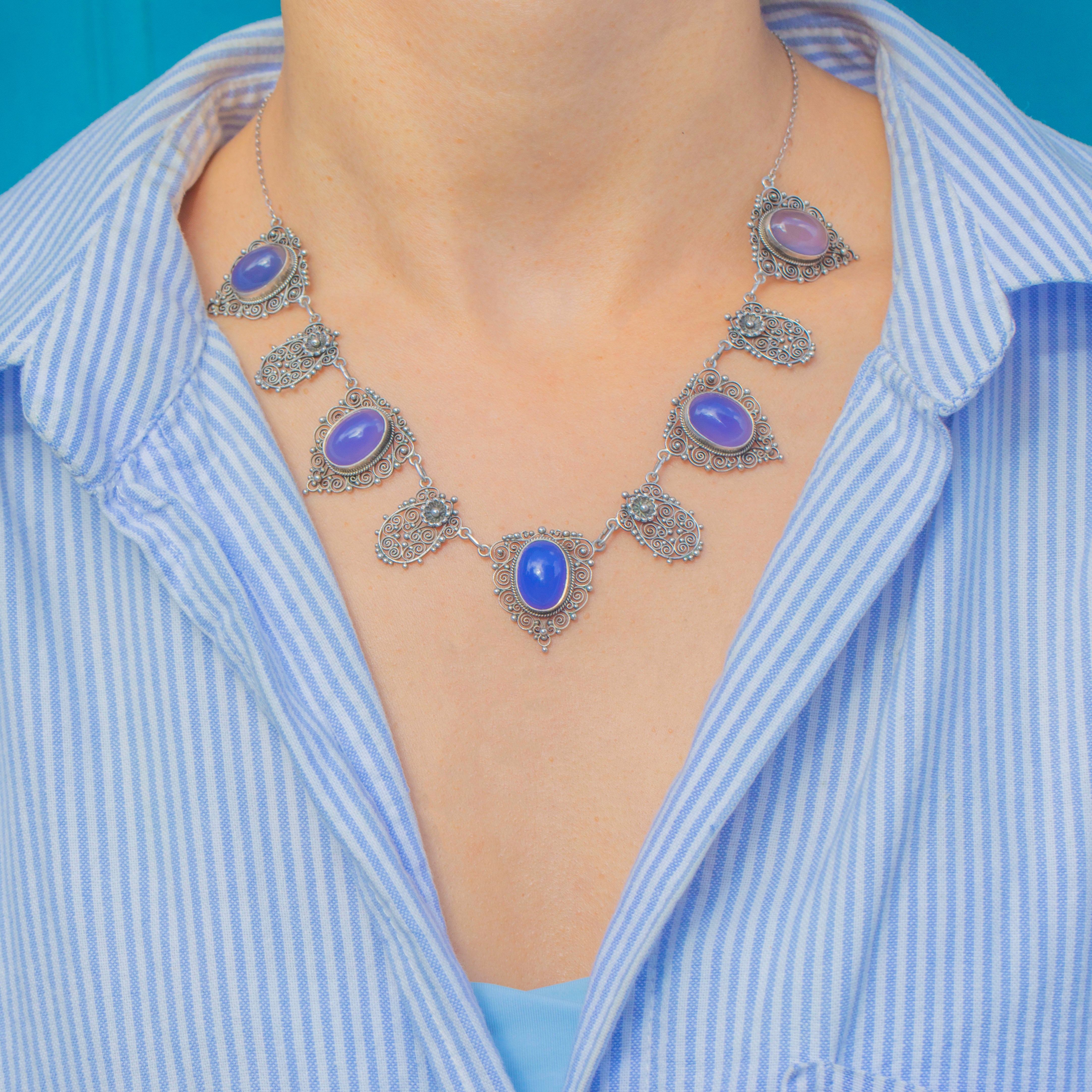 Arts & Crafts Silver Blue Chalcedony Filigree Necklace