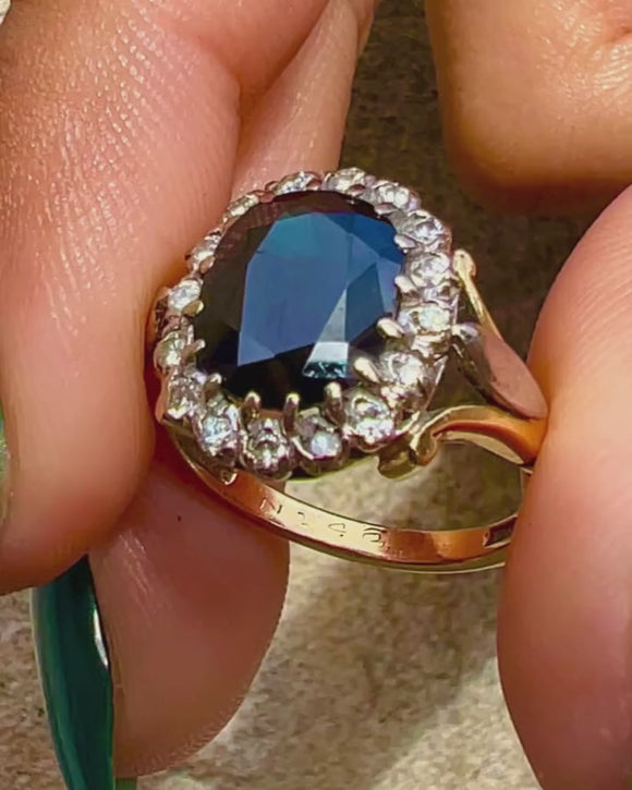 Where to start with this Asprey and Co 18ct Gold natural Sapphire Diamond cluster ring! As though plucked from a fairytale, this dreamy Vintage ring flaunts a deep midnight blue 2.70ct natural Sapphire haloed by a sea of sparkling Diamonds, with a total carat weight of 0.24ct, creating a mesmerising adornment for your hand!