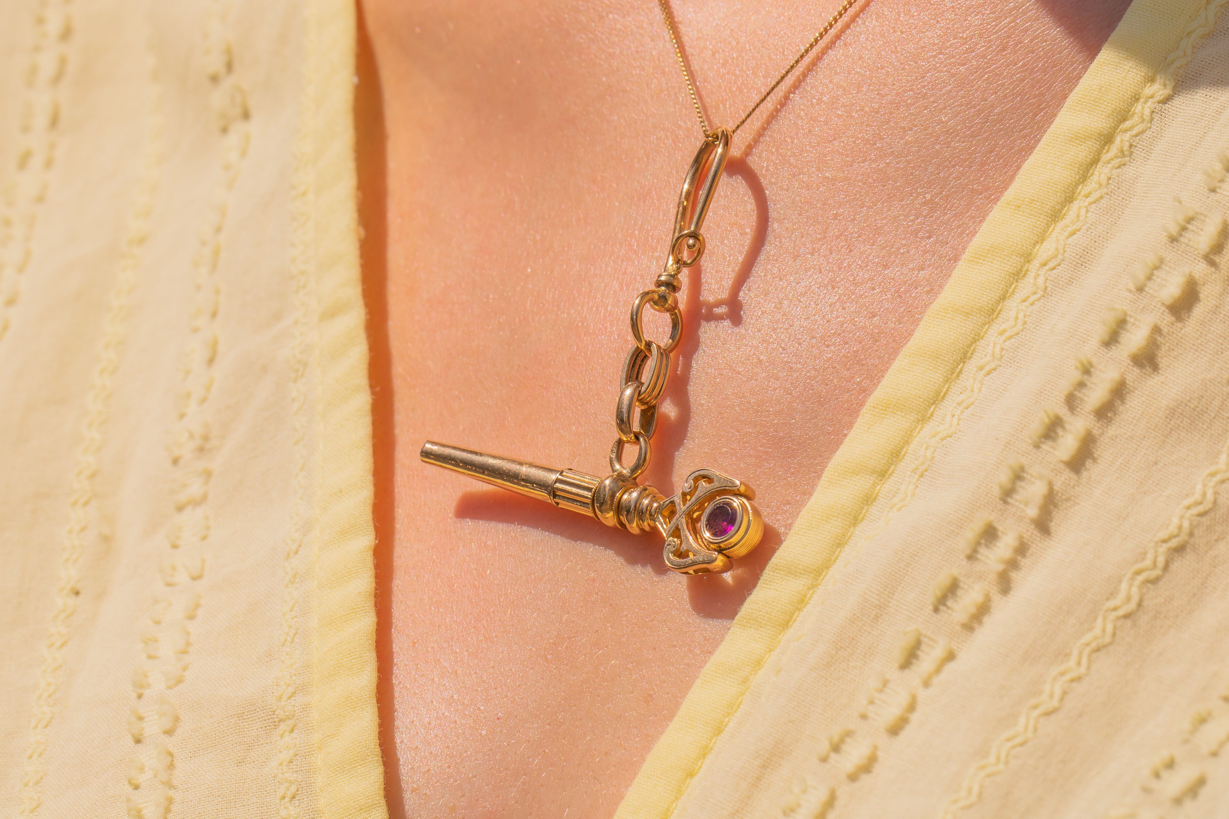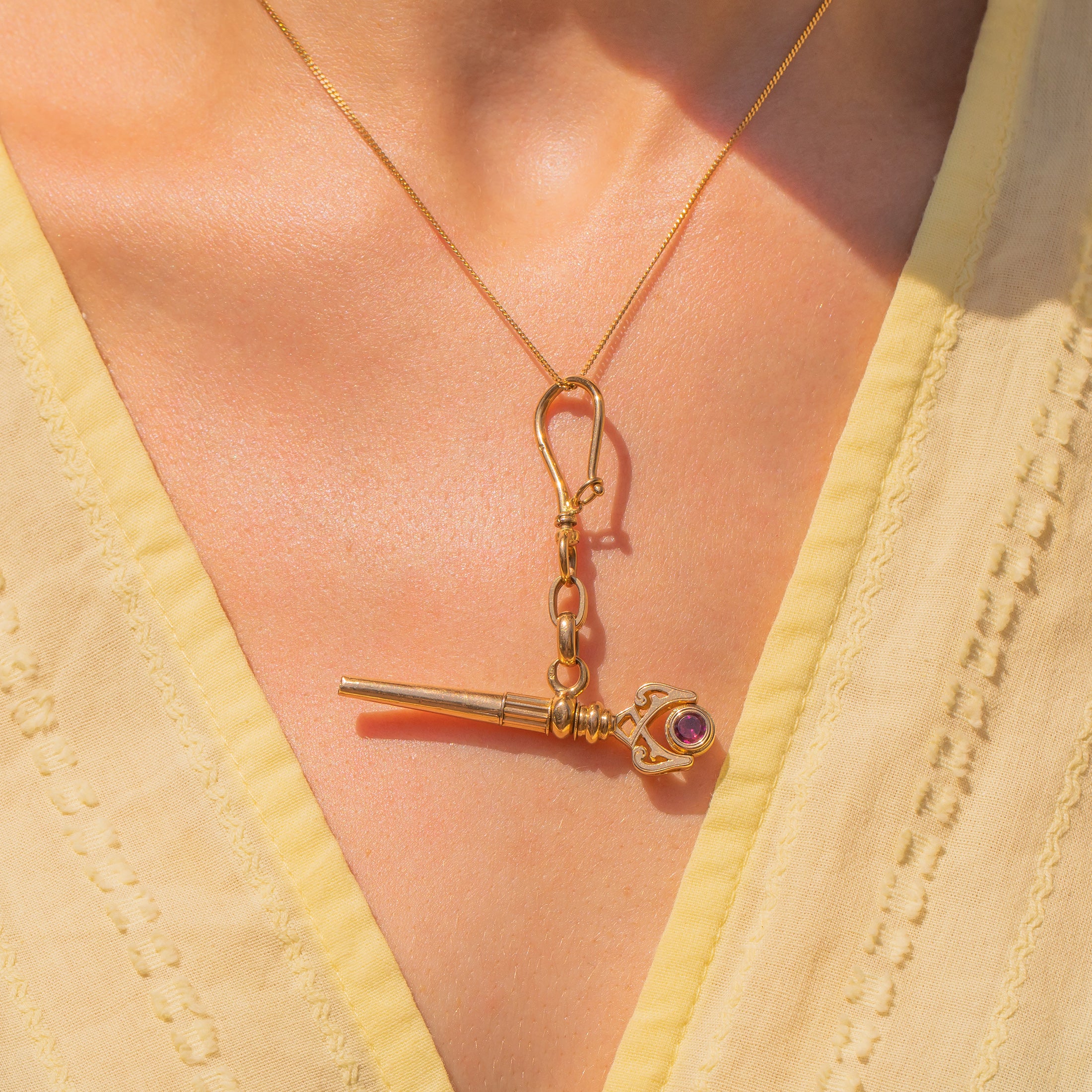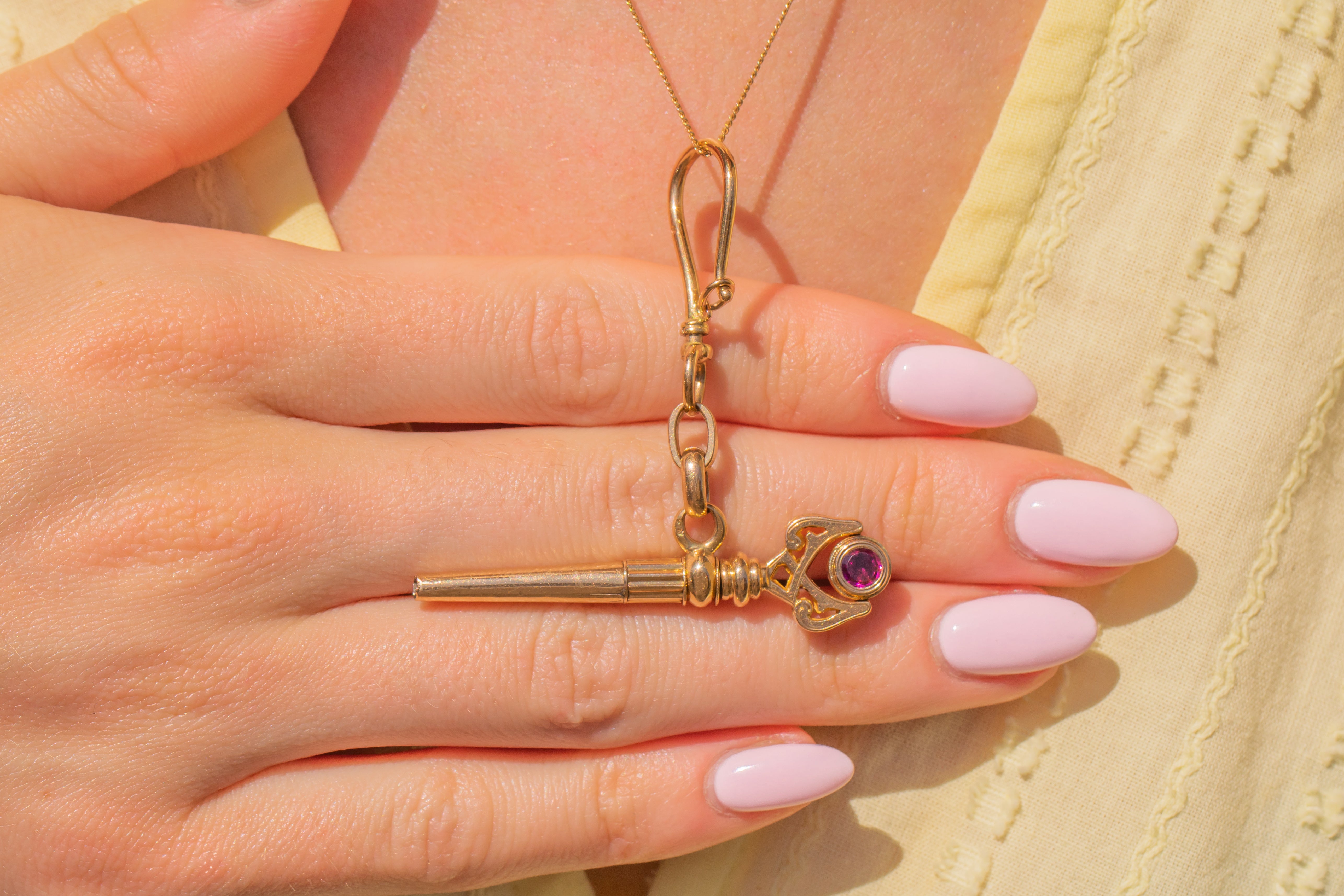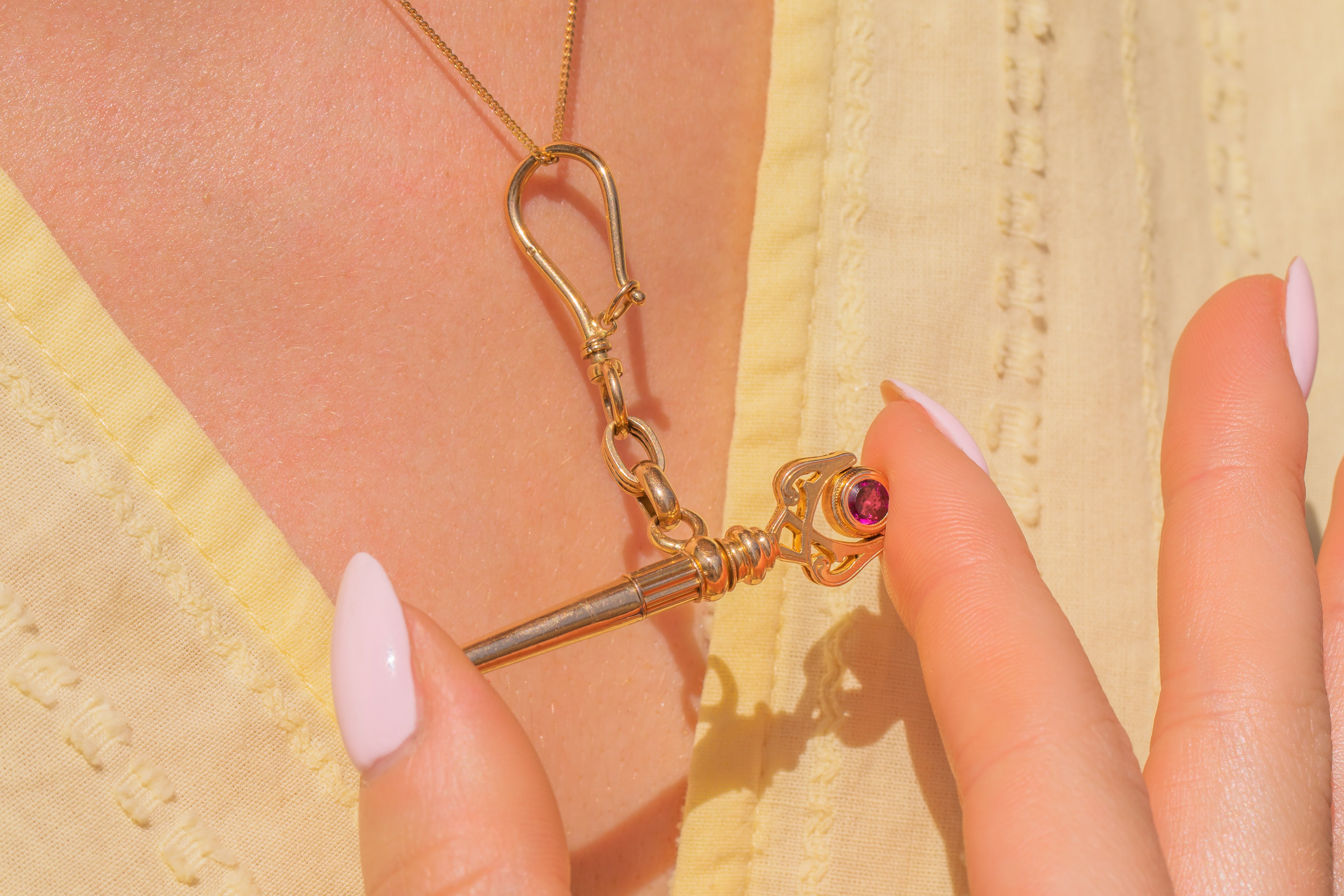 We've never seen anything quite so magnificent as this Austro-Hungarian 14ct Gold watch key pendant; there are so many fine details to this jewel! Marvel at the plum infused Garnet, the stylish fish hook and buttery 14ct Gold!