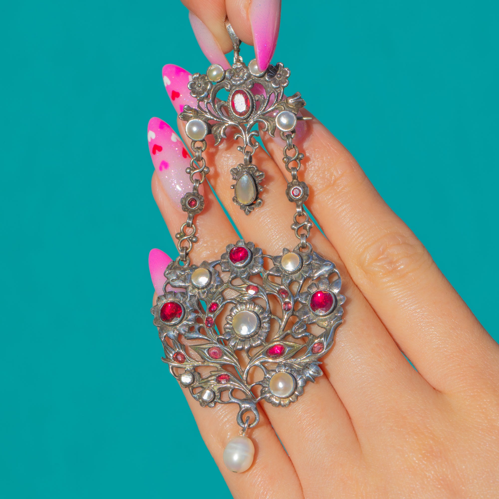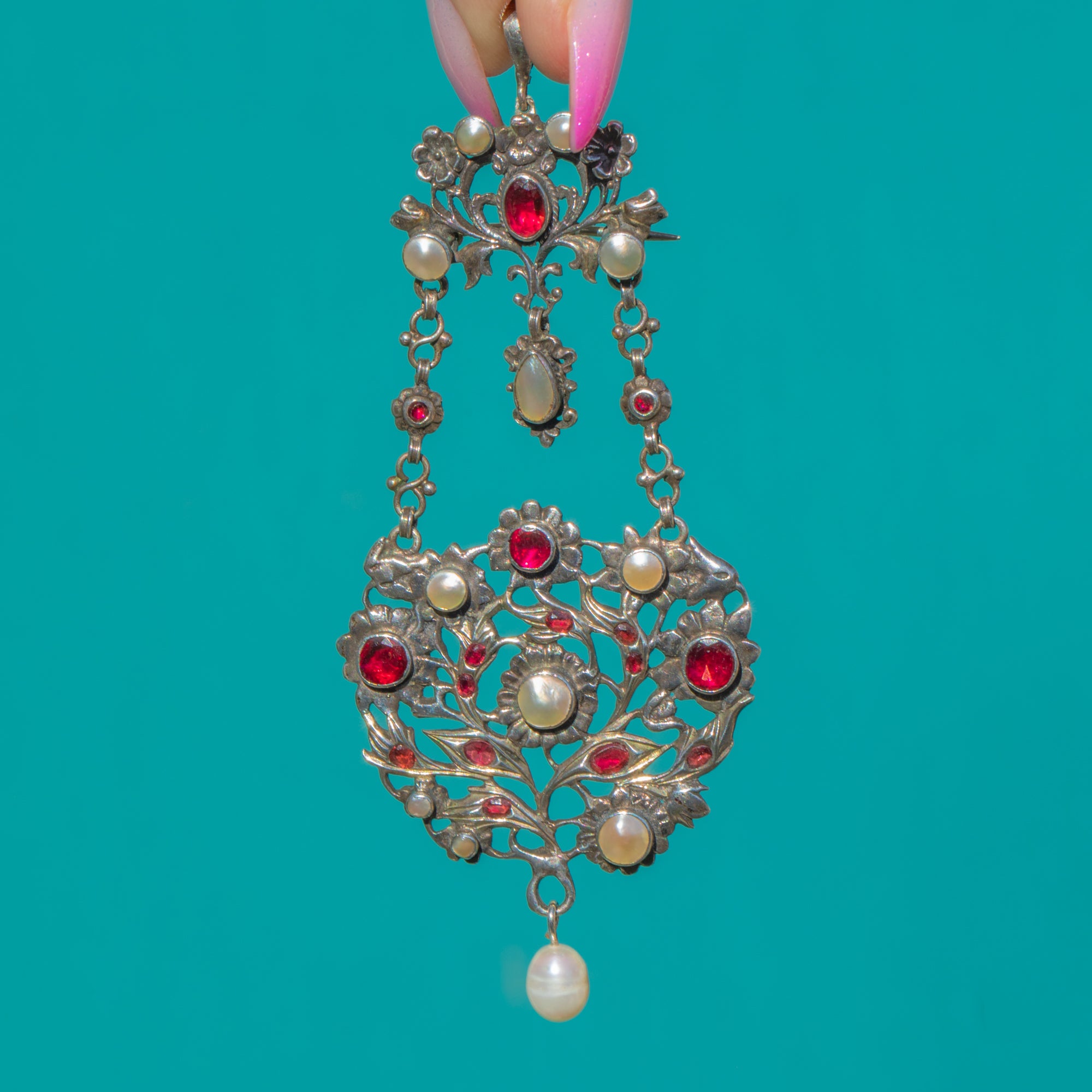 Opulent and romantic, this Austro-Hungarian Silver pendant-brooch lavalier showcases a symphony of foliate openwork, floral rosettes and articulated drops, richly accented by bright red Garnets, lustrous Mother of Pearl and a creamy teardrop Pearl. The beautifully wrought, multi-part construction moves gracefully, while the girandole-style layout draws the eye to the glowing Pearl drop below.