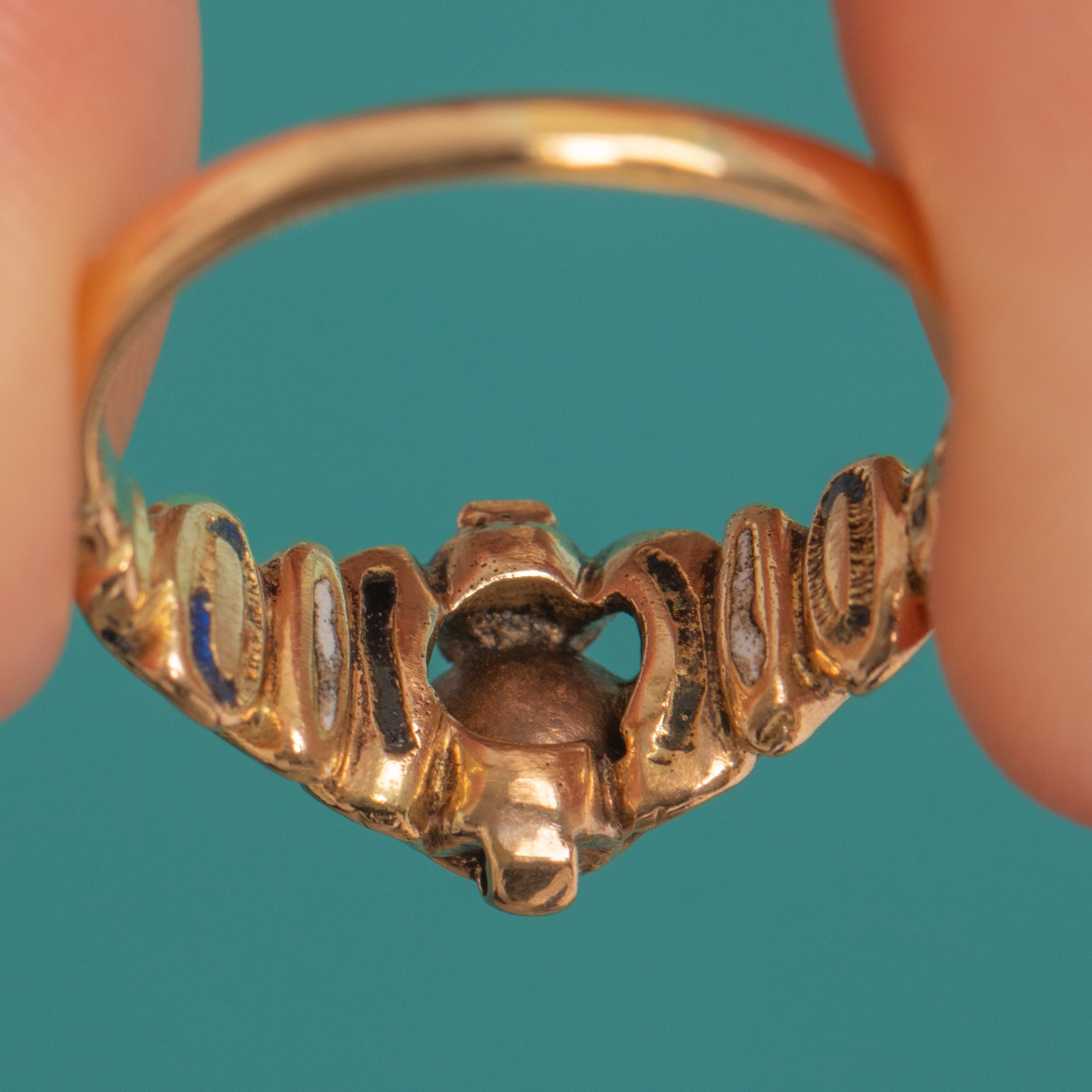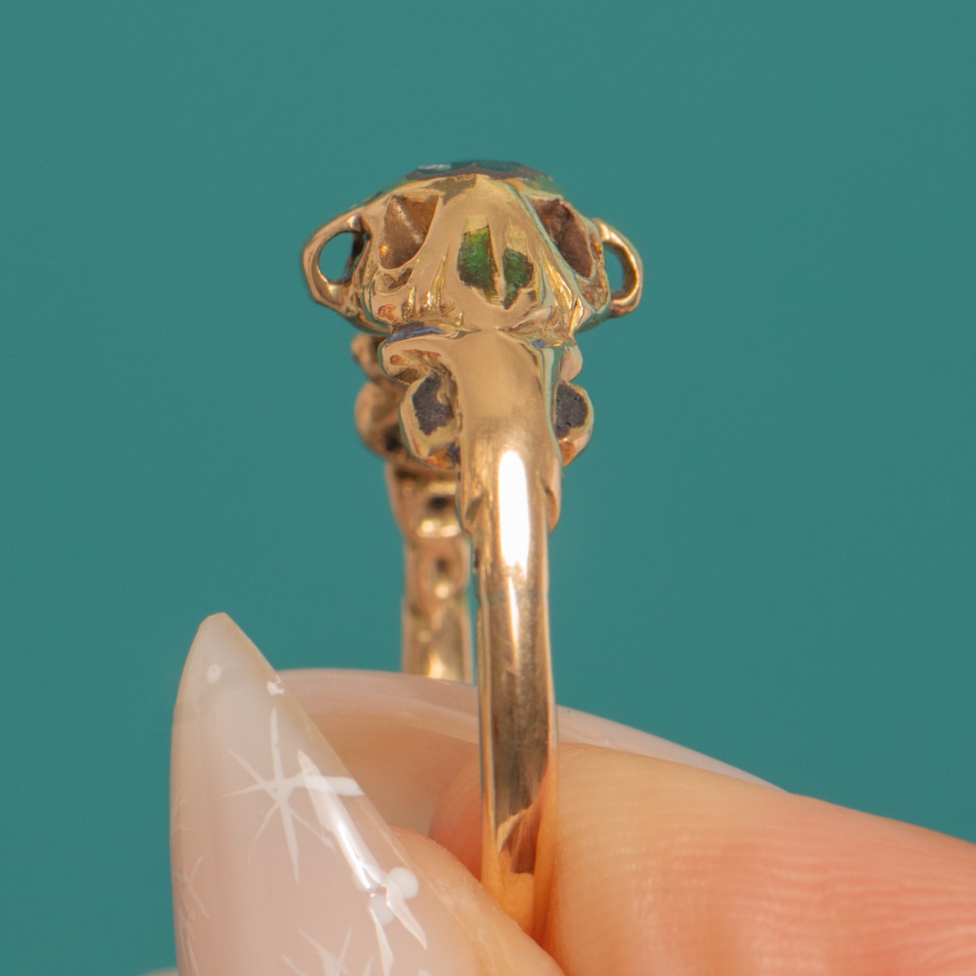 Original Enamel detailing adds an elegant flourish, combining with the Gold and Diamond to create the drama and opulence for which Baroque jewellery is celebrated. Likely of Iberian (Spanish) origin, it’s a wonderfully preserved survivor from the 17th century—refined, romantic and richly characterful on the hand.