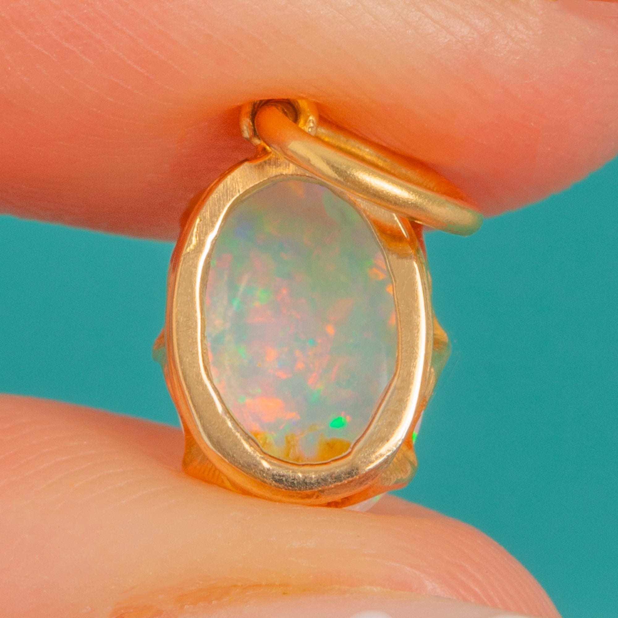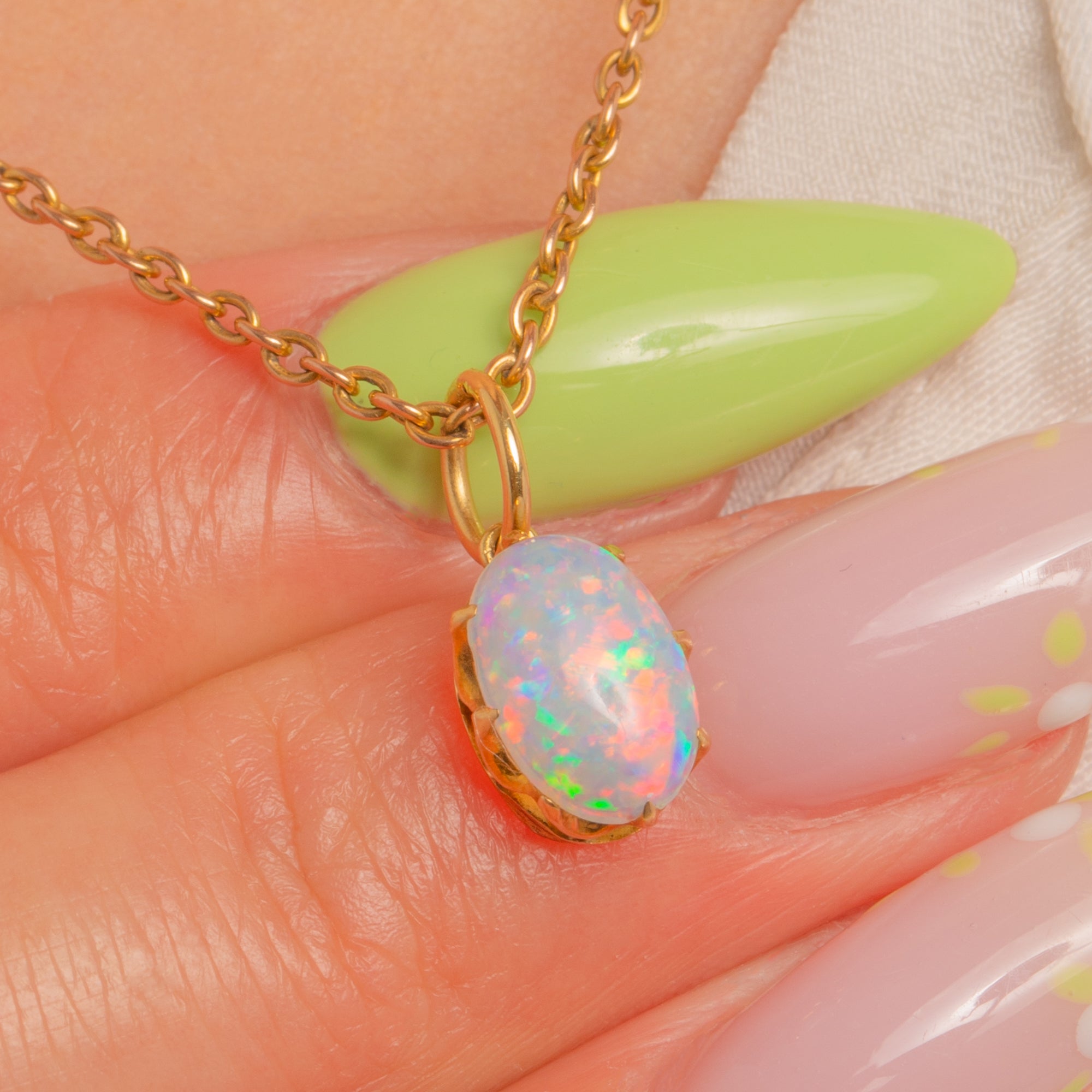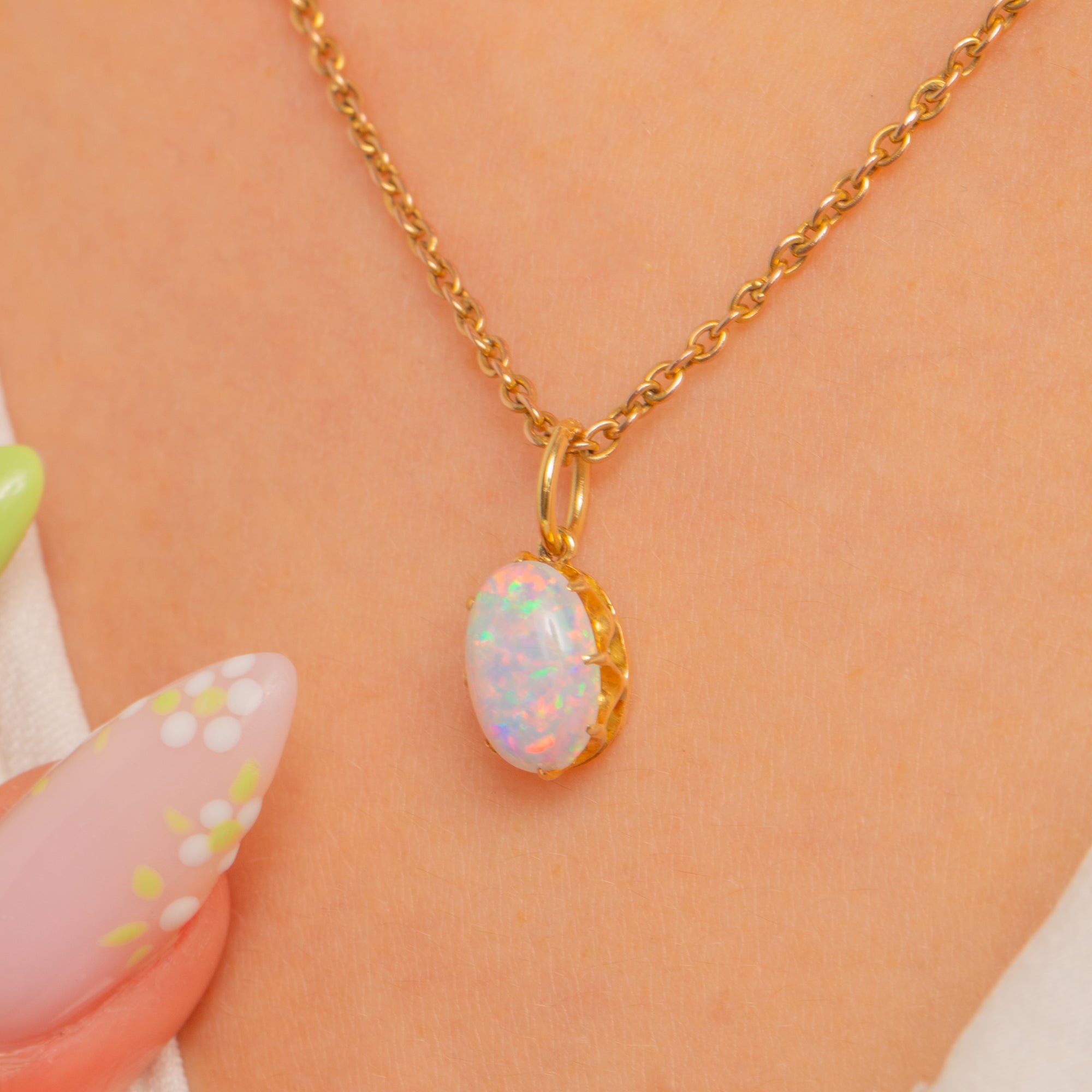 A petite Victorian treasure in glowing 18ct Gold, this charming natural Opal pendant captivates with a lively play-of-colour. The oval cabochon dances with flashes of green, pink, orange, blue and occasional red, its high dome drawing the eye with every movement.