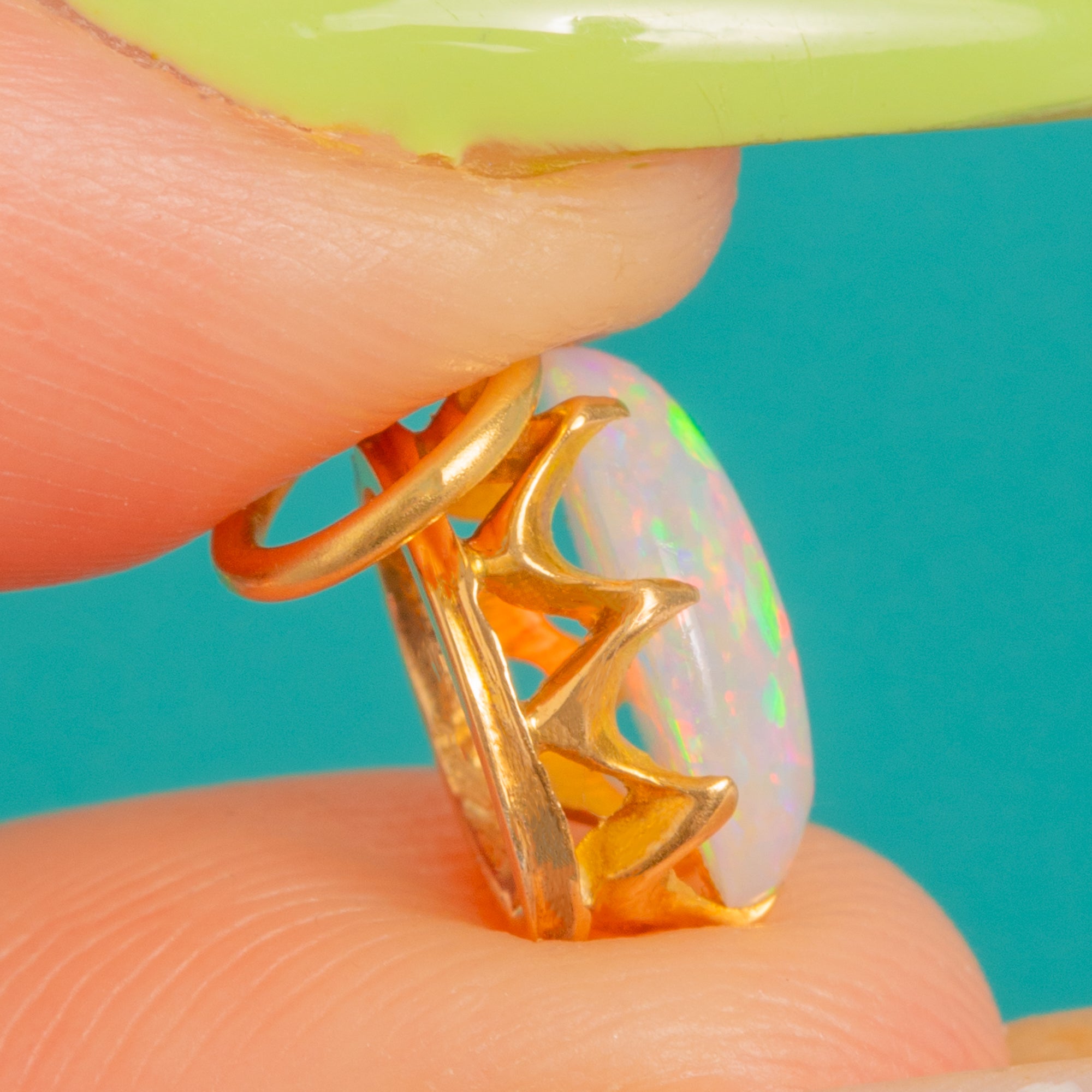 The Opal sits in a refined crown-style open gallery with neat prongs and a simple jump ring, letting the gemstone take centre stage. Understated and elegant, it’s a beautiful touch of antique luminosity that layers effortlessly or shines solo.